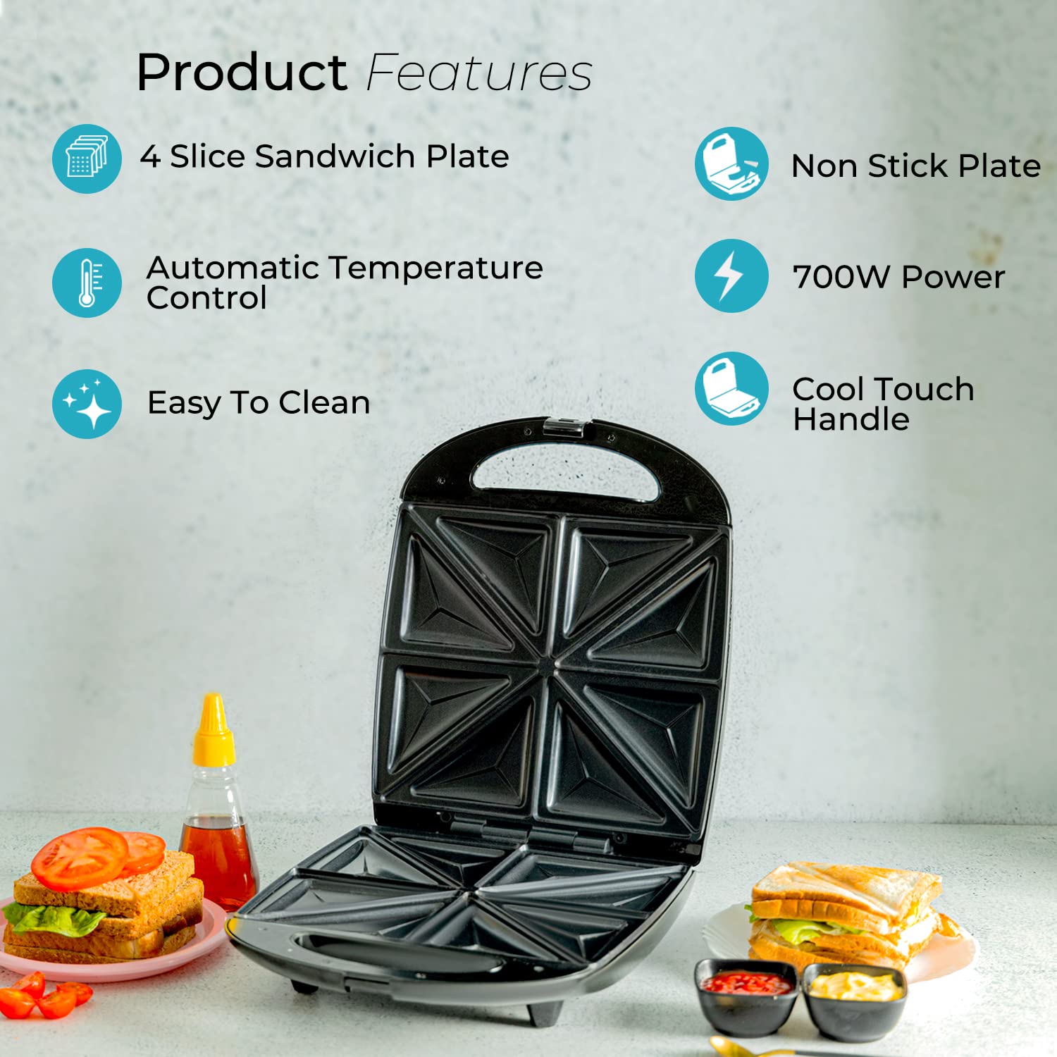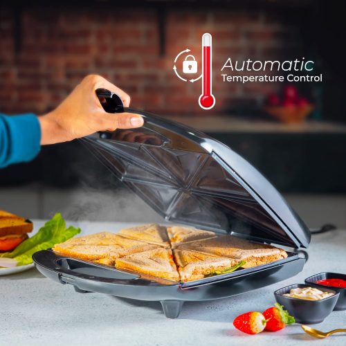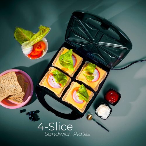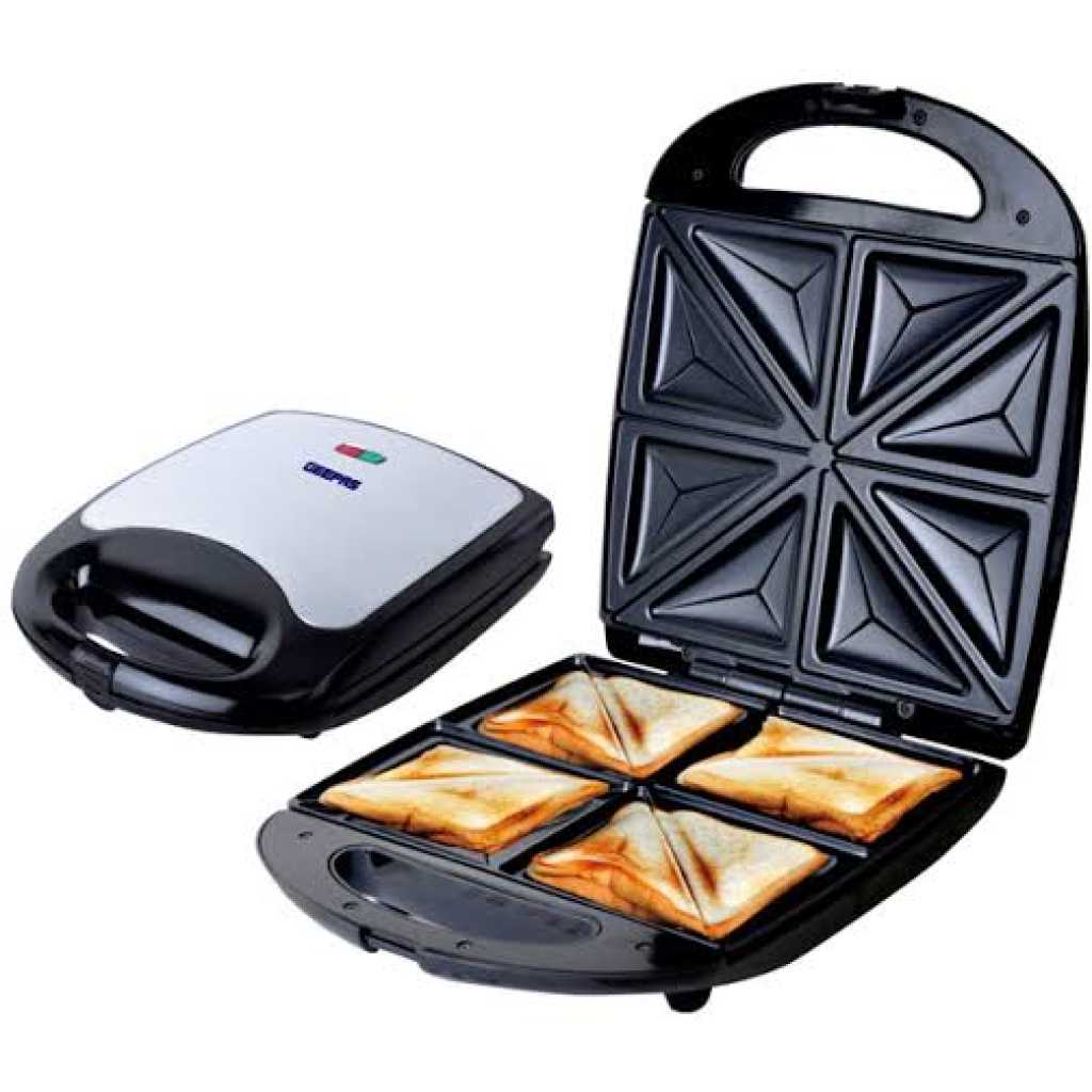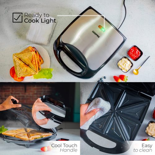 This great value 4 slice toasted sandwich maker from Geepas offers a quick and easy way to make a great snack; this sandwich toaster is an essential in every household. The specially designed plates not only create delicious results, but also create perfectly portioned snacks. With uniquely designed ridges, the sandwich toaster not only heats and toasts ingredients but also cuts and seals the bread and fillings to create two perfectly portioned sandwiches. The deep filled sandwich plates not only allow you to pack even more delicious fillings into your toasties, but also have ample room for thicker slices. Eliminating the messy business of overflowing fillings or under-cooked crusts, the sandwich maker is perfect for those who enjoy a heartier snack. For ease and efficiency, the sandwich toaster boasts two indicator lights showing you when the appliance is in use and when it has reached optimum temperature. And features a Automatic temperature control to save your sandwiches from overcooking or staying undercooked. Geepas Sandwich Maker is going to be there for you for a long time to come. It is a safe, easy to use sandwich maker. You’ll find it to have prolonged and reliable functioning. It is compact and very easy to use making it suitable for use in apartments, hostels, and campers. The design is kept simple yet professional. Key Features: 4-SLICE DEEPER SANDWICH PLATES – The deep filled sandwich plates not only allows you to pack even more delicious fillings into your toasties, but also has ample room for thicker slices. Their shape makes it easy to create a perfect seal, preventing the contents spilling out, to create two perfectly portioned sandwiches. COOL TOUCH HANDLE, INDICATOR LIGHT – This sandwich maker has an insulated handle. It remains cool even during the cooking process and is safe for holding and moving. With the indicator lights, you can know in a glance when your device is working and ready for toasting. AUTOMATIC TEMPERATURE CONTROL – The automatic temperature control feature saves your sandwiches from overcooking or staying under-cooked. It keeps the temperature at a certain limit & maintains the heat required for cooking. The sandwich maker also has non-slip feet to provide safe, easy-to-handle cooking for all the family. NON-STICK COATING PLATE, EASY CLEANING – The sandwich plates are made from the non-stick material. Therefore, no food gets stuck to it. You get intact sandwiches, and it also makes it really easy to clean. Enjoy an attractive stainless steel body and a sleek, compact design that’s easy to store. COMPACT SIZE, WARRANTY- This maker is designed to stand in an upright position; therefore, it only takes a corner to fit in and does not clutter your kitchen counter. Comes with 2 Year Manufacturer Warranty