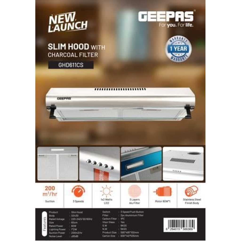 Geepas Slim Hood with Charcoal Filter- GHD611CS/ Sleek and Stylish Design, Powerful Suction, and Adjustable Speed Setting, Perfect for Kitchen, Apartment, etc., Stainless Steel Body, 1 Year Warranty SLEEK AND STYLISH DESIGN: The Geepas Hood has a slim design and stainless steel SS430 body that seamlessly blend into any kitchen décor. POWERFUL SUCTION: With a 200 m3/hour suction power, the hood efficiently removes smoke and odors and ensures a clean and healthy cooking environment. ADJUSTABLE SPEED SETTING: The hood has three speed settings, which allow you to customize the ventilation power. In addition, it also has a 2W LED light to provide better illumination while cooking. ADVANCED FILTRATION SYSTEM: The hood has 3-layer aluminum filtration that captures particles, and the charcoal filter further enhances filtration. HIGH PERFORMANCE MOTOR: With an 80-watt motor, the hood delivers exceptional performance and a noise level of ≤65 dB. A perfect blend of sleek design and performance. Geepas offers you a slim hood with a charcoal filter designed to elevate your kitchen experience. Made from the finest quality material with a stainless steel body and a 3-layer aluminum filter with a charcoal filter, the hood ensures effective removal of smoke and odors for a clean and fresh cooking environment. The hood has a slim design that perfectly blends with your kitchen dcor. The hood’s suction capability of 200 m3/hour efficiently eliminates smoke and aromas, ensuring a clean and healthy cooking environment. The hood’s three-speed control ensures optimal performance and proper ventilation. To adjust the speed, simply push the desired speed. The 1×2 watt light provides ample illumination while cooking for clear visibility and aesthetics. The hood contains 3-layer aluminum filtration that collects particles, and the charcoal filter improves filtering even more. The hood’s 80-watt motor provides great performance and a noise level of 65 dB. The slim hood measures only 595x495x100 mm and weighs 5.0 kg. Plus, it comes with a 1-year manufacturer’s warranty.