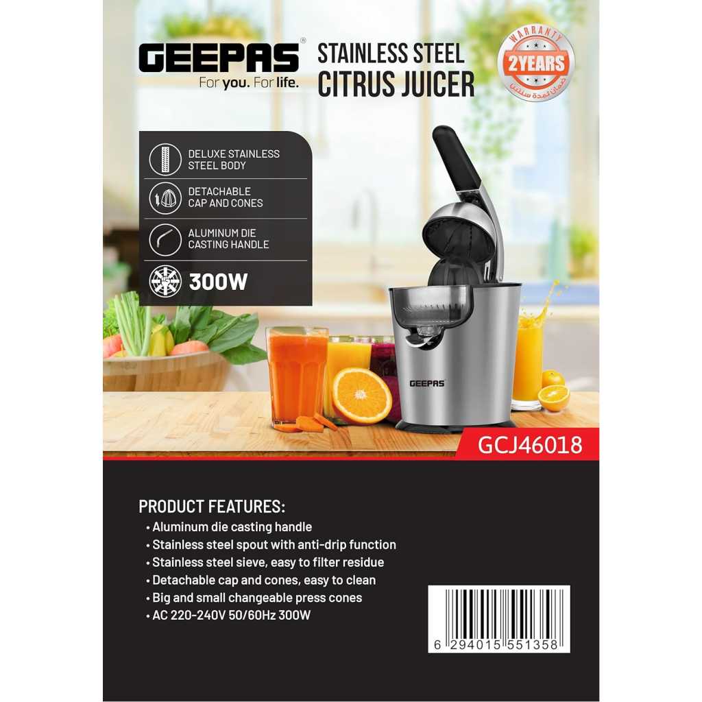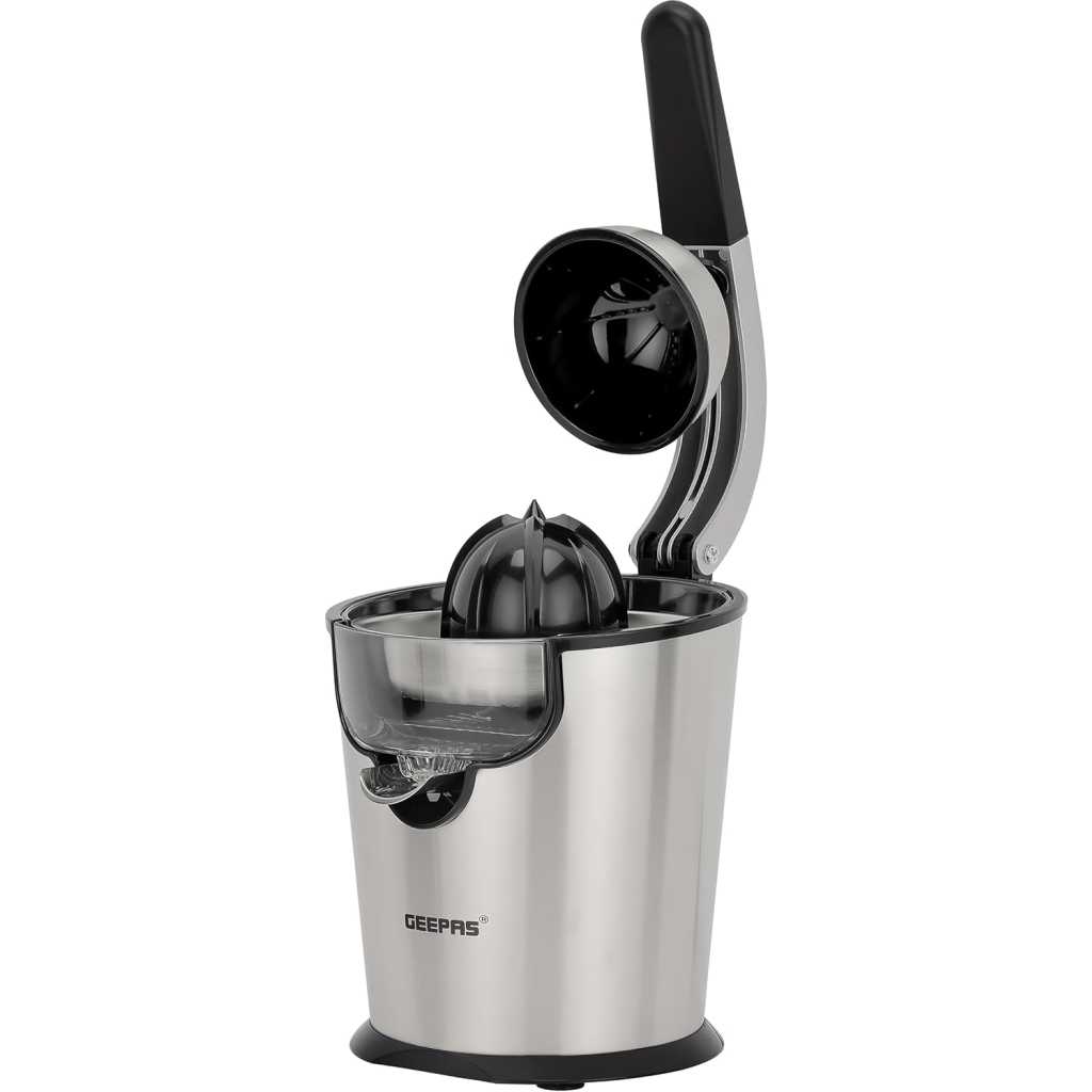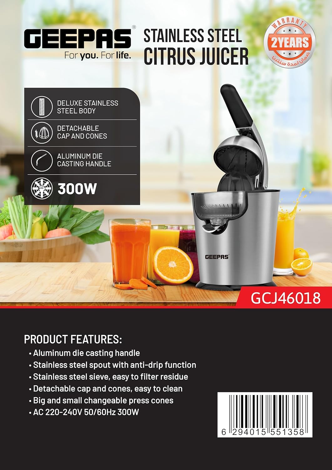 Experience the joy of freshly squeezed juice every day. Using the Geepas stainless steel citrus juicer, you can easily extract pure juice from fruits at home. With its compact design and elegant color, this product complements any kitchen countertop. Crafted from premium-quality materials, this citrus juicer features a deluxe stainless steel housing and an aluminum die-cast handle that provides a sturdy and safe grip while using. It has been designed to be strong and sturdy, with a 300W motor. It is a must-have in any kitchen to extract every last drop of juice from oranges, lemons, limes, etc. Because of the interchangeable big and small cones, juices from a variety of fruits can be easily extracted. This juicer features a stainless steel sieve that separates pulp from the juice. This not only makes your task easier but also saves energy and time. It is easy to collect juice in the jar. The stainless steel pouring spout with an anti-drip function makes it convenient to transfer the extracted contents. This juicer is a convenient alternative to a manual juicer as it relieves the strain on your hands while squeezing. The citrus juicer comes with detachable caps and cones and is very easy to clean, use, and store. The simple and modern design, combined with its utility features, makes it an excellent choice for your home. The Geepas juicer weighs 2.4 kg and comes with a 2-year manufacturer’s warranty.