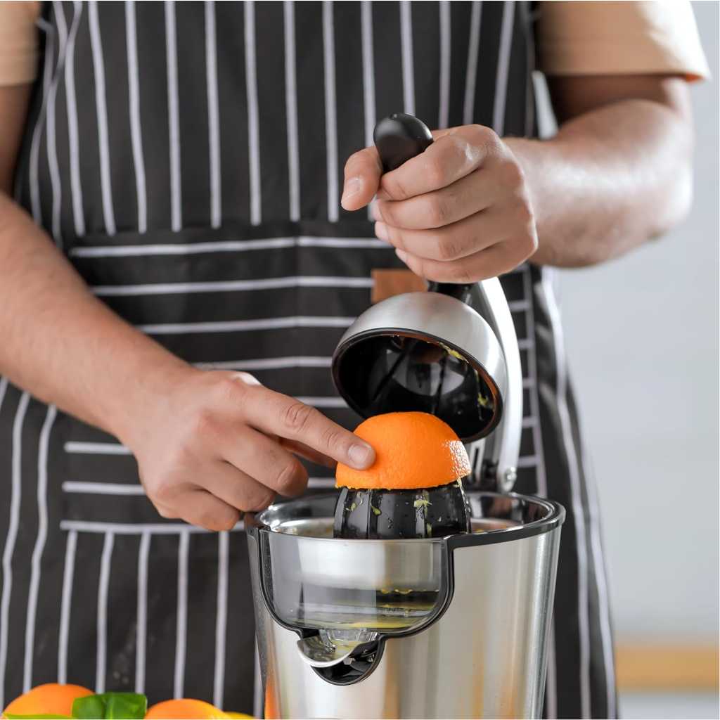 Key Features: STAINLESS STEEL HOUSING: The juicer has a deluxe stainless steel body, a stainless steel pouring spout, and a stainless steel sieve that allows you to extract juices with ease. 2 CONES: This juicer comes with 2 changeable cones: a big and a small, ideal for large and small citrus fruits. The juices are then easily collected into the containers or directly into a glass through the practical spout opening. ANTI-DRIP FUNCTION: The anti-drip function prevents any spills on the citrus juicer and kitchen, so you do not need to clean after working with this electric lemon squeezer. ALUMINUM DIE-CAST HANDLE: Crafted from an aluminum die-cast handle with a stainless-steel housing, this modern and stylish kitchen appliance will suit any kitchen. With the 300W motor power, you’ll be able to create delicious, summery flavors quickly and with much less effort than manual juicing. DETACHABLE PARTS: This device is very easy to assemble and take apart, so cleaning it is effortless and quick. Quiet and super-efficient.