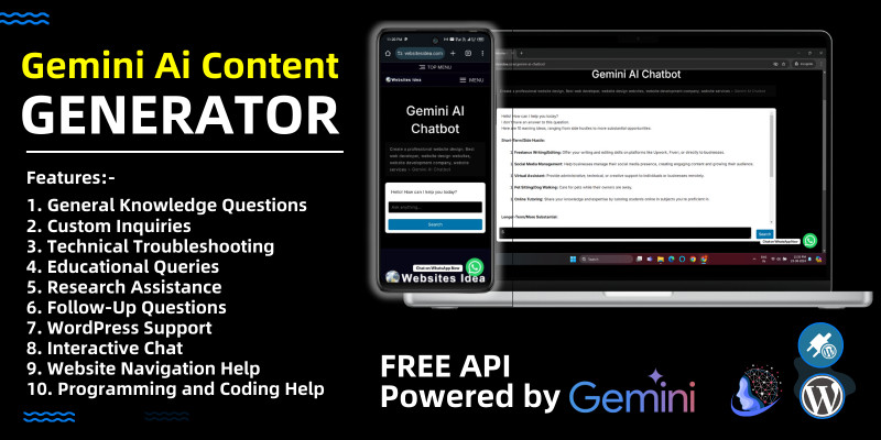Gemini AI Chatbot Plugin for WordPress. Enhance WordPress site with an Gemini AI Content Generator, providing dynamic and responsive user interactions.