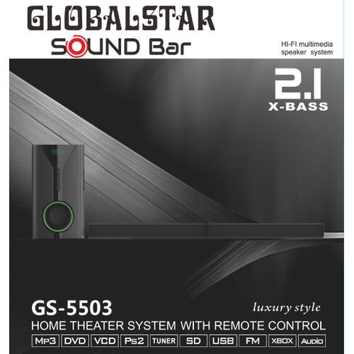 Global Star Sound Bar System 2.1 Channel GS-5503 Hifi Enabled – Black. Features Brand Name : GlobalStar Model Number : GS-5503 Input sensitivity:=70dB Voltage :AC:90V- 260V DC:12V 50/60HZ Channels : (2.1) Material : Wooden & Plastic Output Power : 40W+15W*4 Speaker Unit : 5.25″x1+2″ x4