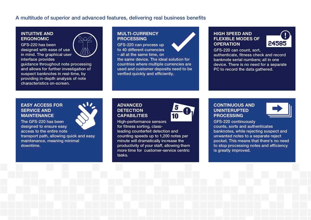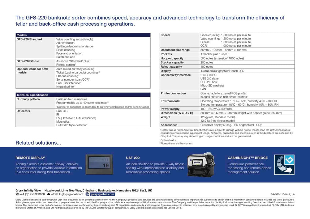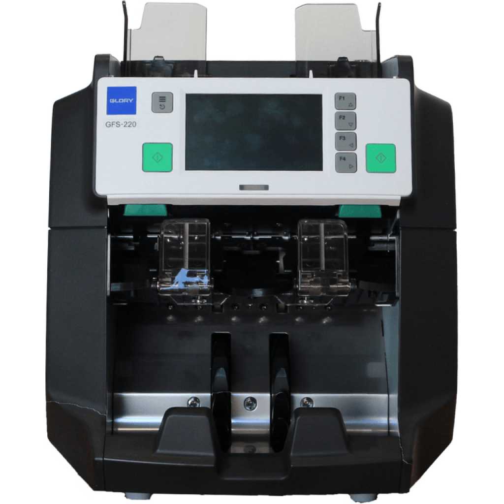 Glory GFS-220 Series – Banknote Counter And Sorter, Bank Bill Counter – Black. The Glory GFS220 is a dual pocket note counting machine and banknote sorter. The second pocket can be used to sort the notes or reject poor quality, damaged, and forged notes. The Glory GFS220 is designed to be a robust note counting machine for high volume environments. SUPER EFFICIENT Efficiency savings and reduced cash processing costs remain critical business drivers and key performance indicators for most cash handling organisations today, whether a bank branch, cash centre, foreign exchange bureau, retailer or casino. Glory’s GFS-220 banknote counter improves operational efficiency with superior speed, fitness analysis, and authentication. Multi-currency value count, detailed counterfeit analysis, and optical character recognition are all available features. Local presentation of banknote information on a large touchscreen display, plus remote access for data capture and system update provides an enterprise-ready solution. Designed for organisations looking to deploy an affordable yet powerful sorting solution, the GFS-220 can revolutionise desktop cash handling in small, medium, and large cash processing environments. Processes that were once only achievable on large sorting systems are now possible in front line tasks. ADVANCED FUNCTIONALITY The GFS-220 counts, sorts, does counterfeit checks and records serial numbers at high speed – a versatile machine at a single price. The enhanced GFS-220 also provides banknote fitness checking to help you comply with compliance requirements. Counterfeit checks include infrared (IR), Ultraviolet (UV), Magnetic (MG), Thickness Detection, and Dual CIS (Contact Image Sensor). The OCR image capture technology allows the GFS-220 to read and record the banknote serial numbers, which allows you to generate a comprehensive and historical report of processed banknotes in both text and image format to improve the security and accountability of each transaction. Data is extracted into CSV / Microsoft Excel format, which can be saved onto a USB memory stick. The multi-pocket design allows counts to proceed continuously, with rejected notes placed into the reject pocket while the machine continues counting. Avansa’s note countings solutions are trusted across Southern Africa, including South Africa, Namibia, Botswana, Zimbabwe, Mozambique, Eswatini, Lesotho, Angola, Zambia, and Malawi. Businesses in these regions face unique security challenges, and our robust anti-bandit and bulletproof doors provide reliable protection against threats, ensuring safety for both employees and assets. FEATURES Manual or Auto Start Customer set batch count facility Add feature allowing for consecutive cumulative counts Counts 1,200 notes per min Counts all Polymer banknotes Size detection Dual pocket Dual operator mode Easy access design for clearing jams Auto currency selection SPECIFICATIONS Hopper: 500 notes (extension 1000 notes) Stacker: 200 notes Reject: 100 notes DIMENSIONS: 303mm × 347mm × 316mm (height with hopper guide: 362mm) Piece counting: 1,300 notes per minute Value counting: 1,200 notes per minute Fitness: 1,000 notes per minute OCR: 1,000 notes per minute