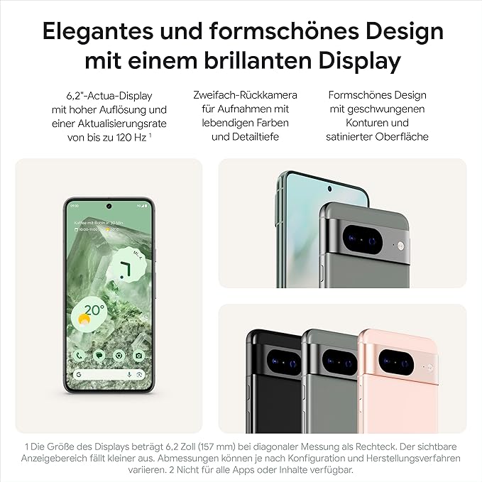Google Pixel 8 8GB 128GB 5G, Google AI, 50MP Crystal Clear Camera, Super Battery, 6.2 Inch AMOLED Display Screen The fully upgraded Pixel 8 camera uses Google AI to help you create memorable photos and videos, day or night. The Pixel Camera records smooth videos with stunning resolution and clear audio, even in crowded, dimly lit places. Built with Google AI, Pixel 8 makes it even easier to screen calls, connect in new languages, and more.