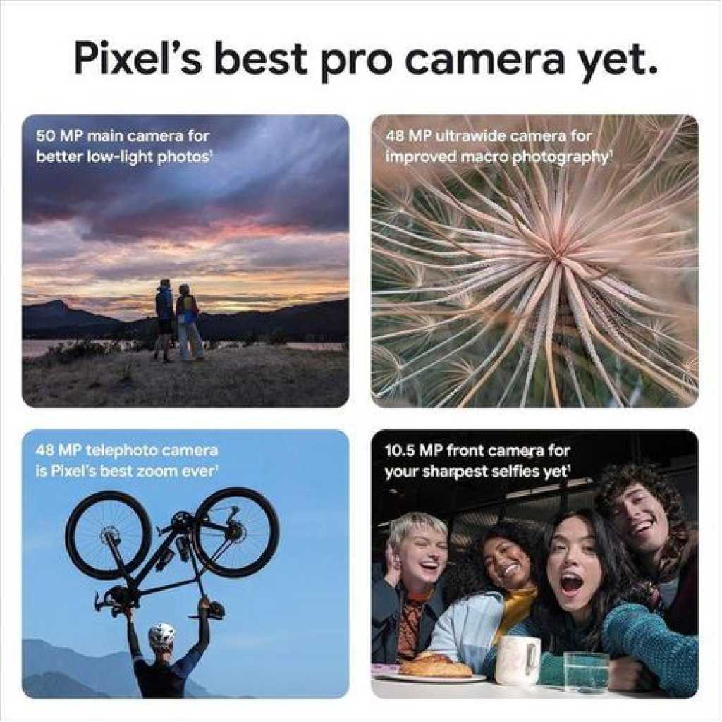 Using Google AI, Pixel makes it easy to create amazing photos and videos, manage daily to-dos, and keep your info safe. Using Google AI, Pixel makes it easy to create amazing photos and videos, manage daily to-dos, and keep your info safe. Advanced camera features like Macro Focus and Real Tone help you take beautiful photos and videos in any light. Using Google AI, Photo Unblur and Magic Eraser make it easy to remove blur and distractions.15 Seamlessly transfer your contacts, photos, messages, and more. It comes with all your favorite Google apps. Plus, Pixel works well with compatible devices, even ones from another brand. Google Fi Wireless makes it easy for families to stay connected with 4G LTE, nationwide 5G for supported phones, hotspot tethering, and more. Key Features: NETWORK Technology: GSM / HSPA / LTE / 5G SIM: Nano-SIM and eSIM Size: 6.7 inches, 108.7 cm2 (~87.4% screen-to-body ratio) PLATFORM: OS Android 14 Internal: 256GB 12GB RAM MAIN CAMERA: Triple 50 MP WLAN Wi-Fi 802.11 a/b/g/n/ac/6e/7, tri-band, Wi-Fi Direct Bluetooth: 5.3, A2DP, LE, aptX HD USB: USB Type-C 3.2 BATTERY Type: Li-Ion 5050 mAh, non-removable