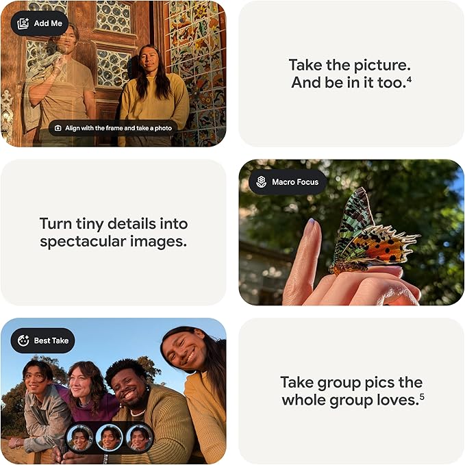 Google Pixel 9a 12GB RAM 128GB Gemini Android Smartphone with Incredible Camera and AI Photo Editing, All-Day Battery, and Powerful Security Google Pixel 9a is engineered by Google with more than you expect, for less than you think; like Gemini, your built-in AI assistant, the incredible Pixel Camera, and an all-day battery and durable design Take amazing photos and videos with the Pixel Camera, and make them better than you can imagine with Google AI; get great group photos with Add Me and Best Take; and use Macro Focus for spectacular images of tiny details like raindrops and flowers Google Pixel’s Adaptive Battery can last over 30 hours; turn on Extreme Battery Saver and it can last up to 100 hours, so your phone has power when you need it most Get more info quickly with Gemini; instead of typing, use Gemini Live; it follows along even if you change the topic; and save time by asking Gemini to find info across your Google apps, like Maps, Calendar, Gmail, and YouTube Music Pixel 9a can handle spills, dust, drops, and dings; and with IP68 water and dust protection and a scratch-resistant display, it’s the most durable Pixel A-Series phone yet Unlocked Android 5G smartphone gives you the flexibility to change carriers and choose your own data plan; it works with Google Fi, Verizon, T-Mobile, AT&T, and other major carriers Google Pixel 9a comes with 7 years of OS and security updates, and new and upgraded features with Pixel Drops, so it keeps getting better and more secure over time With Pixel Call Assist, you can hear callers more clearly, avoid unwanted calls, speed through call menus, and more If theft is detected, Pixel automatically locks to keep your info safe; it can also detect a car crash and call for help, connect you with emergency services, and help prevent scams, phishing, and malware Please refer to the Legal section below for all applicable legal disclaimers denoted by the bracketed numbers in the preceding bullet points
