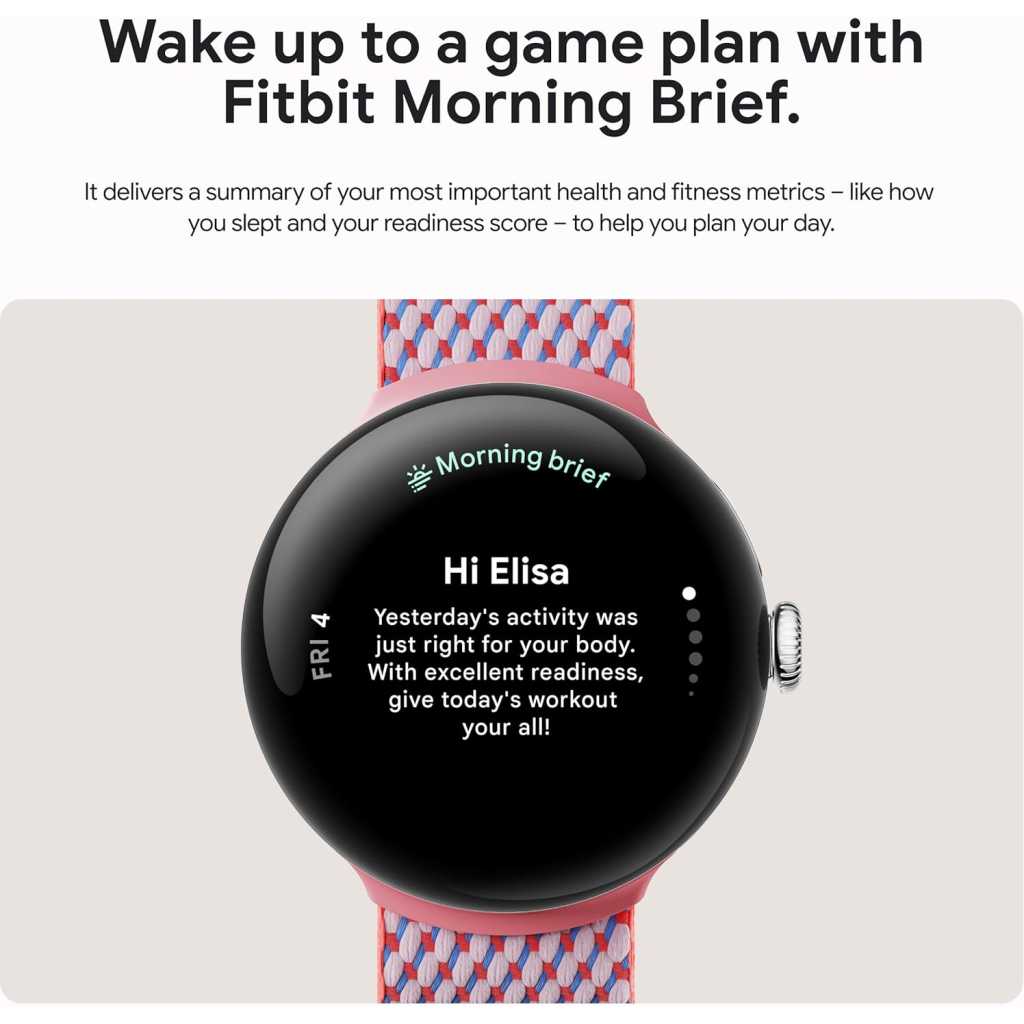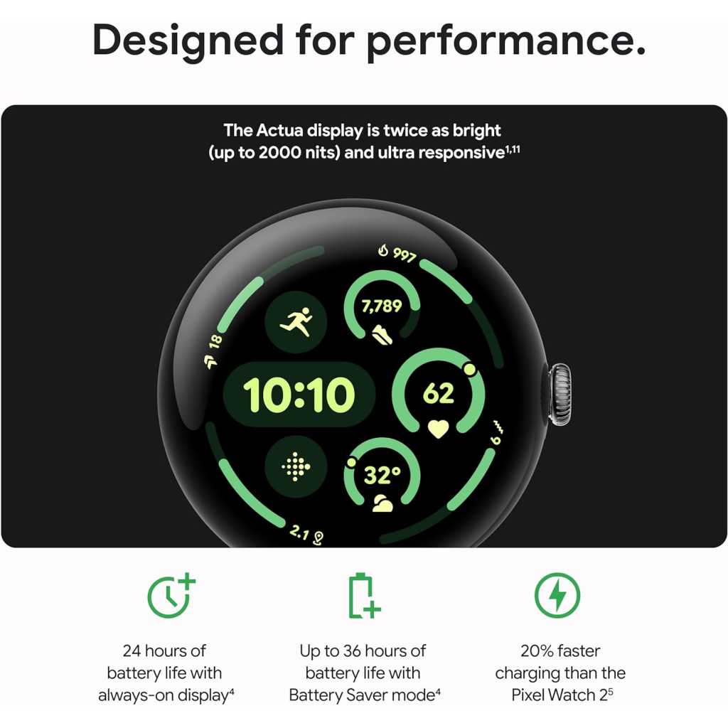 Key Features: The Google Pixel Watch 3 is designed for performance, with advanced fitness from Fitbit[1,2]; the 41mm screen is twice as bright and 10% larger than before, making it easier to see your stats and info[1] Maximize your performance with advanced running features; build custom run workouts and get real-time guidance and advanced form tracking[3] Enhance your run routine with Fitbit Premium; Google AI uses your goals, past runs, and readiness to power personalized run recommendations[3] Know what your body is ready for each day with readiness; it uses sleep, resting heart rate, and heart rate variability to show if you’re ready to take on a workout or prioritize recovery[3] Cardio load measures how hard your heart works so you can see how hard you’ve pushed; compare trends to see if you’re under- or over-training[3]; and receive a daily target based on cardio load and readiness levels