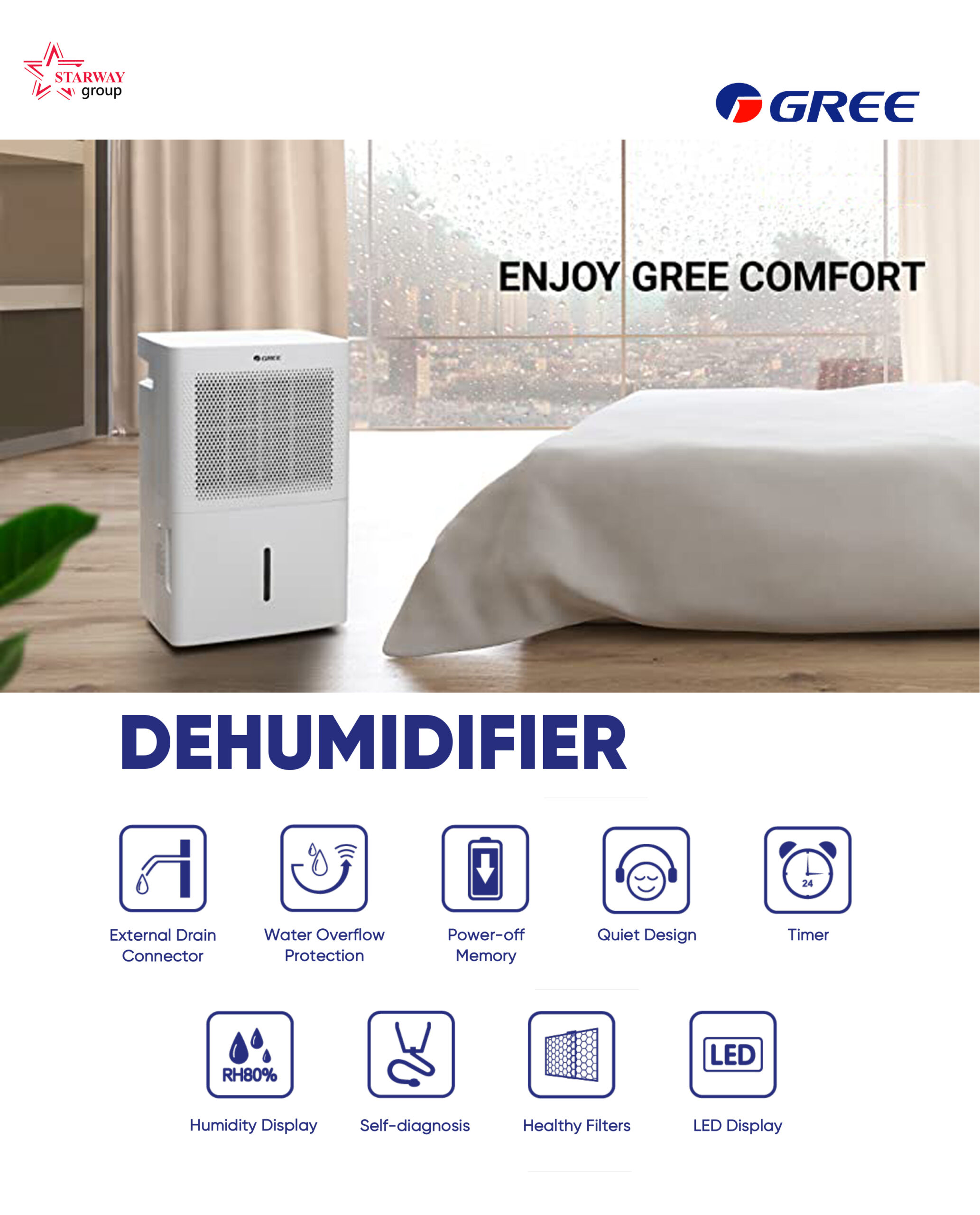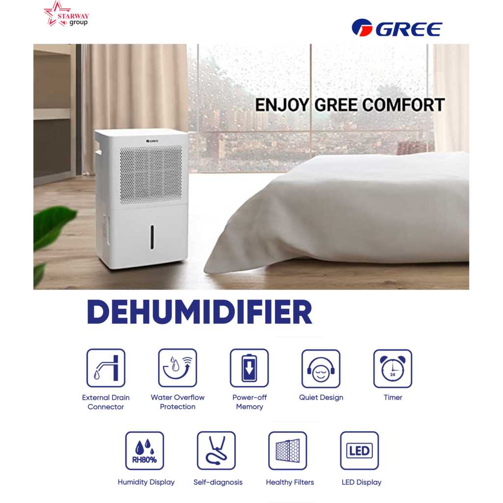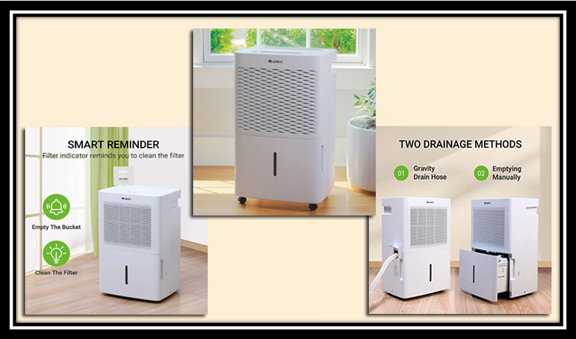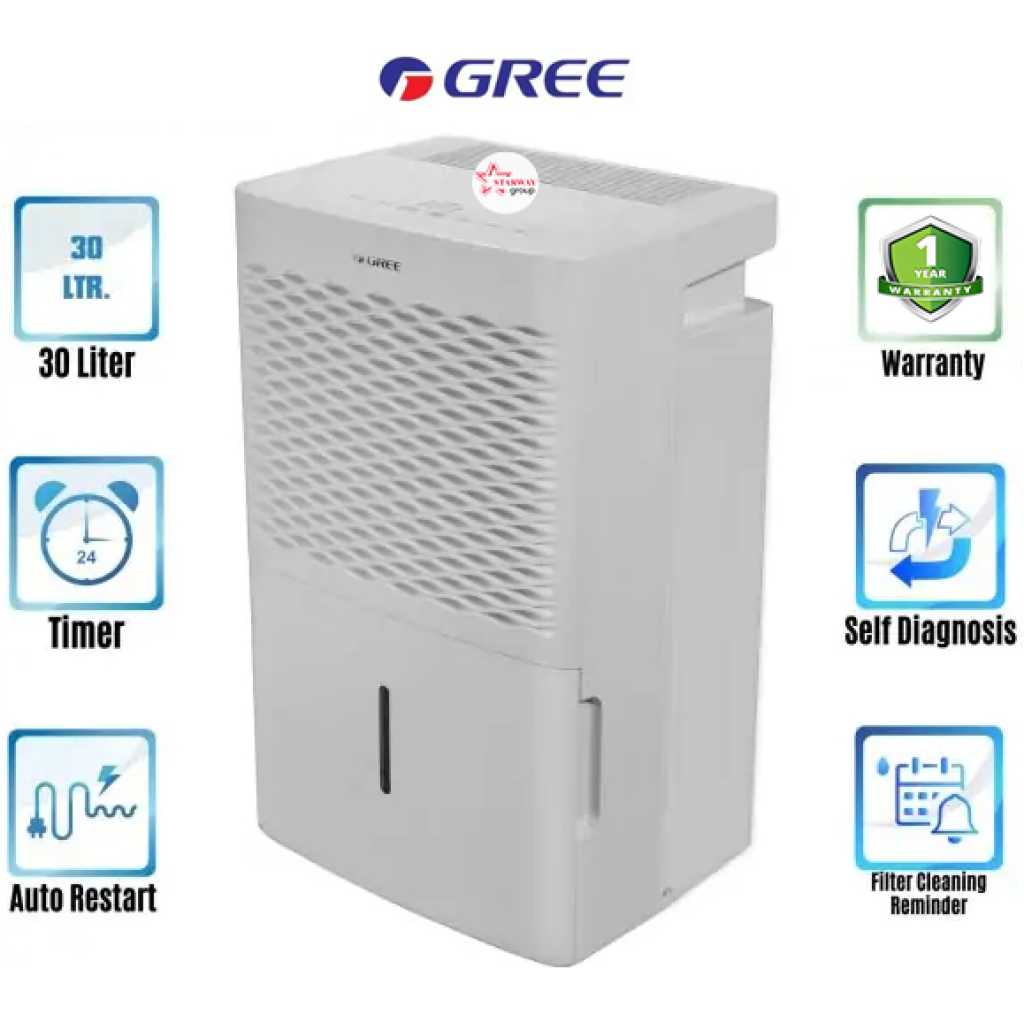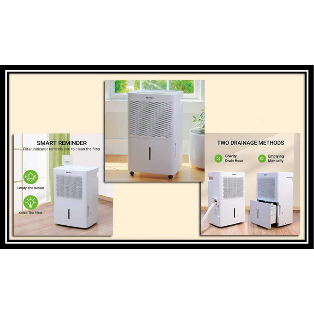 GD-30NL || Gree Brand Dehumidifier 30 Liter. GD-30NL || Gree Brand Dehumidifier 30 Liter in Bangladesh. Capacity: 30 Liter/Day Model: GD-30NL Country of Origin: China. Exclusive Warranty (GD-30NL): 01 Yr/12 Months from the date of supply. Technical Specifications (GD-30NL): Moisture Removal: 30 L/Day. Rated Dehumidification Capacity: 0.85/1.35 L/h. Power Supply: 220-240V/50Hz/1Ph. Power Input: 410/435/530/650 Watt. Operating Current: 1.9 A. Air Flow Volume: 155/220 m3/h. Fan Type: Centrifugal. Water Tank Volume: 4.8 L. Noise Level: 42/44 dB(A). Dimension (WxHxD): 348x555x270 mm. Applicable Room Size: 2500-3000 Cft. Refrigerant: R-410Aa (0.18 Kg). Weight: 16.5 Kg. Climate Type: T1. Moisture Protection: IPX0. Control Type: Electronic. Other Functions: Removable Bucket-Yes, External Drain Connector-Yes, Easy Roll Casters-Yes, Water Full Indicator-Yes, Memory-Yes, Memory-Yes, Timer Feature-Yes, Automatic Defrost-Yes, Real-time display of ambient Humidity-Yes, Tank Filled Protection-Yes, Self-Diagnosis-Yes. Special Features (GD-30NL): There are several types of dehumidifiers available for Residential, Commercial & Industrial Purposes. It reduces humidity levels, making your home less hospitable to allergens such as dust mites, mold, and mildew. They are not disruptive to your daily life and run quietly and efficiently in the background without most people even noticing. Dehumidifiers help reduce odors that can accompany mold and mildew in your home getting rid of that “musty” or “rotting” smell. These devices help to reduce the possibility that you will develop mold on your clothing, furniture, and other linens (such as curtains or bedsheets). Dehumidifiers reduce irritation to your skin and your respiratory system, allowing you to breathe easier and feel comfortable in your home. A less humid environment in your home means clothing will dry faster, bread and cereals will remain fresh longer without getting stale, and you won’t find signs of rust or corrosion on things like computer equipment, electronics, and tools. Running a dehumidifier helps reduce dust in your home, so you won’t have to clean as often. A dehumidifier also lowers energy costs because it helps your air conditioner run more efficiently.
