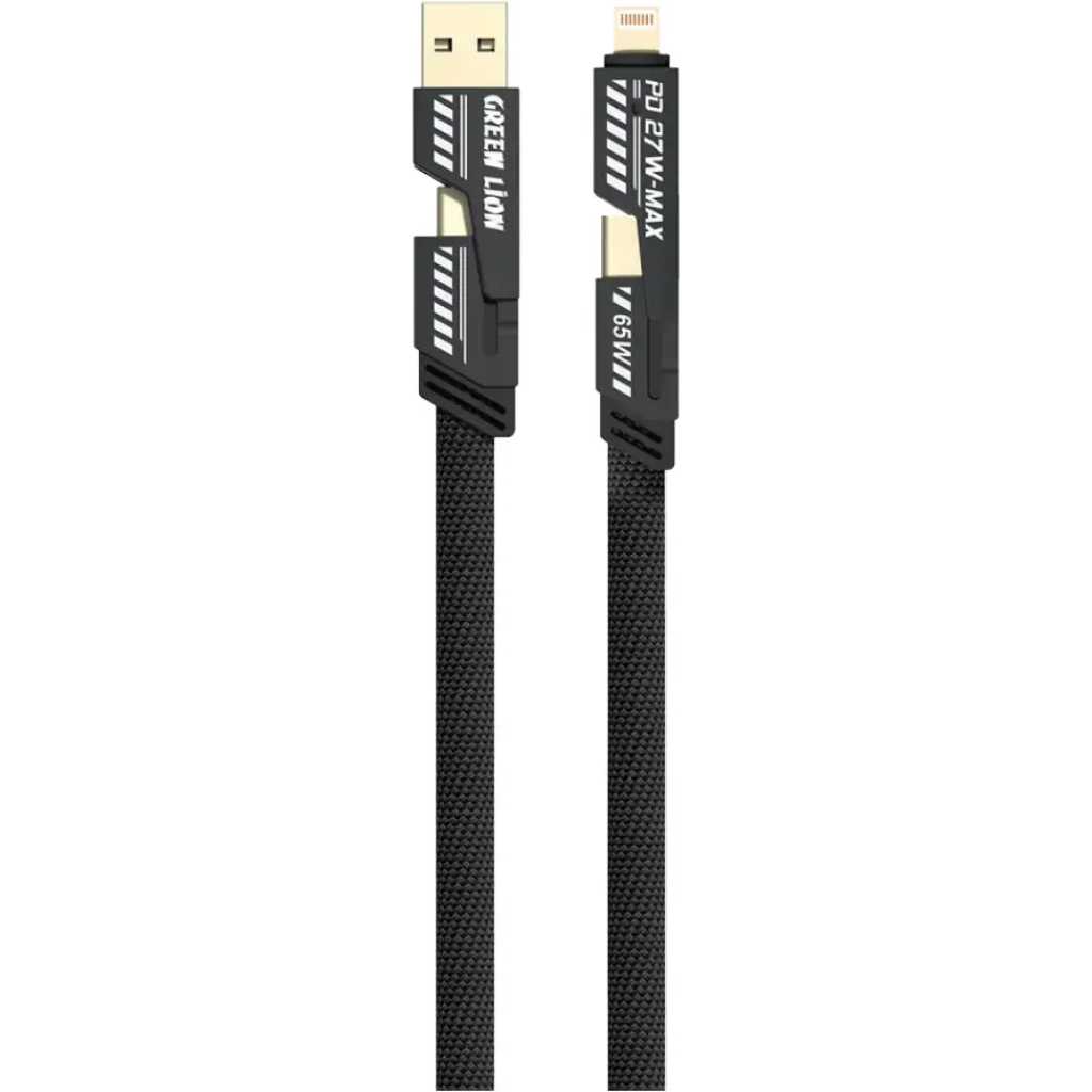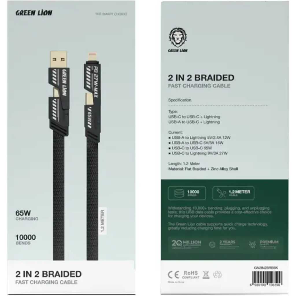 The Green Lion 2 in 2 Braided Cable-1.2m 65W, C to C+L and A to C+L: It is a flexible and high-performance charging solution for fast charging and data transfer, supporting multiple connections with USB-C to USB-C + Lightning and USB-A to USB-C + Lightning compatibility. The 65W output will provide quick charging for most devices, while the transfer speed of 480 Mbps does its job for data synchronization. This product is equipped with a flat braid cable and zinc alloy shell; it is durable, anti-tangle, safe, and secure for broad compatibility, making it one of the most essential daily-use accessories. Key Features: Type: -USB-C to USB-C + Lightning