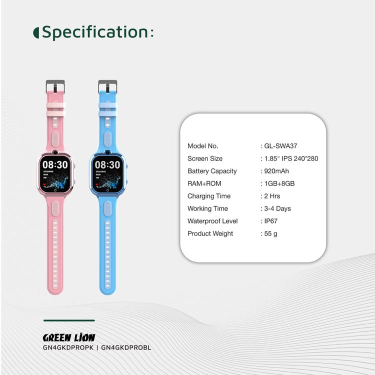 The Green Lion Kids 1.85″ Smart Watch is a full-featured device meant to keep children connected and safe. It guarantees that parents are always aware of their child’s location thanks to its GPS tracking and exact positioning features. For peace of mind, the smartwatch offers plenty of communication options, including voice chat , video calls , and SOS calling . Kids can use its HD camera to record entertaining moments or make visual connections during video conversations. The watch is dependable for daily use. Its 920mAh battery gives 3-4 days of work time and 5-7 days of standby . With a 240×280 resolution , its 1.85-inch IPS display provides a bright and clean user interface. The 1GB RAM and 8GB ROM provide fast performance and plenty of storage for apps and media. The smartwatch is for active kids. It’s IP67 waterproof . It can resist splashes and light water exposure. 4G VoLTE is also supported for dependable and quick connectivity. With a 2-hour charge time , the Green Lion Kids 1.85″ Smart Watch is prepared to keep up with kids’ everyday activities while maintaining constant communication and safety.