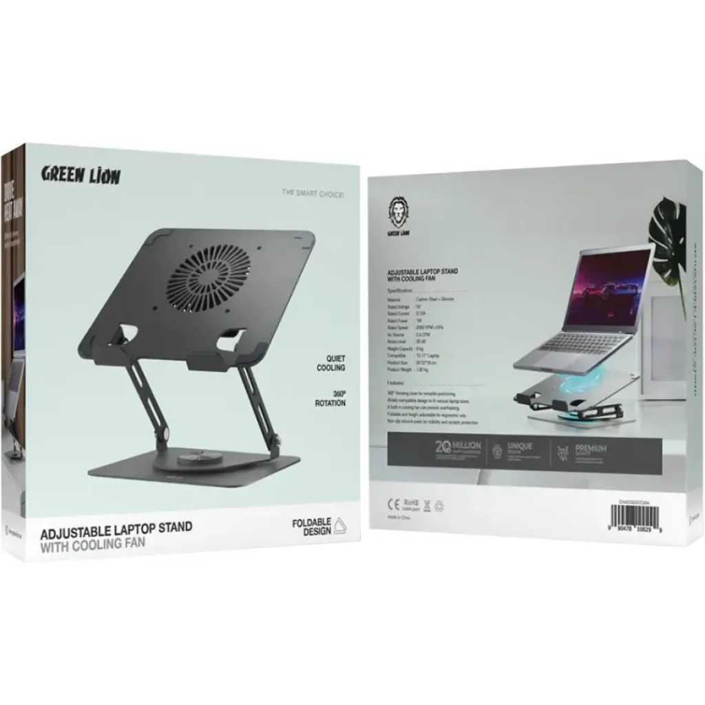 The Black Green Lion Adjustable Laptop Stand with Cooling Fan is better for comfort and efficiency. Made of carbon steel and silicone, it is highly stable and durable and easily holds laptops from 13″ to 17″. The integrated cooling fan works at 2000 RPM ±10% and provides optimal cooling airflow of 2.6 CFM air volume to avoid overheating. The design permits full 360° rotation, thus allowing freedom of adjustment for an ergonomically friendly setup. It boosts productivity and convenience with its foldable, non-slip silicone base and easy handling. The Green Lion Adjustable Laptop Stand is perfect for home, office, and travel and provides seamless and relaxing laptop use. Specification Material: Carbon Steel + Silicone Rated Voltage: 5V Rated Current: 0.12A Rated Power: 1W Rated Speed: 2000 RPM ±10% Air Volume: 2.6 CFM Noise Level: 30 dB Weight Capacity: 8 kg Compatible: 13″-17″ Laptop Features 360° Rotation Metal Material Cooling Fan Easy to Use Non Slip Silicone Foldable Design Key Features: 360° Rotation Metal Material Cooling Fan Easy to Use Non Slip Silicone Foldable Design