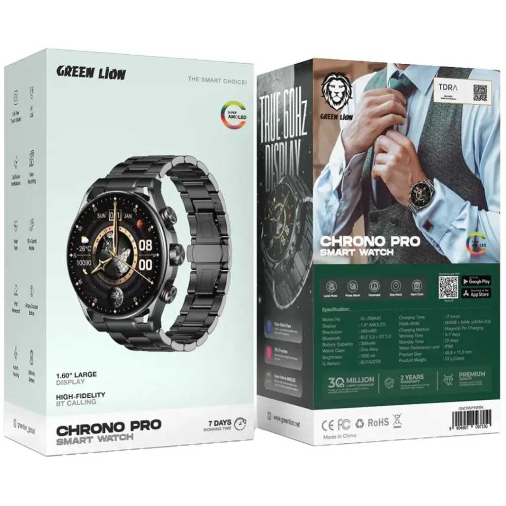 GREEN LION Chrono Pro Smart Watch with AMOLED Display and Hight-Fidelity BT Calling / 7 Days Working Time / Full-View Touch Display / Voice Recording / 100+ Sports Modes / Rotary Encoder Button / Pedo