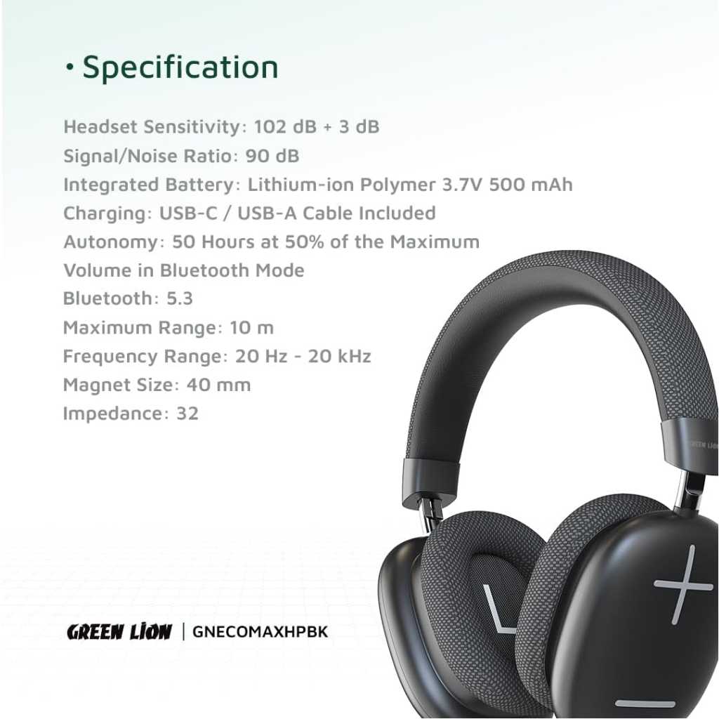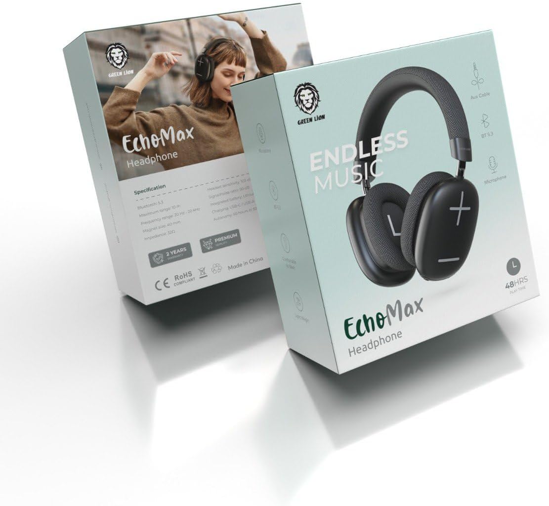 With the Green Lion’s Echo Max Headphone, you will experience an amazing sound you never had. It’s equipped with a 500mAh integrated battery and easily lasts for 50 hours of use at 50% of the maximum volume in Bluetooth mode. There’s a Type-C to Type-A cable for charging and you have an AUX cable in case you’re running out of the battery. Also, it’s totally comfortable to wear due to its light weight. Specification Bluetooth: 5.3 Maximum range: 10 m Frequency range: 20 Hz – 20 kHz Magnet size: 40 mm Impedance: 32Ω Headset sensitivity: 102 dB + 3 dB Signal/noise ratio: 90 dB Integrated battery: Lithium-ion polymer 3.7V 500 mAh Charging: USB-C / USB-A cable included Autonomy: 50 hours at 50% of the maximum volume in Bluetooth mode SKU: GNECOMAXHPBK | GNECOMAXHPWH | GNECOMAXHPBL EAN: 6935100182728 | 6935100182704 | 6935100182711 Features Aux Cable Microphone Comfortable To Wear Light Weight