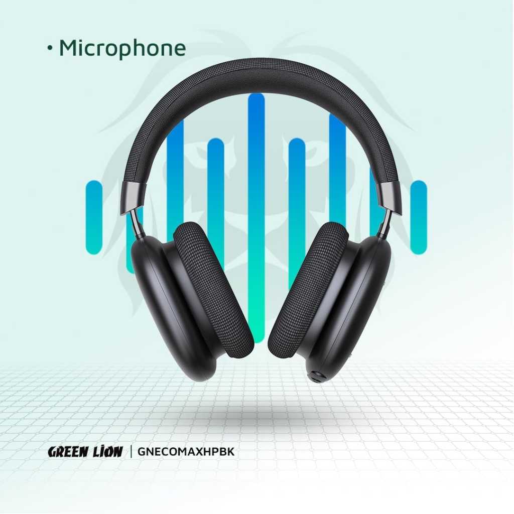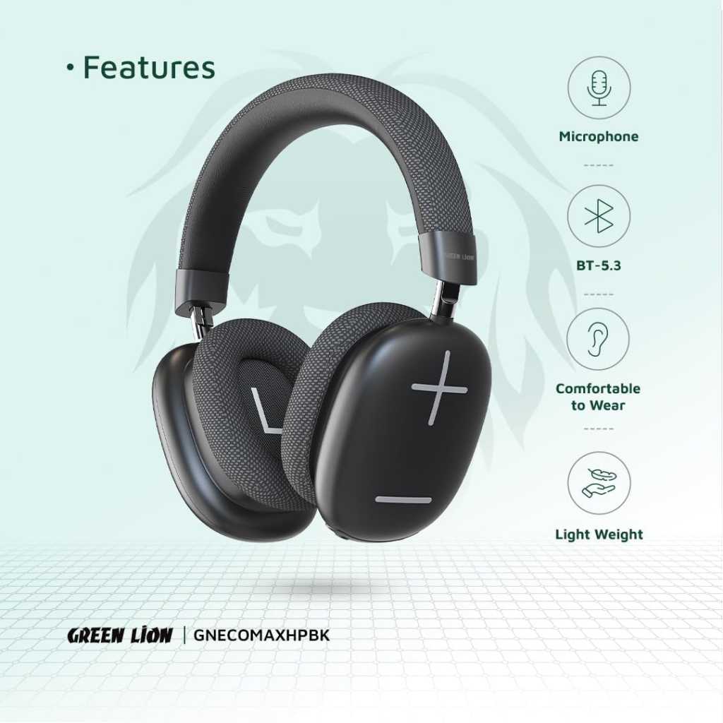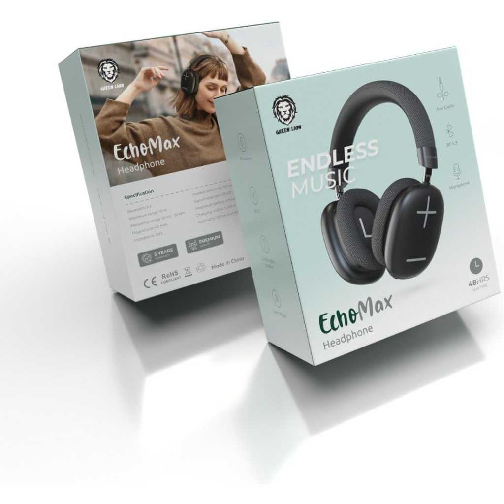 Green Lion Echo Max Headphone, AUX Cable, Bluetooth v5.3, Microphone, 48 Hours Playtime, Lightweight and Portable, 500mAh Lithium-ion Polymer Battery - Black