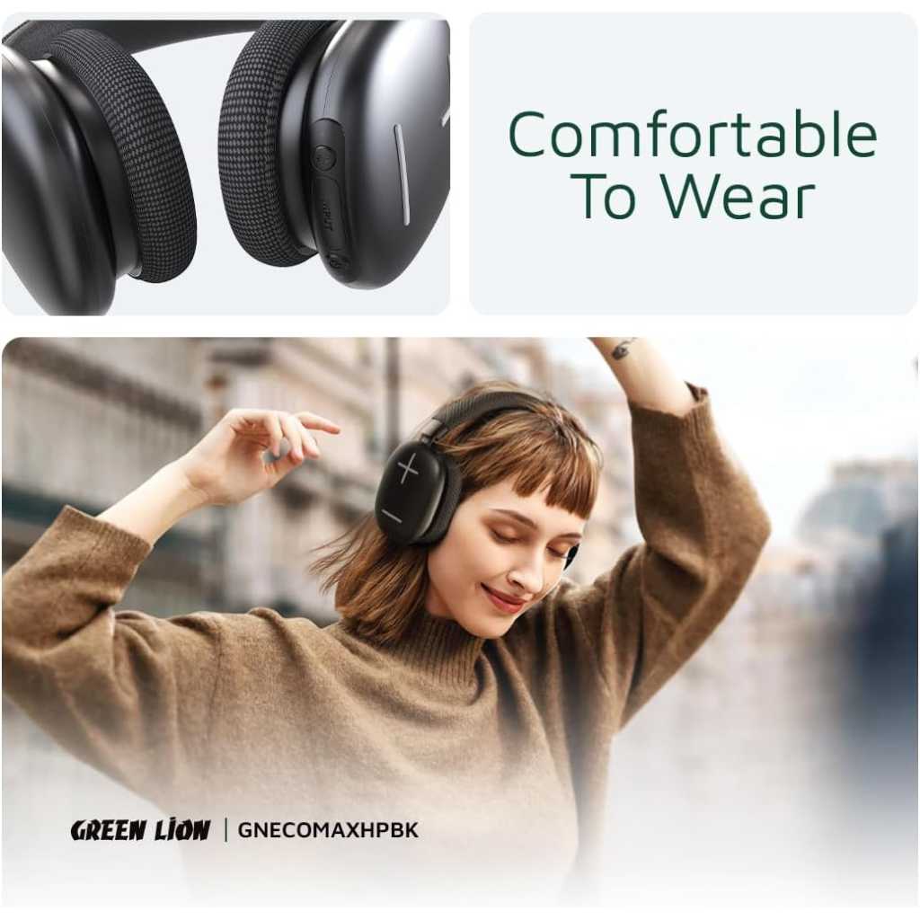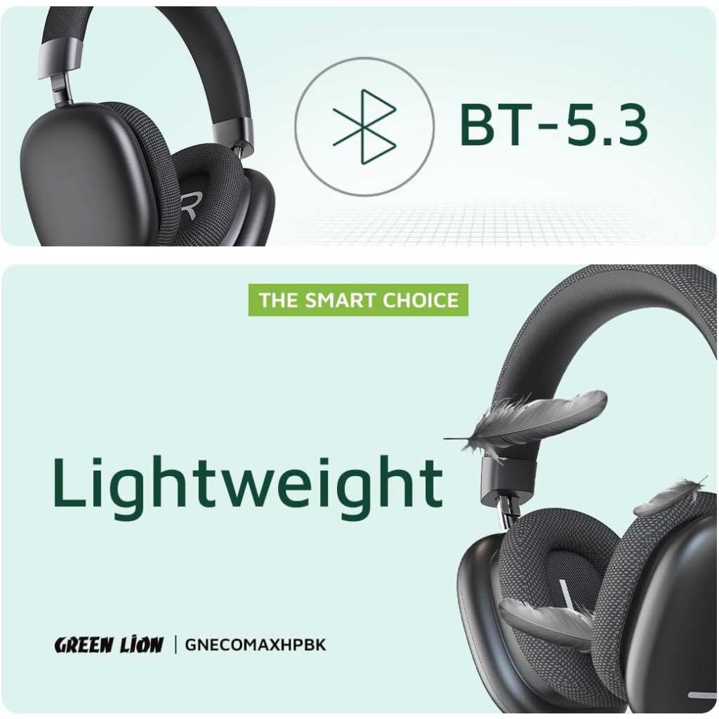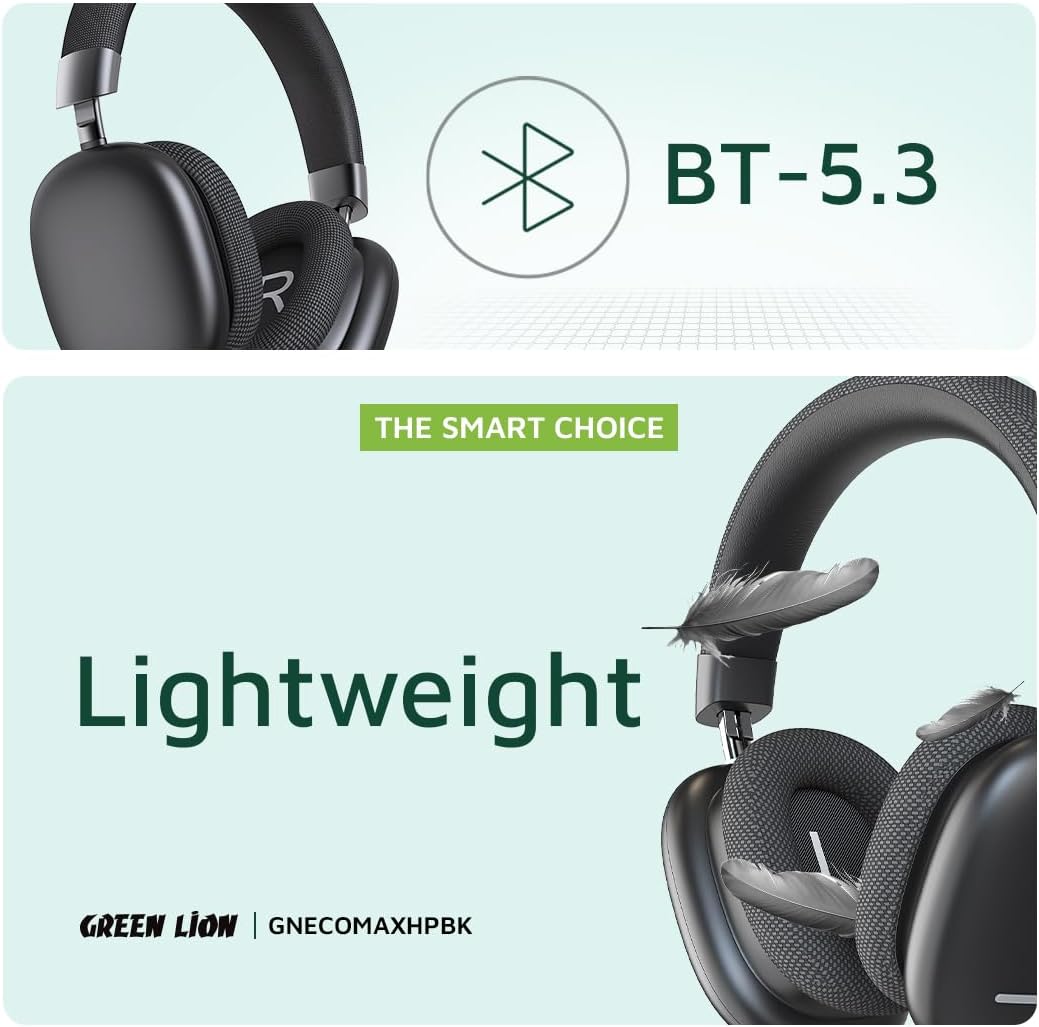 Green Lion Echo Max Headphone, AUX Cable, Bluetooth v5.3, Microphone, 48 Hours Playtime, Lightweight and Portable, 500mAh Lithium-ion Polymer Battery - Black