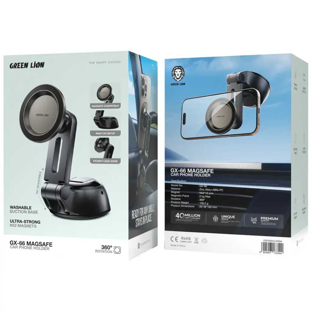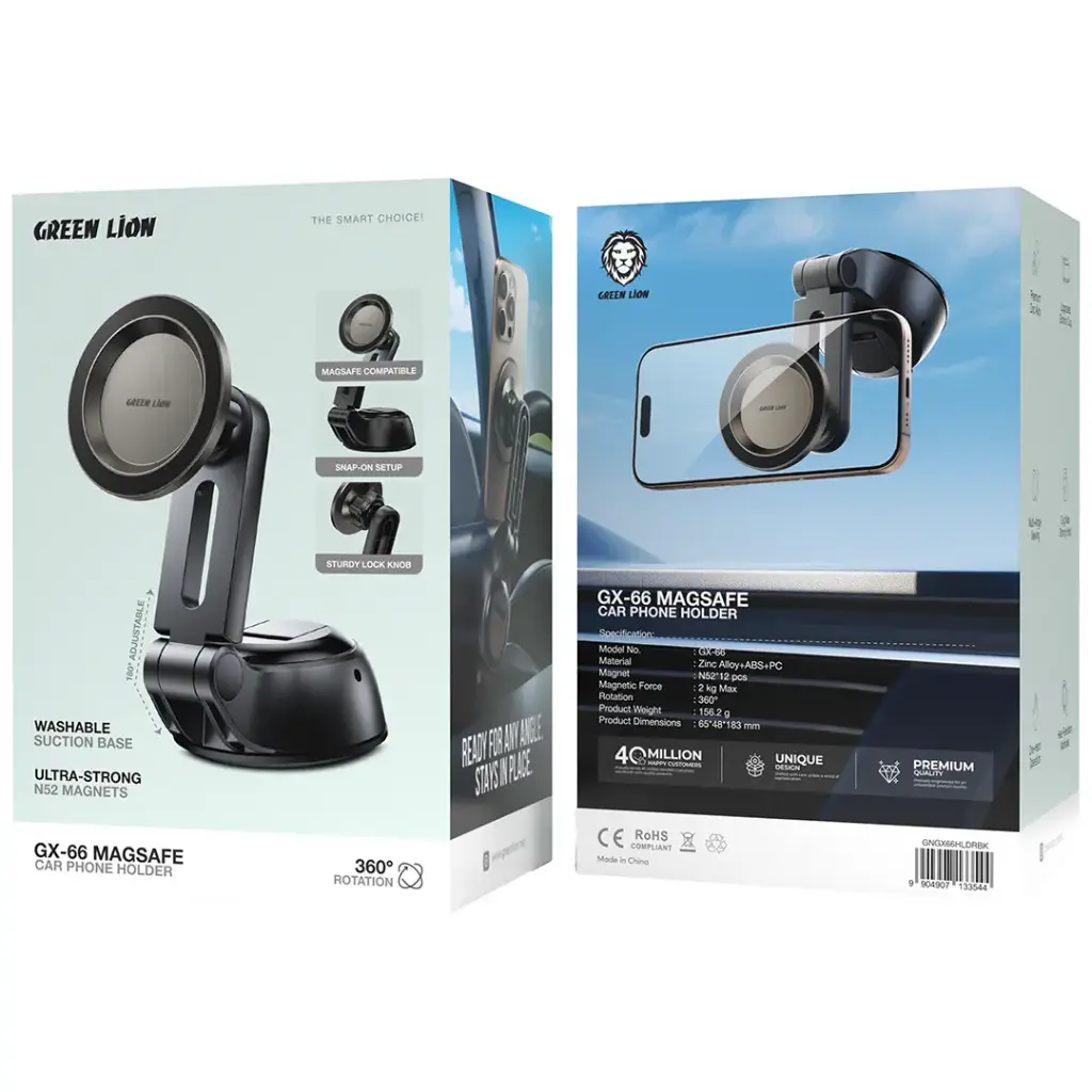 GREEN LION GX-66 MagSafe Car Phone Holder with Ultra-Strong N52 Magnets, Washable Suction Base, 360° Rotation, Flexible Arm, Zinc Alloy, One-Hand Operation – Black