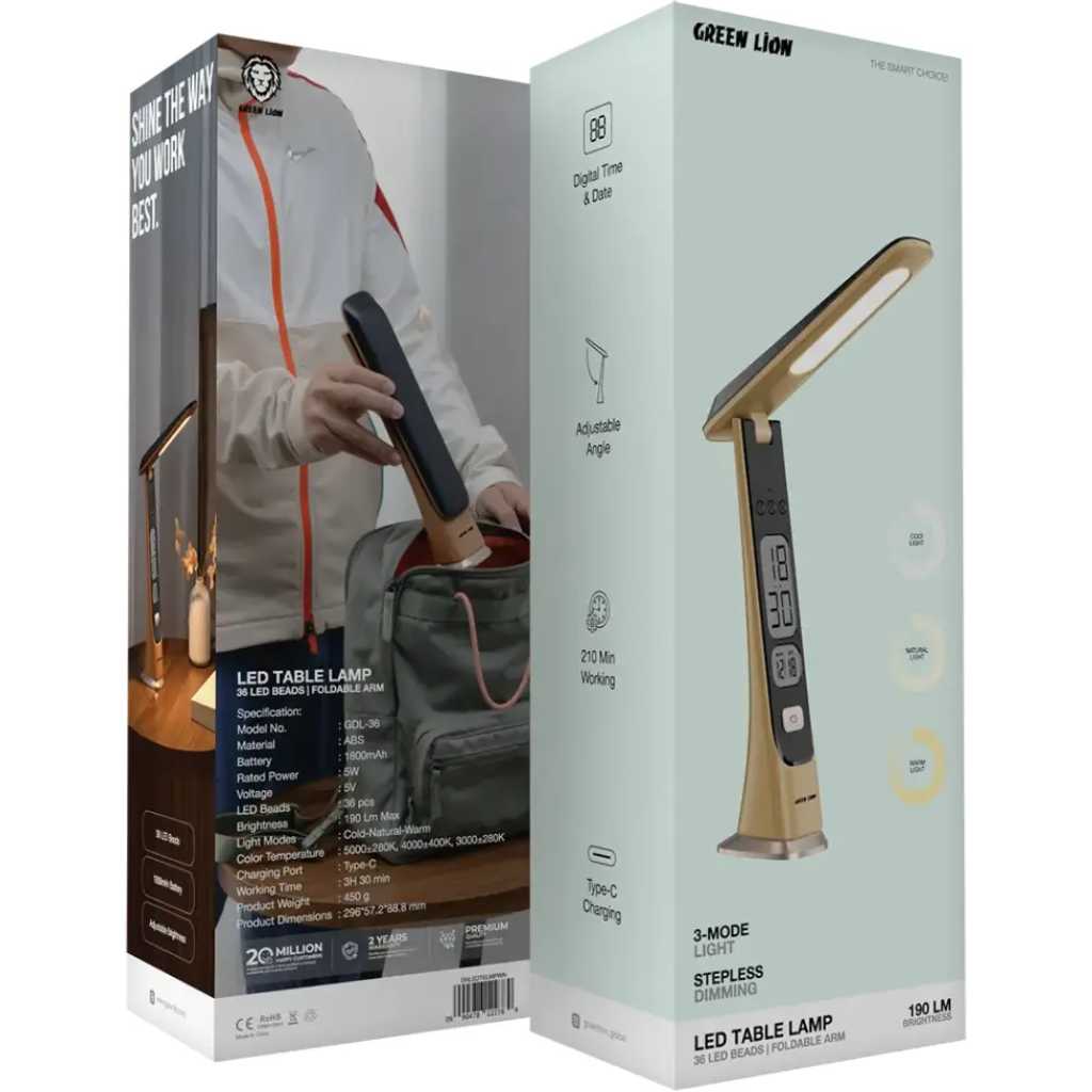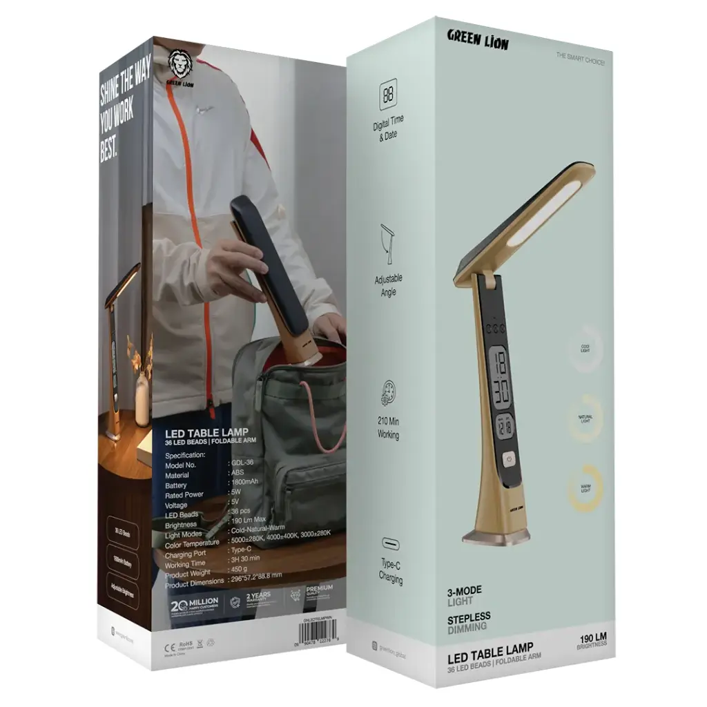 The Green Lion LED Table Lamp is a modern and functional lighting solution designed for optimal illumination and convenience. Featuring adjustable brightness levels and three distinct light modes (Cold, Natural, and Warm), this lamp allows users to customize lighting based on their needs, whether for reading, working, or relaxation. With a color temperature range of 5000±280K, 4000±400K, and 3000±280K, it ensures comfortable and eye-friendly lighting in any setting. Designed for efficiency and flexibility, the lamp has a foldable arm that enables users to adjust the angle and height to achieve the perfect lighting position. Its stepless dimming function provides smooth and precise brightness control, making it ideal for various activities. The built-in digital time and date display adds an extra layer of functionality, helping users organize their daily routines with ease. With an 1800mAh battery, the Green Lion LED Table Lamp delivers up to 3 hours and 30 minutes of continuous lighting at maximum brightness. The 36 LED beads produce a maximum brightness of 190 lumens, ensuring a well-lit environment. For added convenience, the lamp is USB Type-C rechargeable, allowing for faster and more reliable power delivery. Crafted from durable ABS material and weighing just 450g, this lamp is both lightweight and sturdy. Measuring 296 × 57.2 × 88.8mm, its compact design makes it perfect for desks, nightstands, or workspaces. Whether you need a reliable light source for late-night study sessions or a stylish addition to your office, the Green Lion LED Table Lamp combines modern technology, versatility, and efficiency to enhance your daily lighting experience.