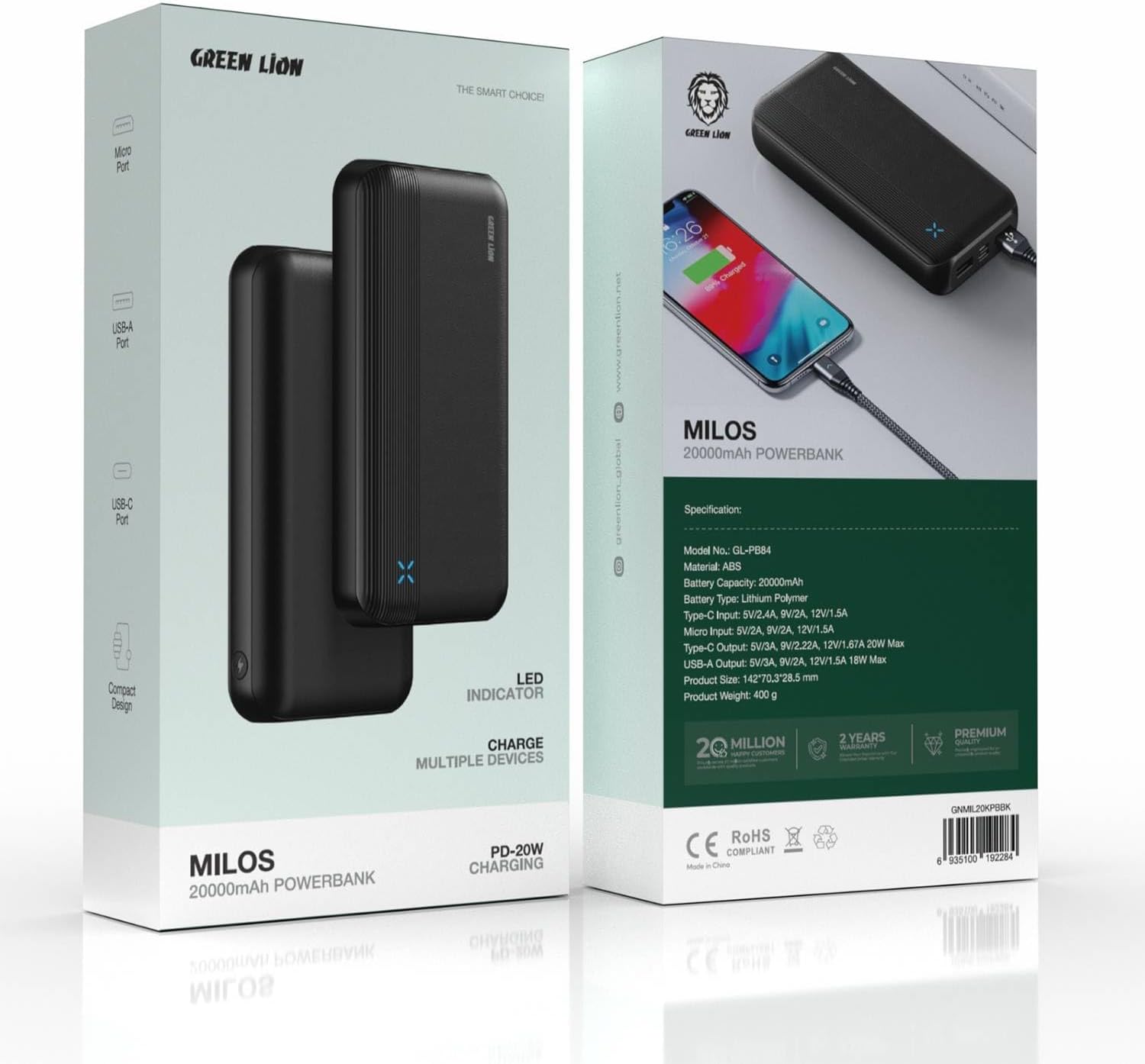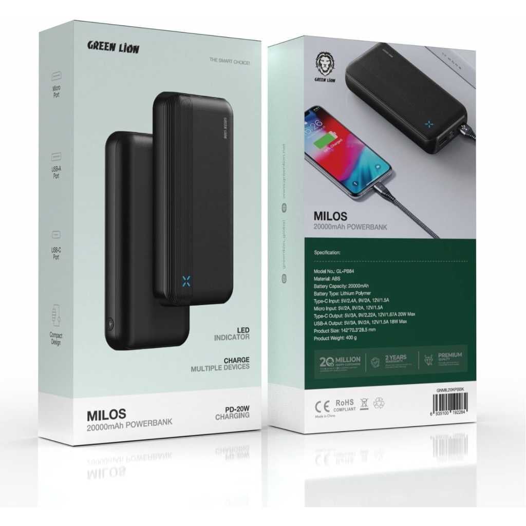 Key Features: 【 】Delivers 20W Type-C and 18W USB-A power for rapid and efficient charging. 【 】Dual output ports allow simultaneous charging of two devices for added convenience. 【 & 】Lightweight and ultra-portable, making it easy to carry anywhere. 【 】High-quality 10,000mAh battery ensures reliable and safe performance. 【 】Built-in LED light displays battery status for real-time power level monitoring. 【 】The package includes The Green Lion Milos 20000mAh Power Bank, – , , and a + .