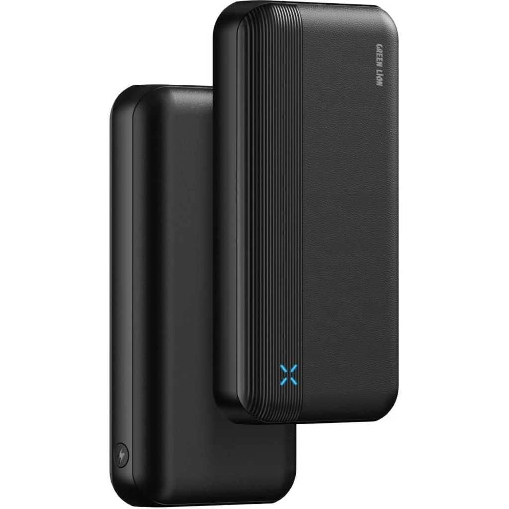Green Lion Milos Power Bank 20000mAh, PD 20W Fast Charging, Dual Output USB-A & Type-C, LED Indicator, Compact & Slim, Lithium Polymer Battery, Portable & Lightweight - Black