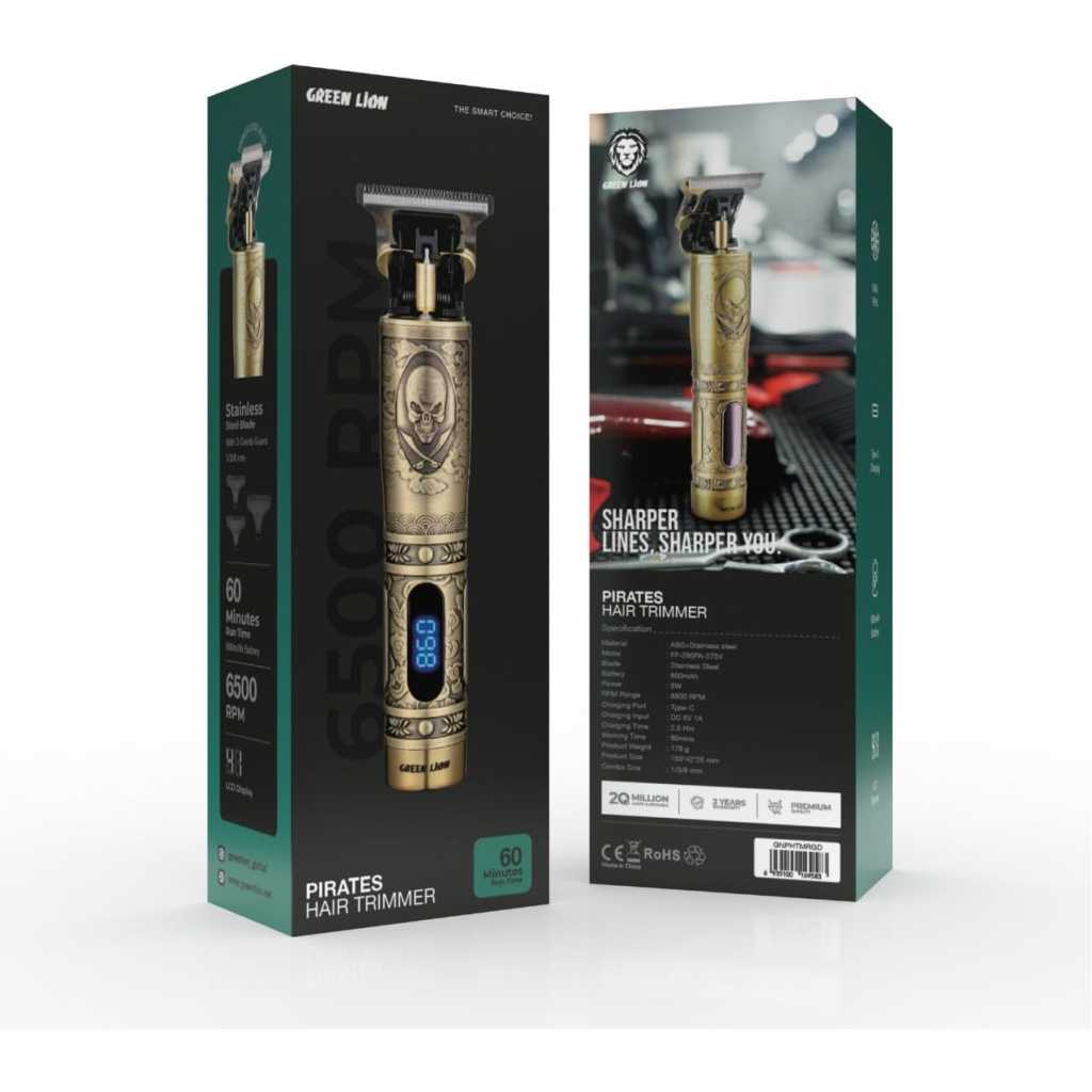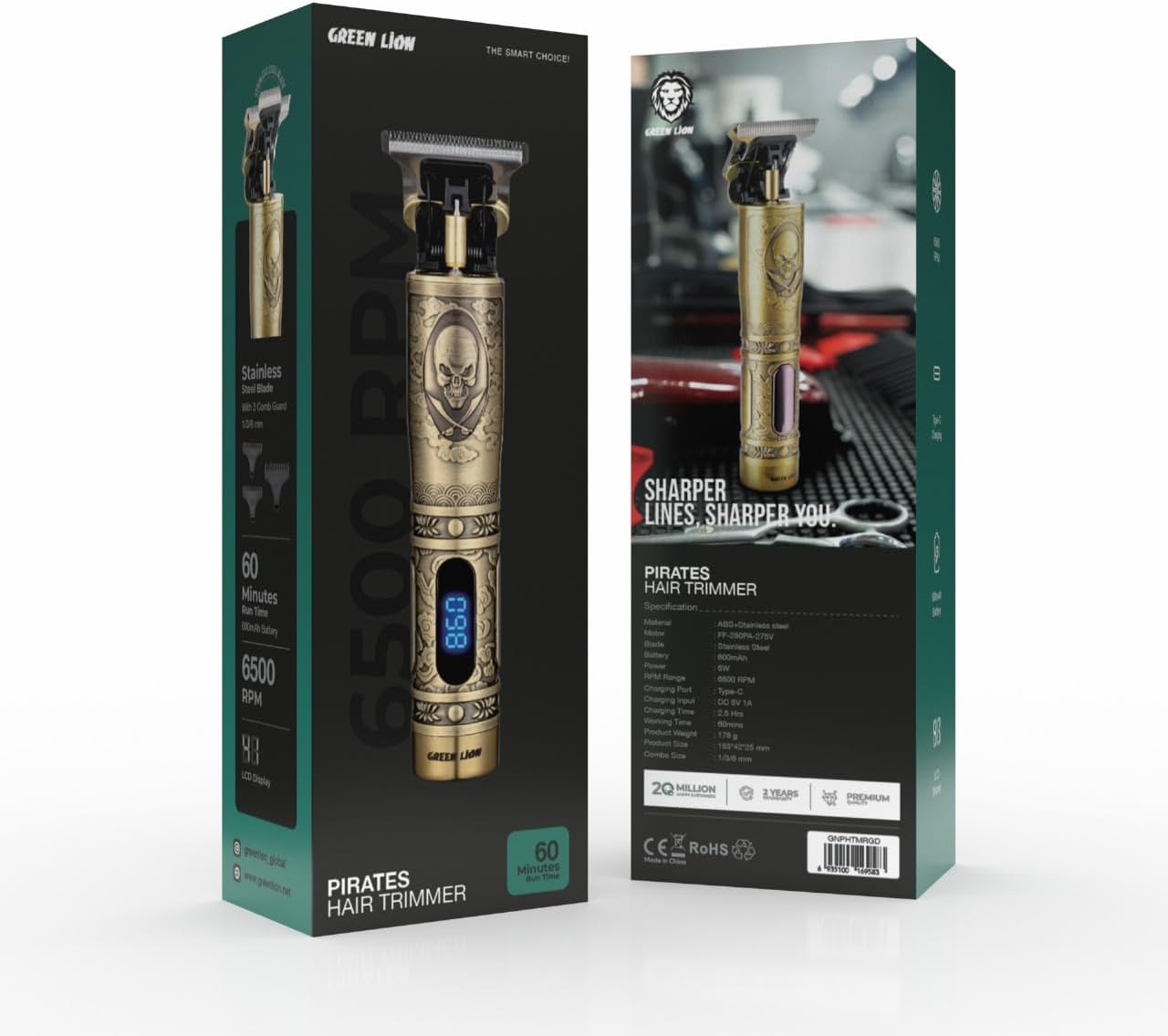 The Green Lion Pirates Hair Trimmer is designed for those who seek precision and reliability in grooming. With a sleek and modern design, this trimmer offers a powerful yet smooth cutting experience, making it an excellent choice for personal grooming at home or on the go. Its compact size and advanced technology provide a user-friendly experience, ensuring you get professional-level results with ease. Equipped with a high-performance motor, this trimmer delivers consistent power, allowing for efficient grooming sessions without interruptions. The long-lasting battery ensures you have ample time to complete your grooming routine, and the quick recharge capability makes it convenient to keep the trimmer ready whenever you need it. The clear LCD display adds a modern touch, giving you real-time feedback during use, so you can always be aware of the battery status. The Green Lion Pirates Hair Trimmer is the perfect tool for those who value quality and efficiency in their grooming routine, offering a reliable and stylish solution to keep you looking sharp.