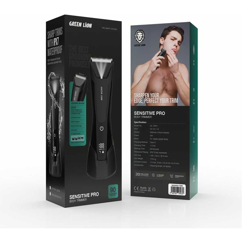Key Features: 【 】Enjoy smooth and efficient grooming with the 6500 RPM motor for precise trimming. 【 】Includes 7 comb attachments ranging from 1.5mm to 9mm for personalized styling. 【 】Recharge fully in 1.5 hours via Type-C cable for up to 1.5 hours of use. 【 】Safe to use in the shower with its waterproof design for added convenience. 【 】Built-in LED light ensures precision, and the display keeps you informed of the battery status. 【 】 Green Lion Sensitive Pro Body Trimmer, 7 comb attachments, charging cable, cleaning brush, Free 12+12 months warranty, and reliable customer support. Green Lion Sensitive Pro Body Trimmer, 7 comb attachments, charging cable, cleaning brush, Free 12+12 months warranty, and reliable customer support.
