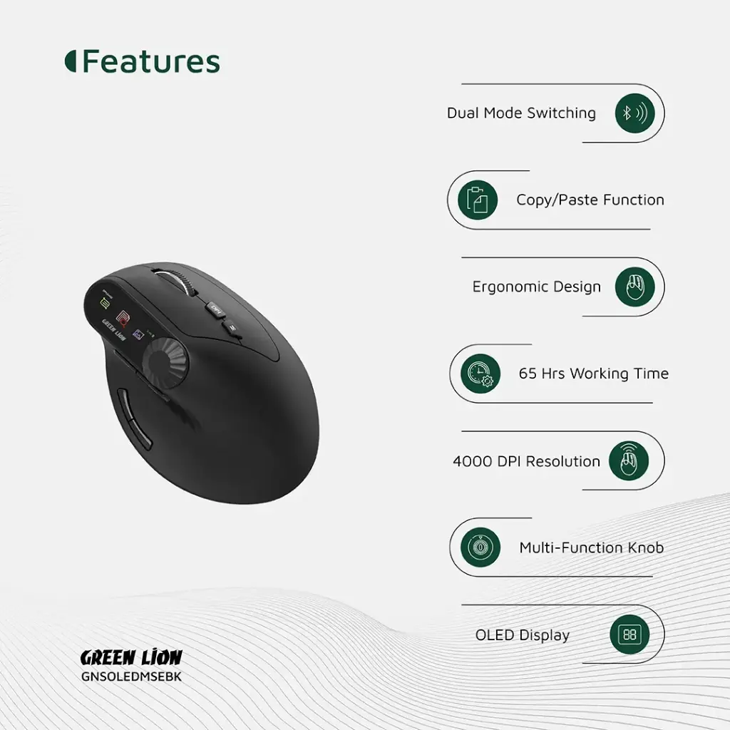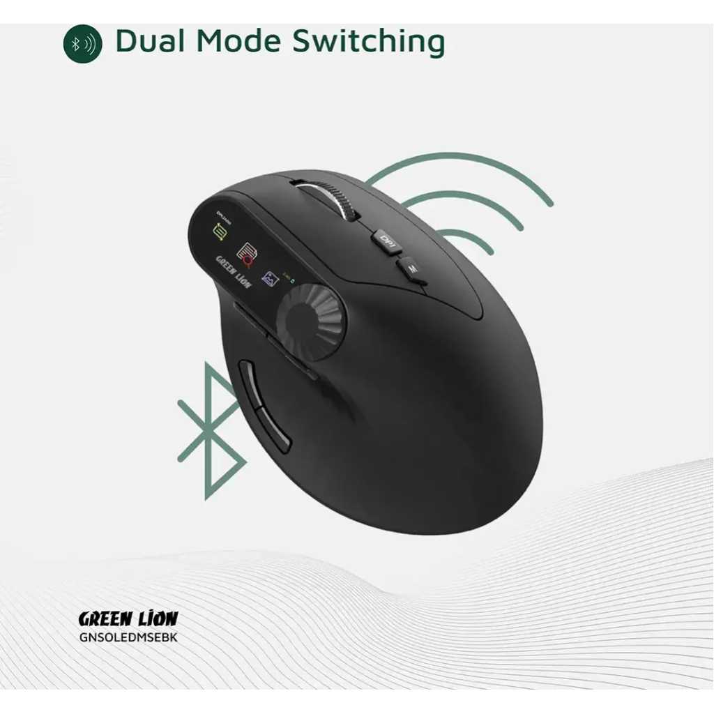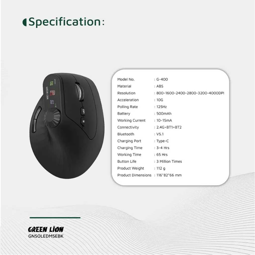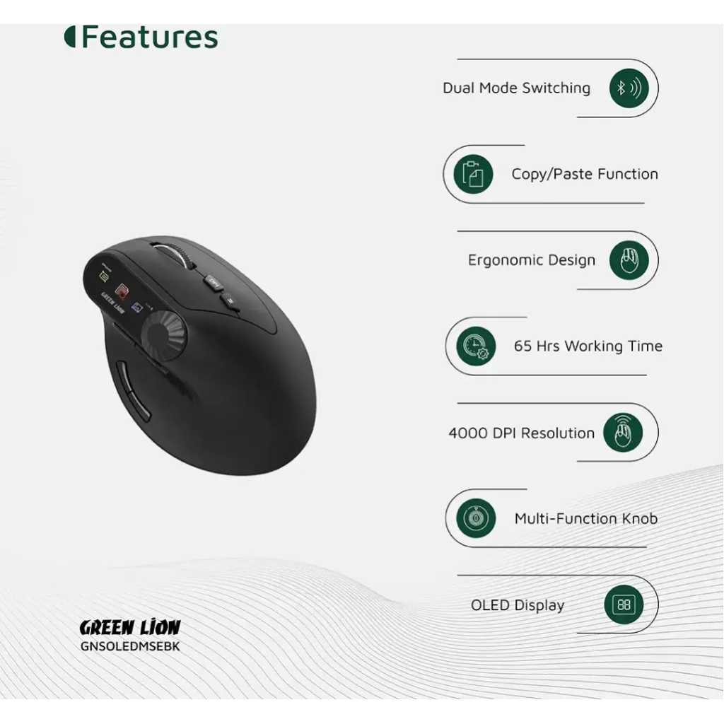 Green Lion Smart OLED Vertical Mouse is crafted with cutting-edge ergonomics and smooth functionality. It is constructed with long-lasting ABS and features an 800-4000 DPI 10G acceleration sensor for responsive and precise tracking. The 125Hz polling rate ensures smooth movement, rendering it ideal for work or games. Dual-mode switching enables quick switching between 2.4G wireless and Bluetooth 5.1 (BT1 & BT2), supporting seamless multi-device connection. The combined OLED display shows current DPI and battery life, and the multi-function knob increases productivity with customizable control. The copy/paste also simplifies workflow for effortless navigation. It is powered by a 500mAh battery and supports up to 65 hours of continuous use, charging quickly with Type-C charging (3-4H). Its vertical ergonomic design reduces wrist stress for long-lasting comfort. Durable buttons tested for 3 million clicks offer longevity and, thus, have the optimal mix of efficiency and comfort. Specification Material: ABS Resolution: 800-1600-2400-2800-3200-4000 DPI Acceleration: 10G Polling Rate: 125Hz Battery: 500mAh Working Current: 10-15mA Connectivity: 2.4G + BT1 + BT2 Bluetooth: V5.1 Charging Port: Type-C Charging Time: 3-4H Working Time: 65H Button Life: 3 Million Times Features Dual Mode Switching Copy/Paste Function Ergonomic Design OLED Display Multi-Function Knob Key Features: Dual Mode Switching Copy/Paste Function Ergonomic Design OLED Display Multi-Function Knob