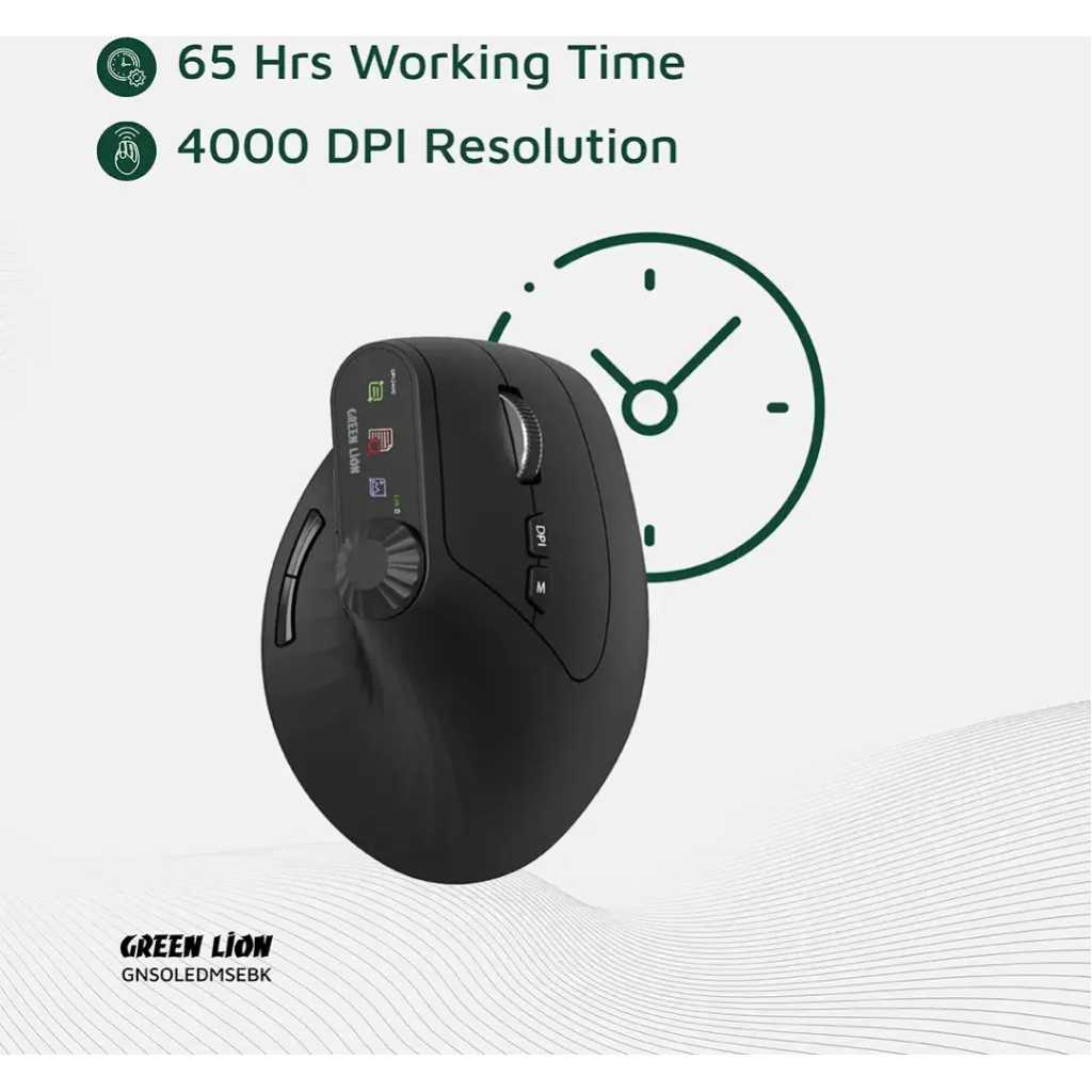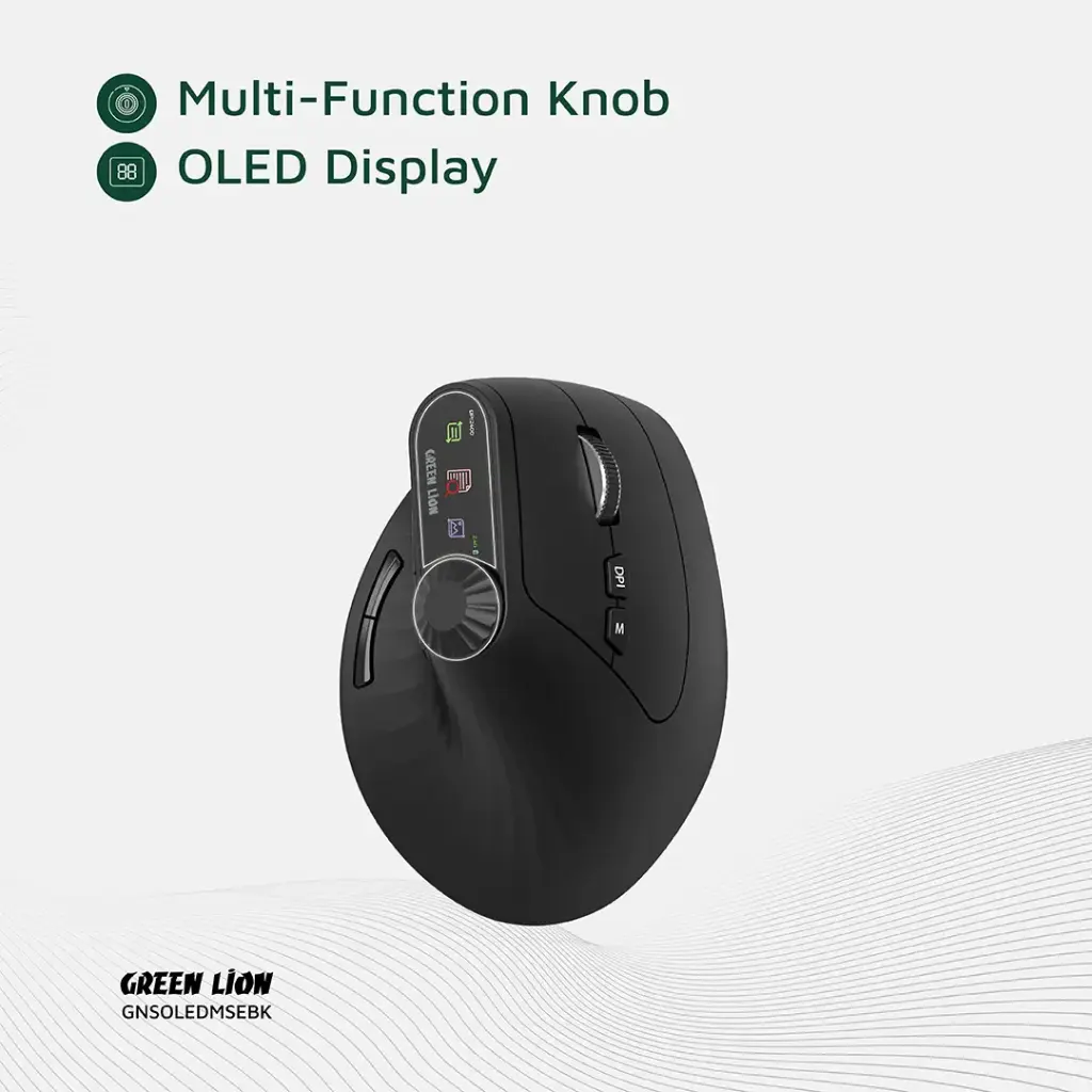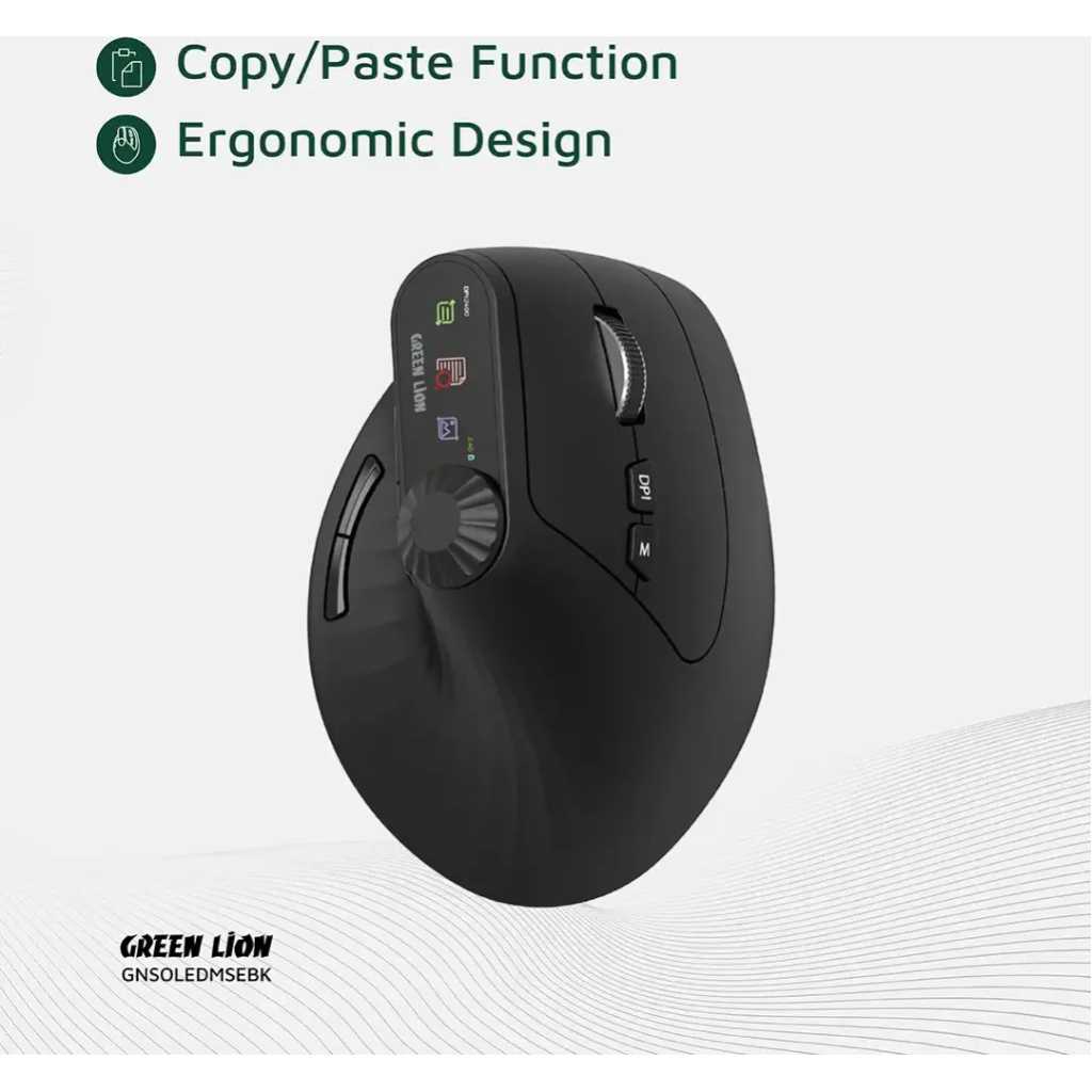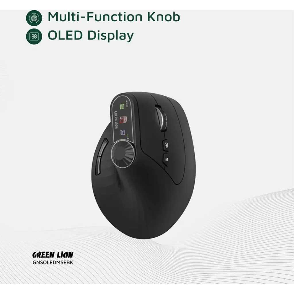 Green Lion Smart OLED Vertical Mouse is crafted with cutting-edge ergonomics and smooth functionality. It is constructed with long-lasting ABS and features an 800-4000 DPI 10G acceleration sensor for responsive and precise tracking. The 125Hz polling rate ensures smooth movement, rendering it ideal for work or games. Dual-mode switching enables quick switching between 2.4G wireless and Bluetooth 5.1 (BT1 & BT2), supporting seamless multi-device connection. The combined OLED display shows current DPI and battery life, and the multi-function knob increases productivity with customizable control. The copy/paste also simplifies workflow for effortless navigation. It is powered by a 500mAh battery and supports up to 65 hours of continuous use, charging quickly with Type-C charging (3-4H). Its vertical ergonomic design reduces wrist stress for long-lasting comfort. Durable buttons tested for 3 million clicks offer longevity and, thus, have the optimal mix of efficiency and comfort. Specification Material: ABS Resolution: 800-1600-2400-2800-3200-4000 DPI Acceleration: 10G Polling Rate: 125Hz Battery: 500mAh Working Current: 10-15mA Connectivity: 2.4G + BT1 + BT2 Bluetooth: V5.1 Charging Port: Type-C Charging Time: 3-4H Working Time: 65H Button Life: 3 Million Times Features Dual Mode Switching Copy/Paste Function Ergonomic Design OLED Display Multi-Function Knob Key Features: Dual Mode Switching Copy/Paste Function Ergonomic Design OLED Display Multi-Function Knob