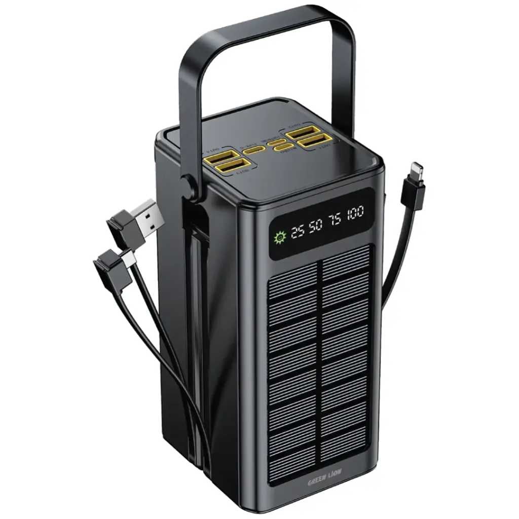 Green Lion Solar X 60000mAh Power Bank is easy to carry and versatile, it embraces a larger range of energy storage, eliminating the need for charging adapters or common applets. It has a massive capacity of 60000mAh, which is to the advantage of charging multiple devices. The solar power input is given at 5V, which can be recharged from sunlight, hence its unmatched reliability during times on the go. The inputs lie between USB-C (PD 18W), USB-Micro, and USB-Lightning (5V/2A). Output ports are provided for USB-C (PD 20W), USB-A1 (up to 22.5W), and USB-A2/A3/A4 (5V/2A) to match fast charging standards of all devices. Its other safety features include a digital display for monitoring, a brand-pride handle for carry convenience, and two emergency light modes, namely, Flash and SOS. With the inclusion of different protection features, it indeed charges safely and efficiently, providing an ideal partner while going on adventures.
