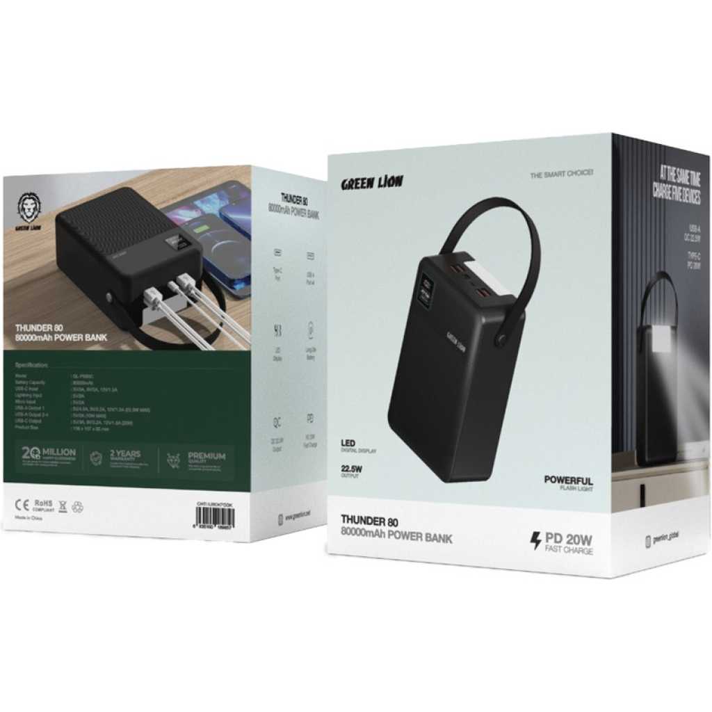 The Green Lion Thunder 80 80000 mAh Power Bank is crafted for those who need an extraordinary power source that can keep multiple devices charged for extended periods. With its massive 80000 mAh capacity, this power bank is built to provide long-lasting power, making it perfect for extended trips, outdoor activities, or users with high power demands. Its design integrates advanced charging options, offering flexibility with multiple ports to keep all your devices powered up efficiently. This power bank supports a variety of charging inputs and outputs, including USB-A and USB-C, allowing for fast and efficient charging of smartphones, tablets, and other devices. The built-in LED display ensures that you always have a clear view of the remaining battery life, making it easy to manage your power consumption. With multiple USB-A ports, the Green Lion Thunder 80 80000 mAh Power Bank can handle simultaneous charging for multiple devices, providing versatility and convenience. Designed for those who need unparalleled power, the Green Lion Thunder 80 80000 mAh Power Bank is an essential companion for anyone seeking a reliable and robust charging solution that delivers exceptional performance in any situation.