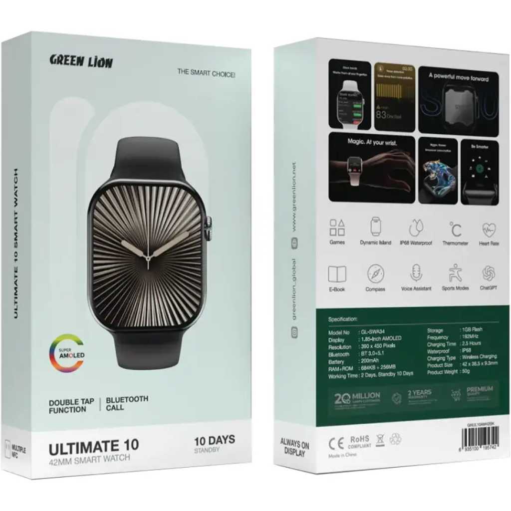 Introducing Green Lion Ultimate 10 42MM Smart Watch-the epitome of ultimate technology, encased in a sleek design. This smartwatch has a super-stunning 1.85-inch AMOLED display, raising the bar high in brilliance for visual display and user experience. Given the 200mAh battery and wireless charging for convenience, this smartwatch will keep you connected all day. Equipped with 684KB RAM and 256MB ROM, the Ultimate 10 takes everything in its stride-from essential health monitoring features such as a thermometer and heart rate tracker to more interactive features like a voice assistant and integrated ChatGPT, being the perfect buddy that could support you on the go. The Green Lion Ultimate 10 combines peacetime activities in one watch: a combination of games and a Dynamic Island feature extends fun and functionality to daily interaction. The added function of this versatile watch is that it has an e-book reader and compass, which can be used for quick navigation and entertainment. This smartwatch is also a good friend in active lifestyles, while several sports modes will keep you on track with your fitness goals. Specification Display: 1.85-Inch AMOLED Resolution: 390 × 450 Pixels Bluetooth: BT 3.0 + 5.1 Battery: 200mAh RAM + ROM: 684KB + 256 MB Working Time: 2 Days, Standby 10 Days Storage: 1GB Flash Frequency: 192MHz Charging Time: 2.5 Hours Waterproof: IP68 Charging Type: Wireless Charging EAN: 6935100195759 | 6935100195766 | 6935100195742 Features Games Dynamic Island Thermometer Heart Rate E-Book Compass Voice Assistant Sports Modes ChatGPT