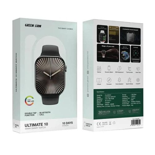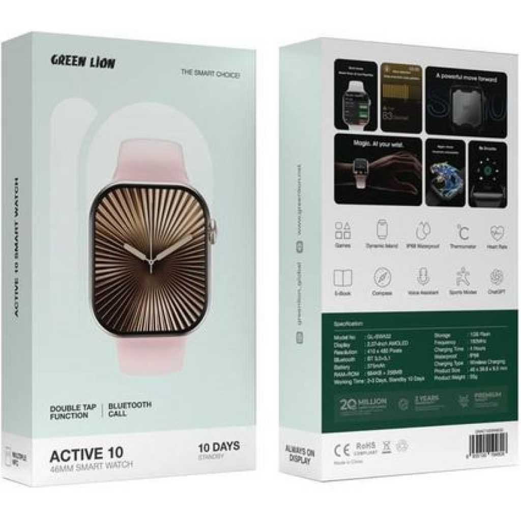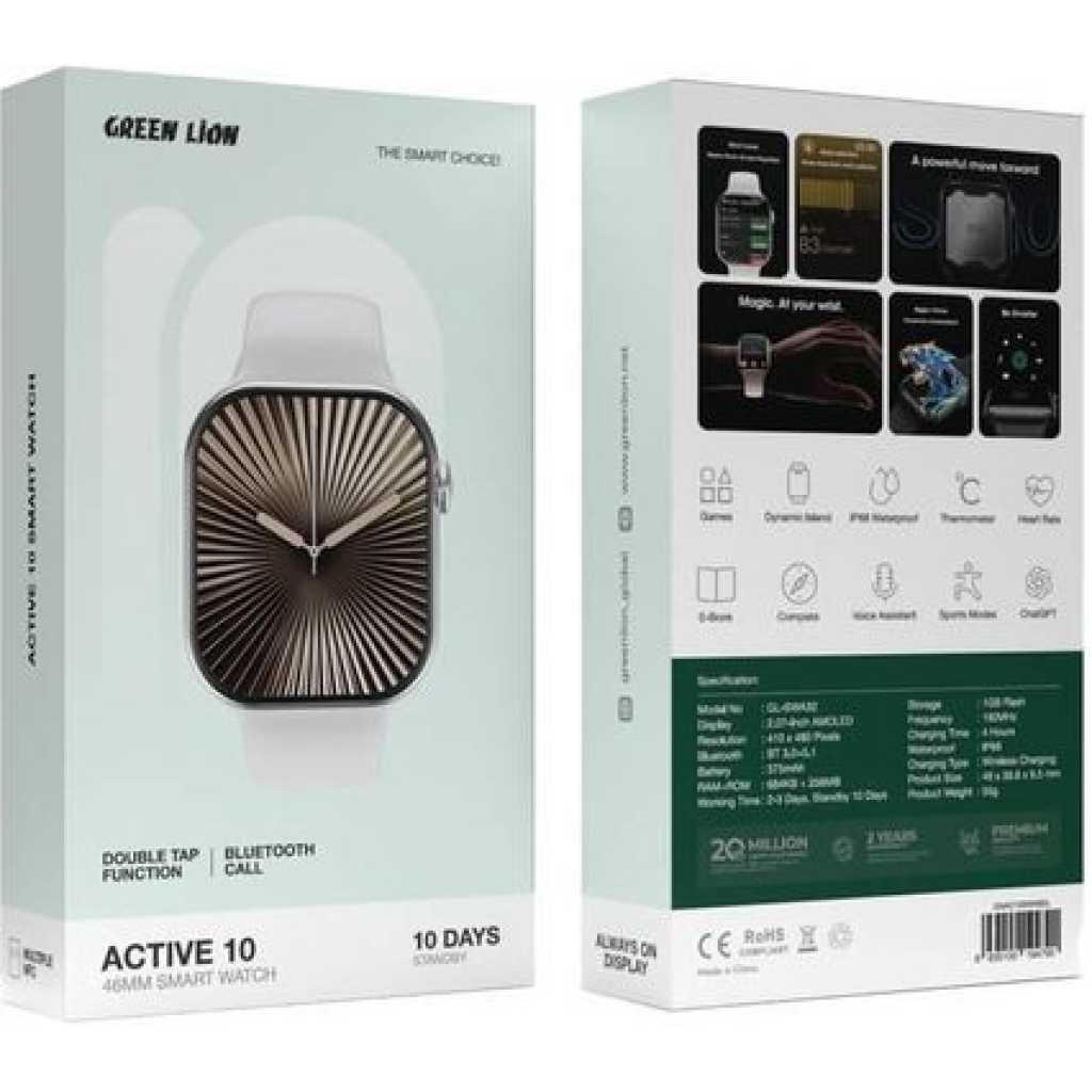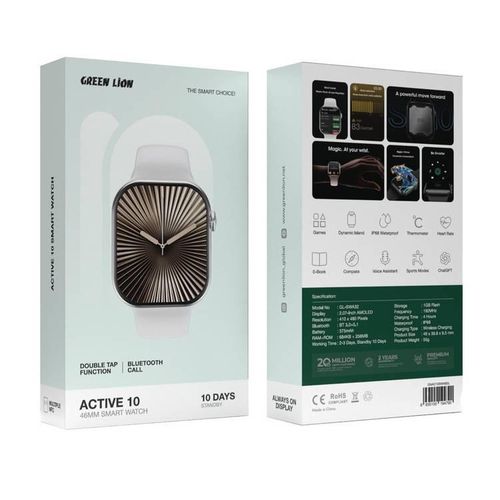 The Green Lion Active 10 46mm Smart Watch is the ideal partner for people who have an active lifestyle. This smartwatch has many features. Its sports modes help you track your fitness goals. It has a voice assistant , compass , and thermometer . These tools help with daily tasks and outdoor trips. The watch’s 2.07-inch IPS display shows your data clearly. You can read while on the road, too, thanks to the e-book feature . Enjoy fun games and a dynamic island interface . Stay connected with Bluetooth calling . Conveniently, you may quickly access your favorite features with the double-tap functionality . The Green Lion Active 10 has a strong 375mAh battery . It lasts 2-3 days of use and 10 days on standby . So, it will keep you charged all day. This multipurpose smartwatch is made for your busy life. It offers a perfect balance of fashion and utility.
