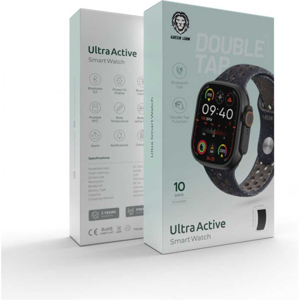 Check out the Green Lion Ultra Active Smart Watch! This smartwatch features a large 2-inch screen that displays everything with clarity and brightness. It offers seamless connectivity to your devices through Bluetooth 5.0/3.0 technology. With 64MB of storage space, it provides ample room for your favorite apps. One of its standout features is the impressive 350mAh battery, which can last up to 10 days on a single charge. The soft nylon strap ensures comfortable wear throughout the day. Controlling the smartwatch is a breeze, as it only requires two taps to navigate its features. You don’t need to have any tech-savvy skills to use. The watch combines functionality with style in a simple and user-friendly manner. Additionally, it supports wireless charging for added convenience. Features Flash Memory: 64Mb Screen Size: 2.01″ Resolution: IPS 240*296 Bluetooth: BT 5.0/3.0 Battery Type: Lithium-Ion Polymer Battery Capacity: 350mAh Charging Method: Wireless Charger 10 Days Standby Nylon Strap Included Double Tap Function