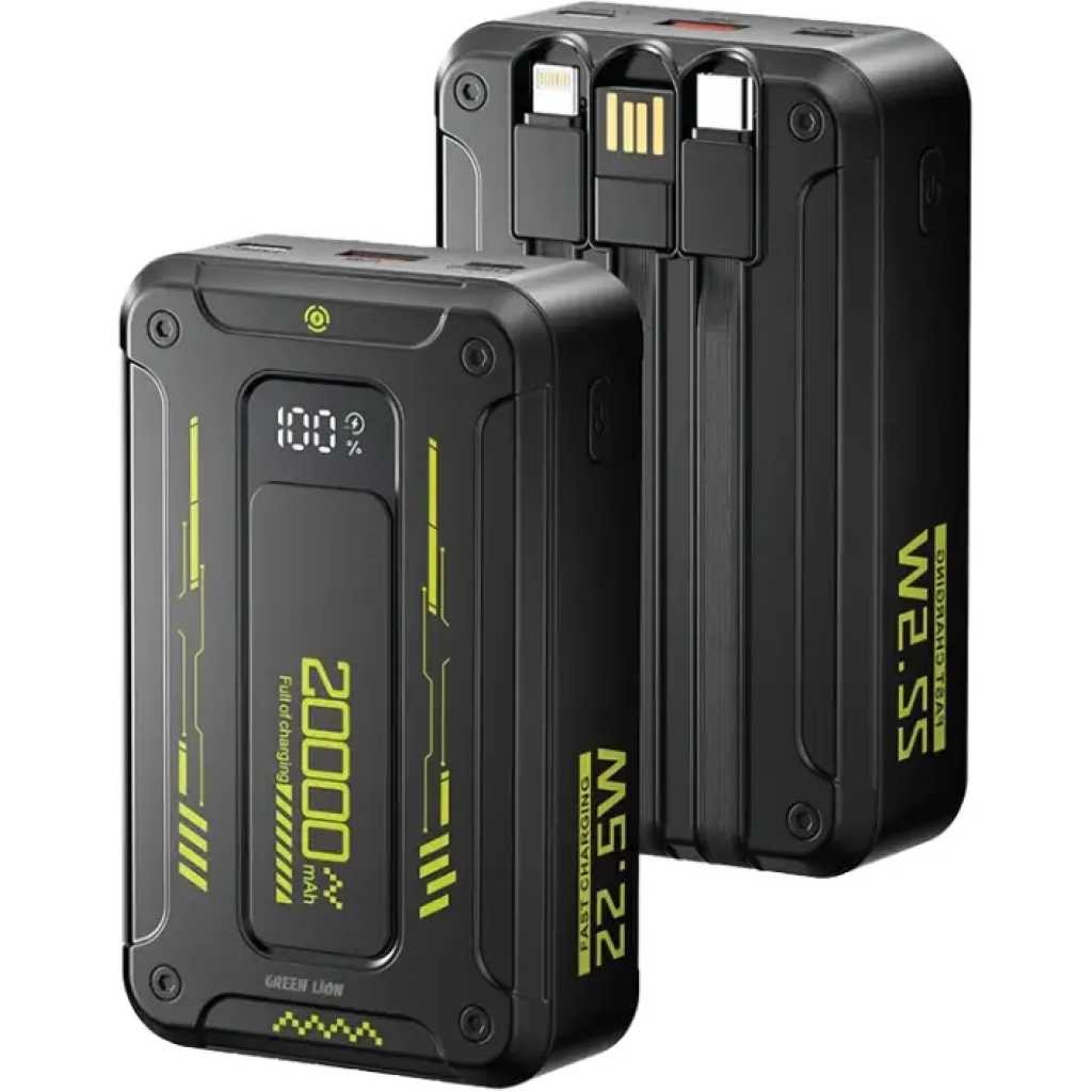 The Green Lion Xtreme 20 Power Bank is an ultra-efficient, ultra-fast, and ultra-modern portable battery charger with 20,000mAh of sheer capacity. Its capable PD 22.5W output ensures that many devices charge quickly. It has USB-C and USB-A inputs, while its many outputs include USB-C, USB-A, and a built-in Lightning cable. The LEDs display real-time battery levels. This power bank, designed with portability and it has the feature of an ultra-slim casing with built-in cables. It is the complete answer to mobile phones, tablets, and other gadgets requiring a reliable and super-fast charging solution for traveling or daily use. Specification Battery Capacity: 20,000mAh USB-C Input: 5V/2.5A, 9V/2A, 12V/1.5A USB-A Input: 5V/2.1A USB-C Output: 5V/2.5A, 9V/2.22A, 12V/1.67A (20W) USB-A Output: 4.5V/5A, 5V/3A, 9V/2A, 12V/1.5A (22.5W) USB-C Cable Output: 4.5V/5A, 5V/3A, 9V/2A, 12V/1.5A (PD 22.5W) Lightning Output: 5V/2.4A (12W) Features Lightning Cable USB-C Cable USB-A Port USB-C Port Digital Display Built-In Cable Key Features: Lightning Cable USB-C Cable USB-A Port USB-C Port Digital Display Built-In Cable