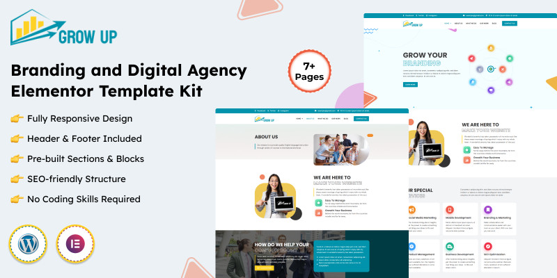 Grow Up - Digital Branding Agency Elementor Kit. Grow Up is the best Elementor kit for branding and digital agencies. Launch your mobile, web, and social marketing services.