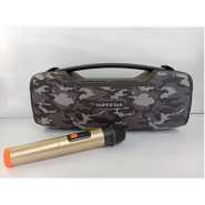 It’s a H@F rechargeable multi media portable bluetooth speaker black. This speaker can use both AC and DC power source. It has a digital FM tuner. It has an handle which makes it easy to carry. The speaker can receive sound from any bluetooth source. It has a well balanced output which helps it giving out a great sound. This speaker can be recharged due to it’s inbuilt lithium battery. The speaker also has an SD card slot and a USB port.