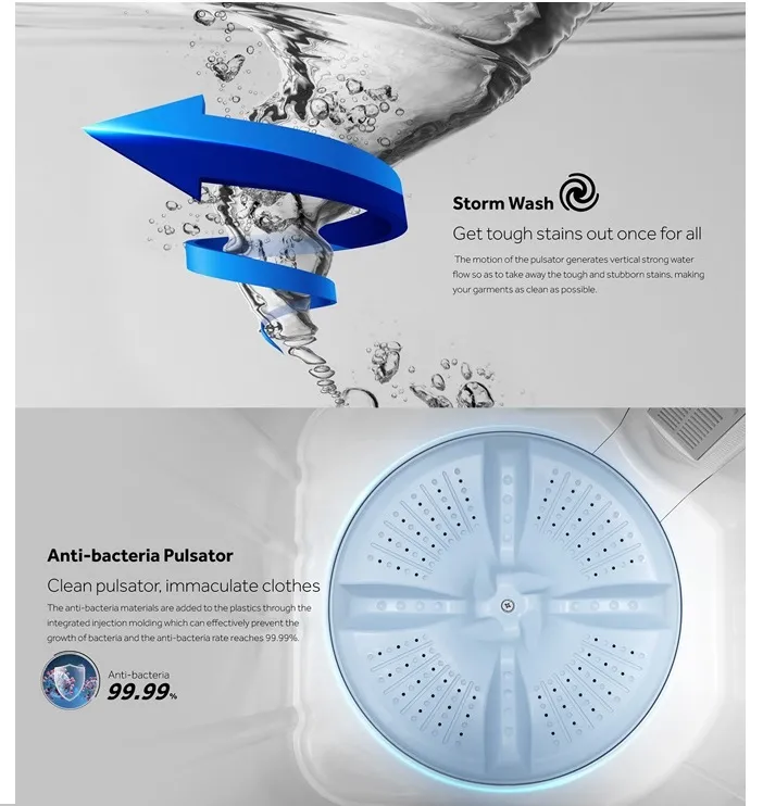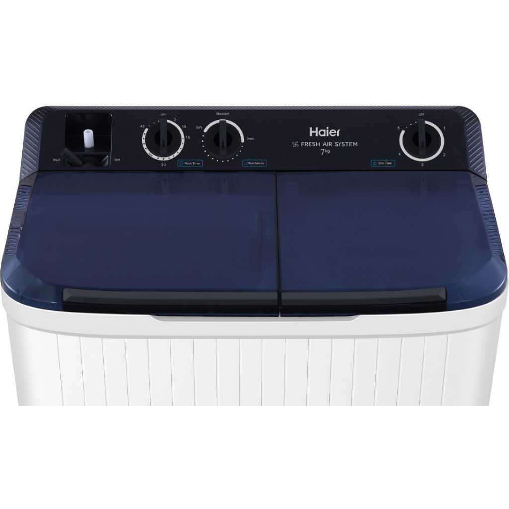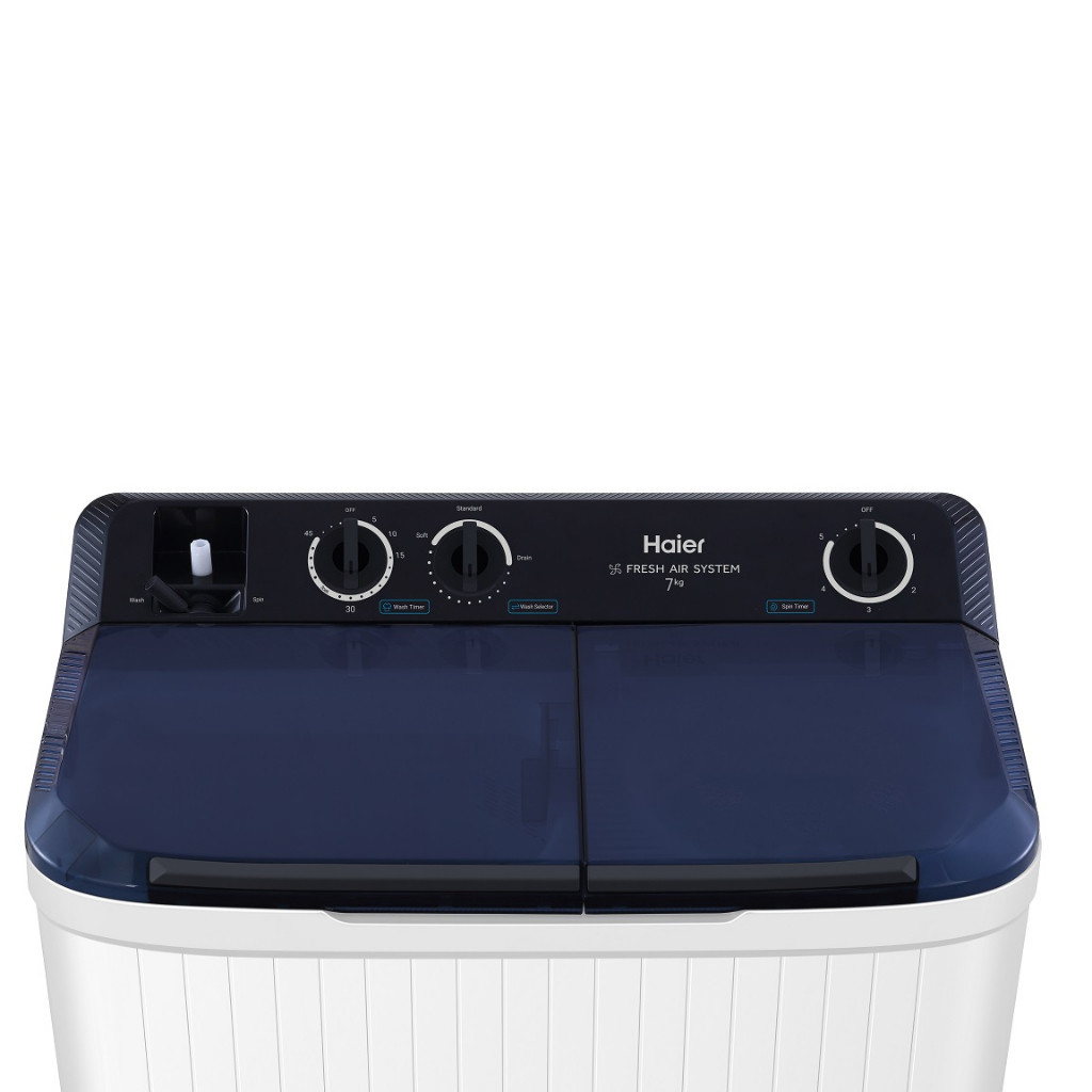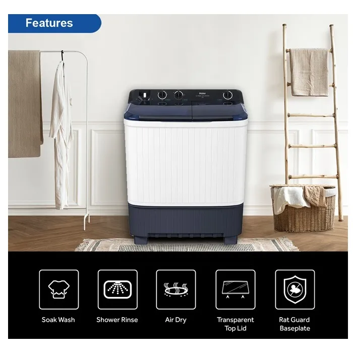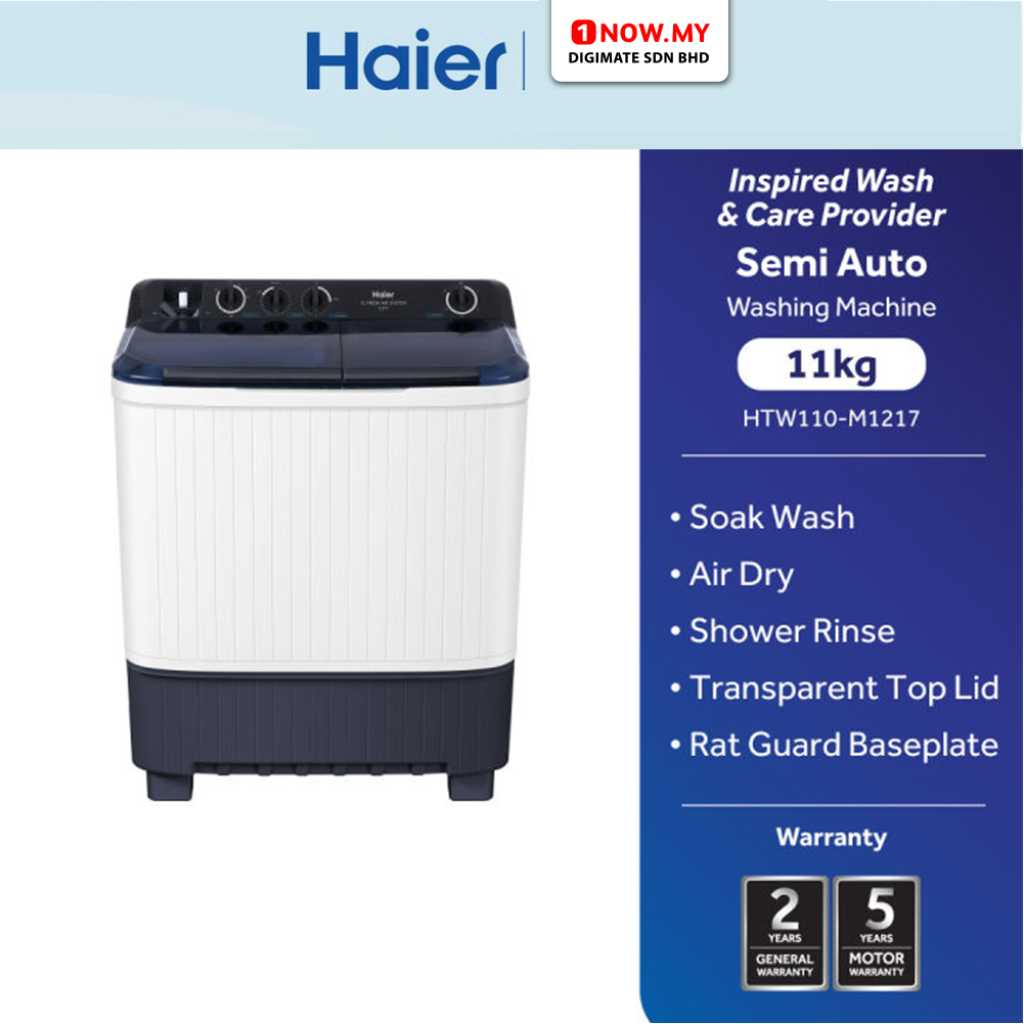 HAIER 11kg Non-Inverter Semi Auto Washing Machine, HTW110-M1217, Twin Tub Transparent Lid: √ Air Dry: √ Soak Wash: √ ABT Pulsator: √ Tub Clean: – Tub Dry:- Water Inlet Selection: √ Easy Clean Filter: √