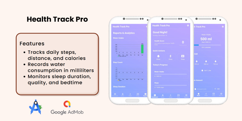 Health Track Pro - Android App Source Code. Health Track Pro is a comprehensive Android health monitoring app that tracks water intake, daily steps and sleep patterns.