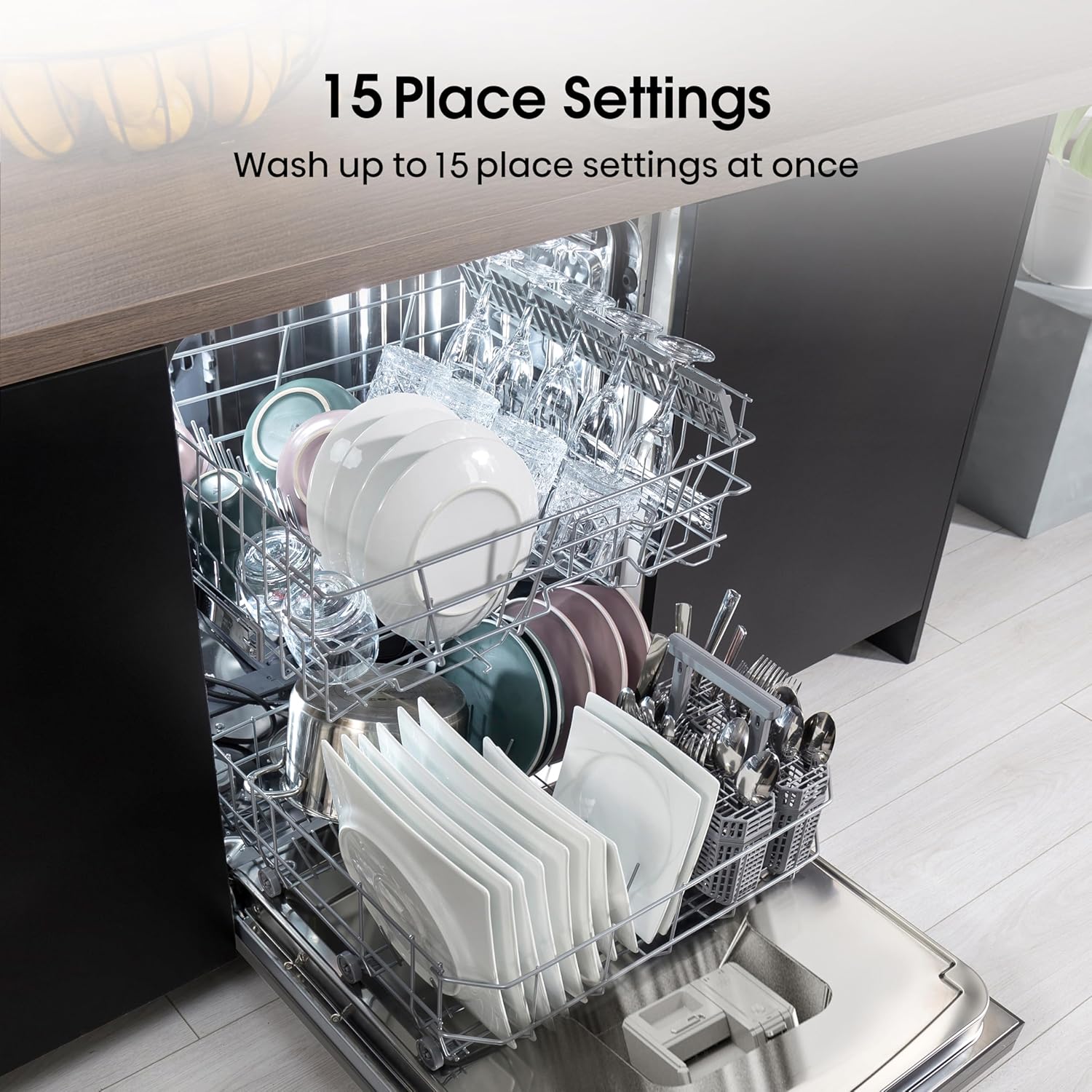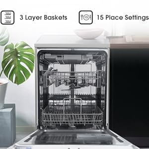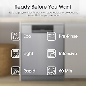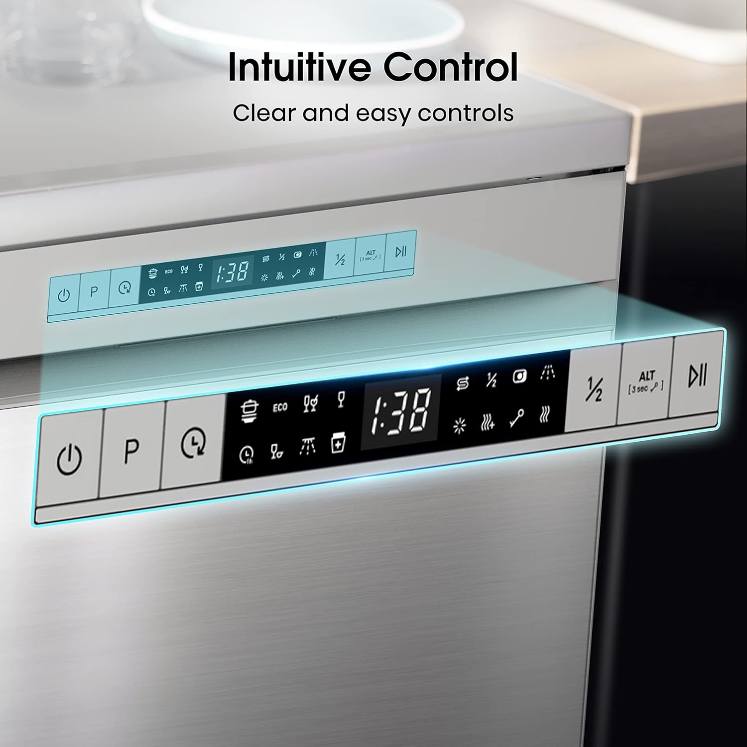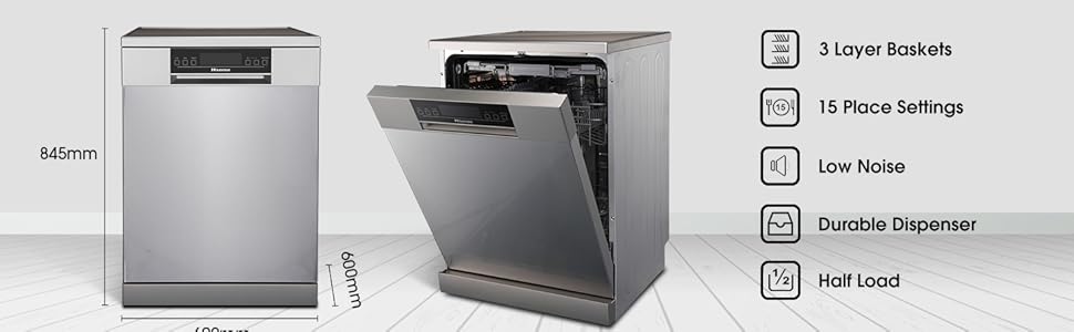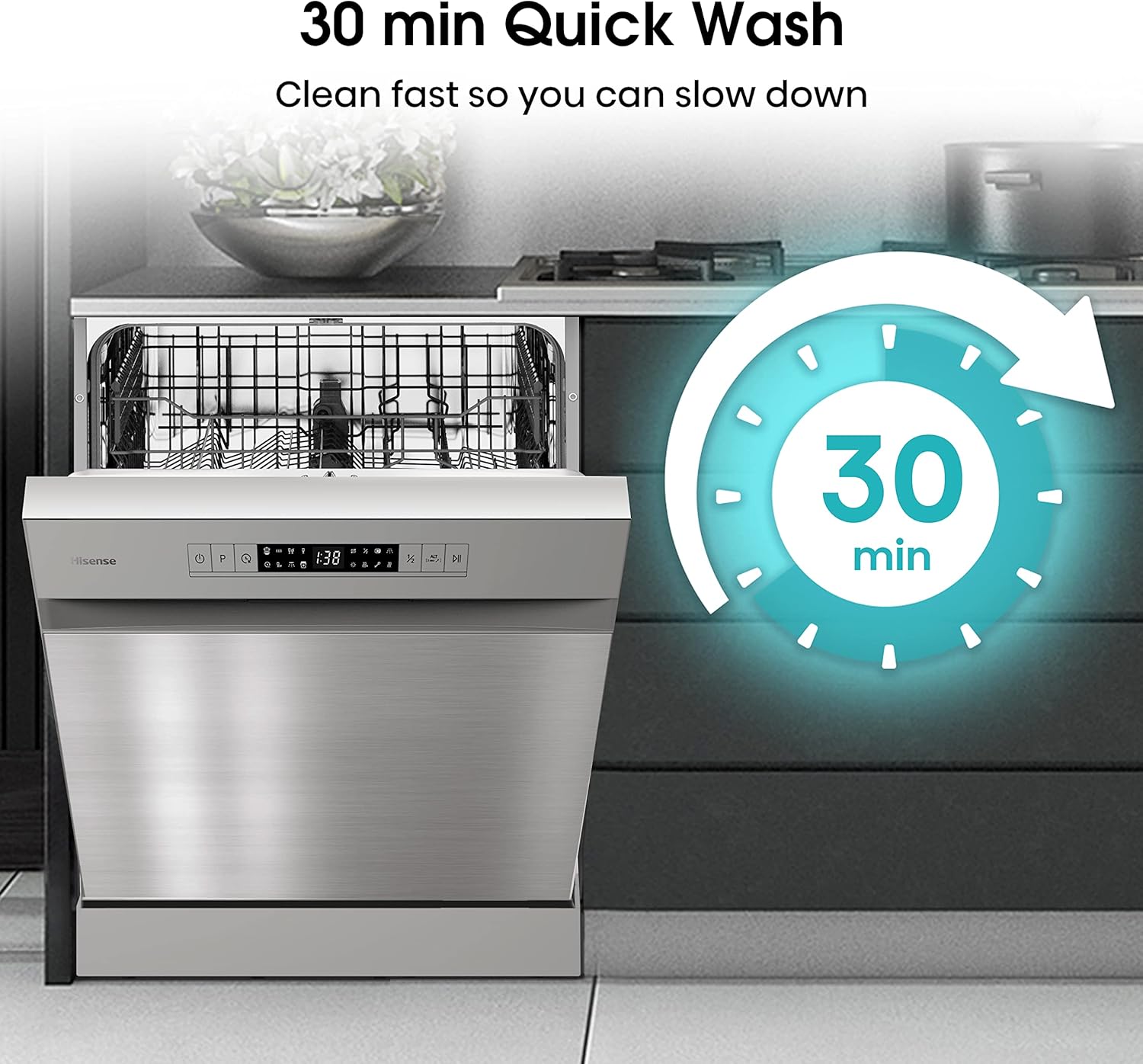 Key Features: Hisense 15 Place Settings Dishwasher (HS623E90G, Silver, Stainless Steel, Inbuilt Heater, Quick Wash). You’ve got options- Hisense dishwasher features 15 place settings with 8 programs which allows to efficiently wash a wide range of dishes. This is great because whether you need a delicate, intensive or a quick wash, we have you covered for every imaginable kitchen situation Water efficient – Hisense freestanding dishwasher has exceptionally low water consumption of 11.4 Liters per cycle which means you get more value for your money and never have to worry about higher water bills Slidable 3rd basket- The 3rd basket shaped like a special tray for cutlery and cooking utensils to ensure the best washing and drying result. you can slide the left and right panels to the middle, to provide more space for bigger plates for the lower basket Auto function- Unload with speed, ease and no extra drying. Automatically opening the door slightly at the end of every cycle to circulate the air, ensuring washed items dry completely Easy lifting- No need to pull it out. The middle basket can be easily lifted higher after loading to provide enough space for even the largest plates and pots in the bottom basket, making this dishwasher truly flexible and easy to use Key Features: Electronic control with LED display, Height Adjustable Upper Basket, Water Overflow Protection, Child Lock, 1-24 Hours Delay Start Special Features: Half Load: Half Load function is suitable for washing lightly soiled dishes or half half-full dishwasher. Hence, the appliance will reduce power consumption