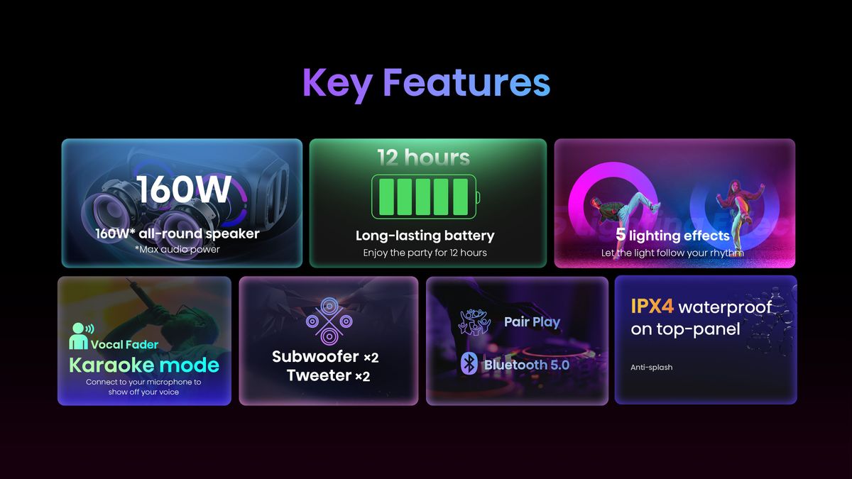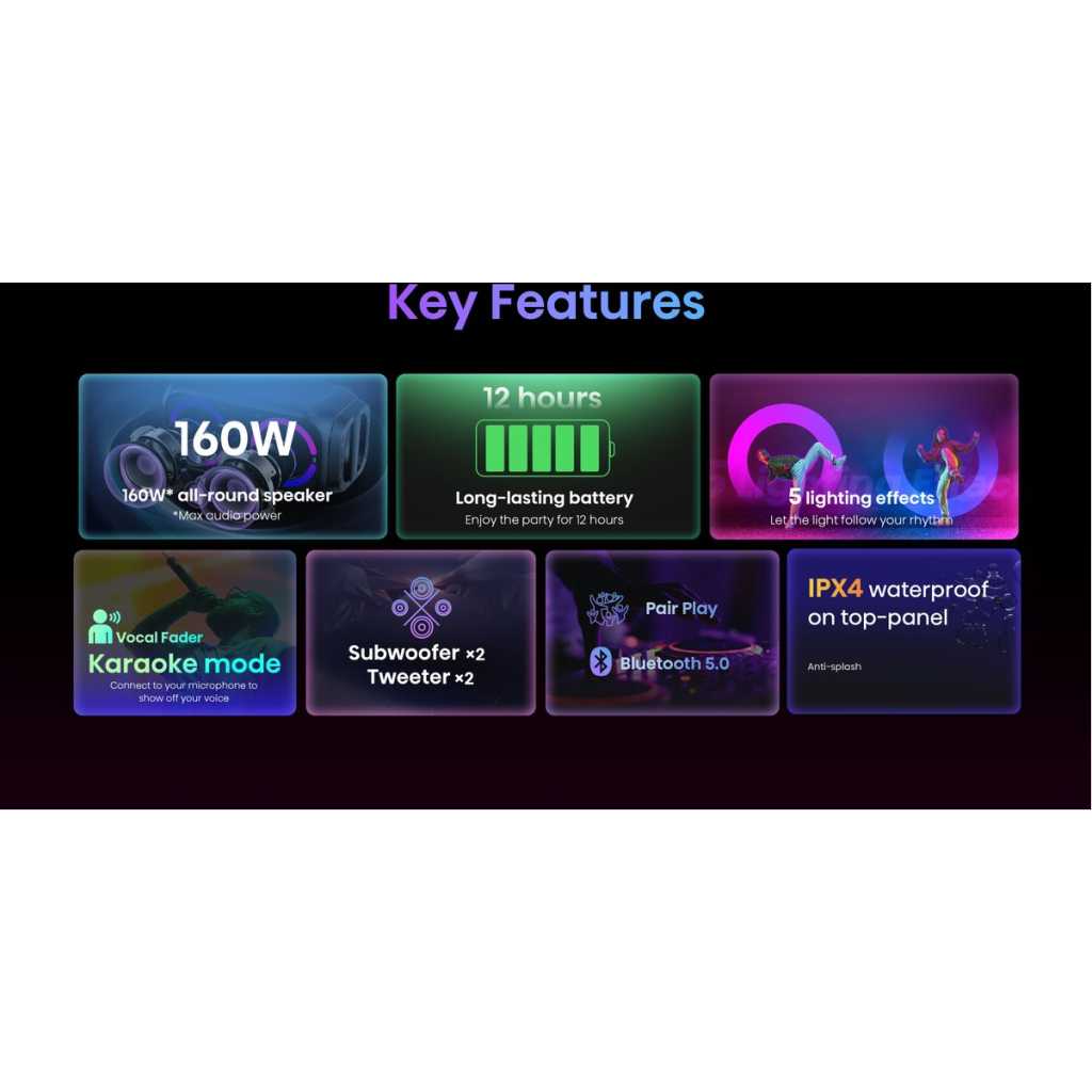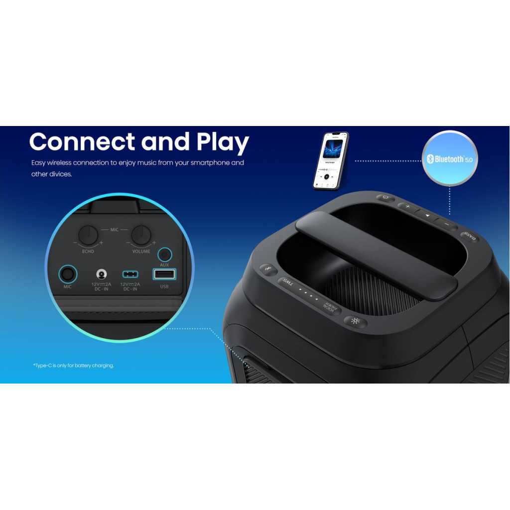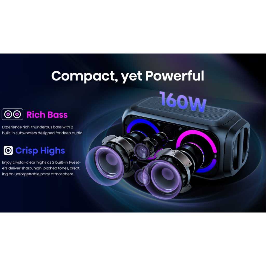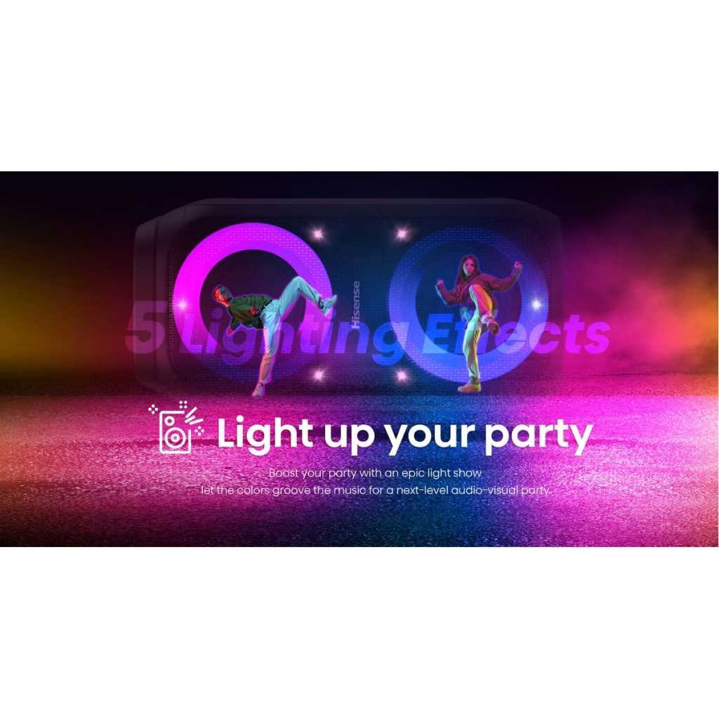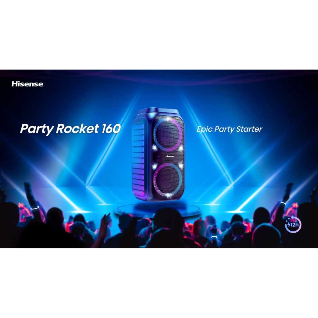 Hisense Party Roker 160 Speaker Power Output : 160 Watts of rich, loud, and dynamic sound Speaker Type : Portable party speaker with built-in carry handles Ideal for indoor and outdoor events, house parties, and karaoke nights Sound Quality : High-performance drivers deliver deep bass and crisp highs Built-in amplifier for an enhanced audio experience Lighting Effects : Multicolor LED lights that sync with your music Adds a vibrant party atmosphere to any space Connectivity Options : Bluetooth for wireless music streaming USB , AUX , and TF card slot for multiple input options FM Radio built-in for live listening Microphone Support : Includes mic input with echo control , perfect for karaoke Power & Battery : Rechargeable battery with long playtime AC power support for non-stop use Design : Rugged and stylish build Easy to move, set up, and operate The Party Roker 160 is your ultimate portable party speaker . With 160W of powerful sound , Bluetooth streaming , and LED light effects , it’s designed to turn any gathering into a full-blown celebration. Whether it’s karaoke night, a birthday bash, or a beach party—this speaker brings the bass, lights, and energy ! Key Features: Hisense 160W Party Rocker 160 True Wireless Stereo Bluetooth Speaker – Black. Power Output : 160W Speaker Type : Portable Bluetooth Party Speaker Lighting : Dynamic LED Party Lights Connectivity : Bluetooth, USB, AUX, TF Card, FM Radio Microphone Support : Yes (with echo control) Battery : Rechargeable for hours of playtime Best For : Parties, events, karaoke, and outdoor fun
