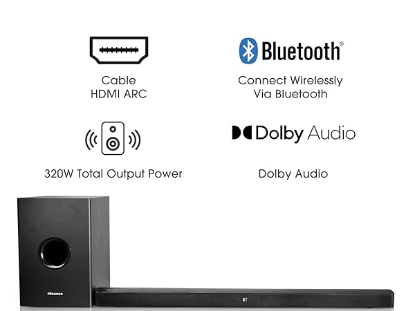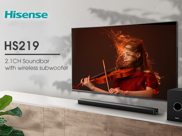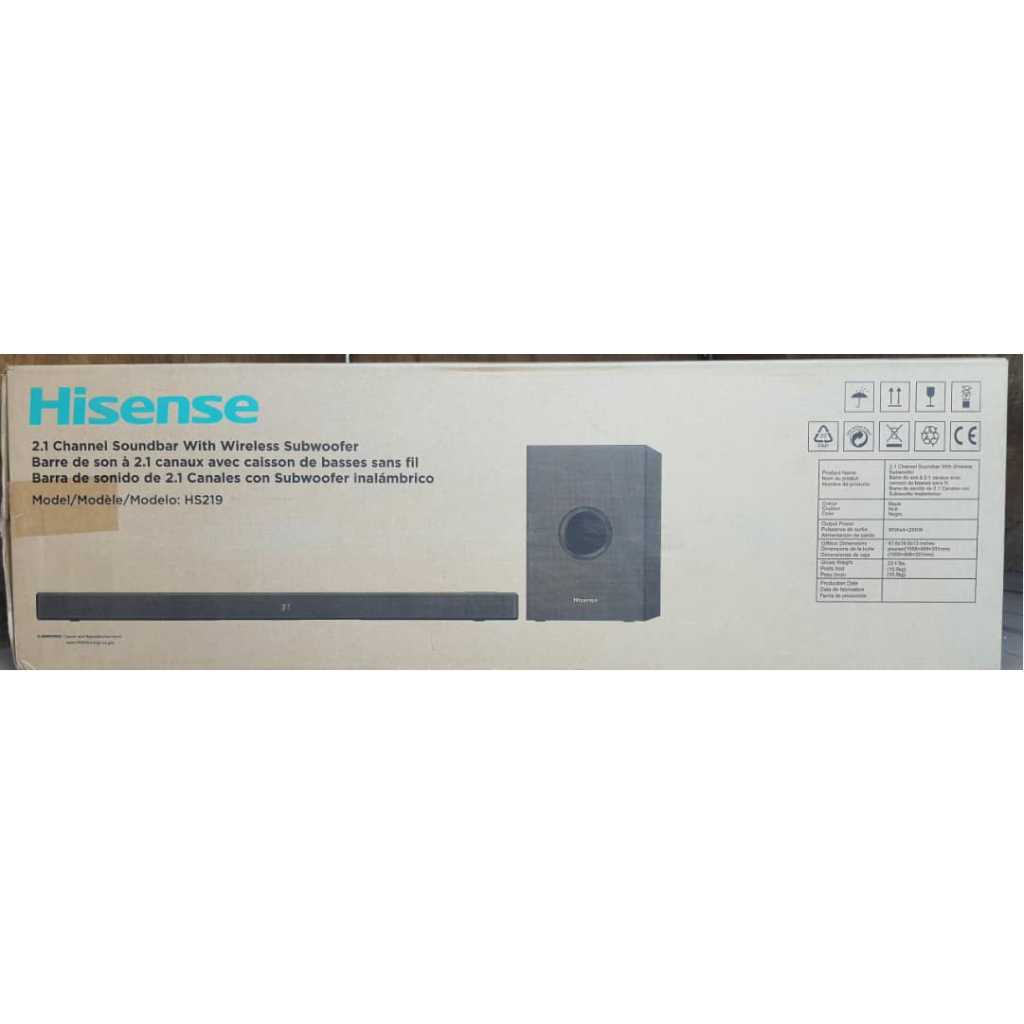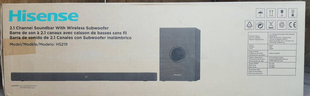 Key Features: Hisense 2.1 Channel Sound Bar HS219 With Wireless Subwoofer, HDMI, UDB, AUX, Optical, Bluetooth, Dolby Digital, Bass Enjoy Better TV Sound: Easy to place and connect to your TV, the Hisense HS219 soundbar significantly improves your TV entertainment experience and is perfect for TVs 32 inches or larger. Instead of just hearing the scene, you’re transported into it. Easy Connectivity: With HDMI (ARC), the Hisense HS219 can connect to your TV through a single HDMI cable (included), connect wirelessly via Bluetooth, and control both with one remote. You’ll be enjoying better TV sound in minutes. Wireless Subwoofer: A dedicated, 200 Watts wireless subwoofer delivers the robust low-end frequencies that punctuate your favorite movies, music, and games, without any messy wires. You’ll feel the “boom” while the two front-facing speakers project bright, clear high- and mid-range frequencies. One Remote Control: The HS219 can be controlled with a Hisense TV remote. Consolidation of remotes makes turning power on/off on both devices and changing the volume simple and easy. Quick Touch EQ Modes: Get the best audio performance from music, movie, news, night, and sport with a simple touch of the remote with multiple preset EQ settings. Accessories included: Everything you need to get started. We’ve included an HDMI cable, optical cable, and a wall mounting kit to make sure that you have what you need to make the most of your Hisense audio experience right out of the box.