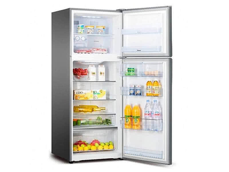 Hisense Double Door Refrigerator 295-litre gross capacity 10 Cubic Feet. Top mount freezer Smart electronic control Interior LED light for fridge compartment Input Voltage: 220-240V Multi-air flow system Humidity Control Silver in Colour 3-year warranty