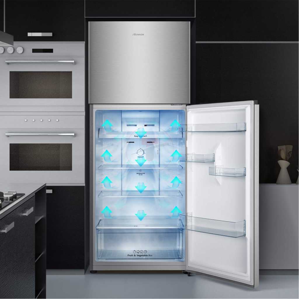 Hisense 599 Litre Fridge RT599N4ASU; Double Door Frost Free Top Mount Freezer Refrigerator – Silver. level, so the fridge maintains a constant temperature and food stays fresh.  Fast cooling saves With Super Cool you can cool food down quickly using the fridge’s highest cooling performance setting. This saves time the fridge needs to get down to the low temperature you want.  Always bright, easy on the eyes and energy consumption The LED lighting employed is designed to cover more area, and to go deeper into the fridge, which makes things easier to see on every level. And it’s brighter, but never harsh or too bright, so you easily find whatever you’re looking for. Key Features: Hisense 599 Litre Fridge RT599N4ASU; Double Door Frost Free Top Mount Freezer Refrigerator – Silver. Hisense 599 Liter Refrigerator Double Door Top Mount Silver Model RT599N4ASU Thanks to the even distribution of cold air achieved by the smart multi air flow system, optimal temperature is consistently maintained throughout your fridge freezer Super freeze rapidly lowers the freezer temperature to -24ºc, freezing your food much faster than usual. Preserve your food’s natural taste, texture, vitamins and minerals with a only a touch of button Modern inverter compressors measure the conditions inside your fridge and adjust the cooling output accordingly, to ensure a stable temperature, save energy and run quieter This user-friendly control enables you to easily set the temperature inside the fridge or freezer according to your food need. It‘s super clear, easy to reach, and simple to use There’s plenty of space in the fridge and freezer to store any shape or type of food. The doors can be opened out wide, so you can see everything at a glance With total no frost technology, there is no ice build-up in the appliance, making defrosting a thing of the past. It will also keep your food fresh and nutritious for a longer time Product dimensions ( l x w x h ) 70 x 69 x 185 cm 75k