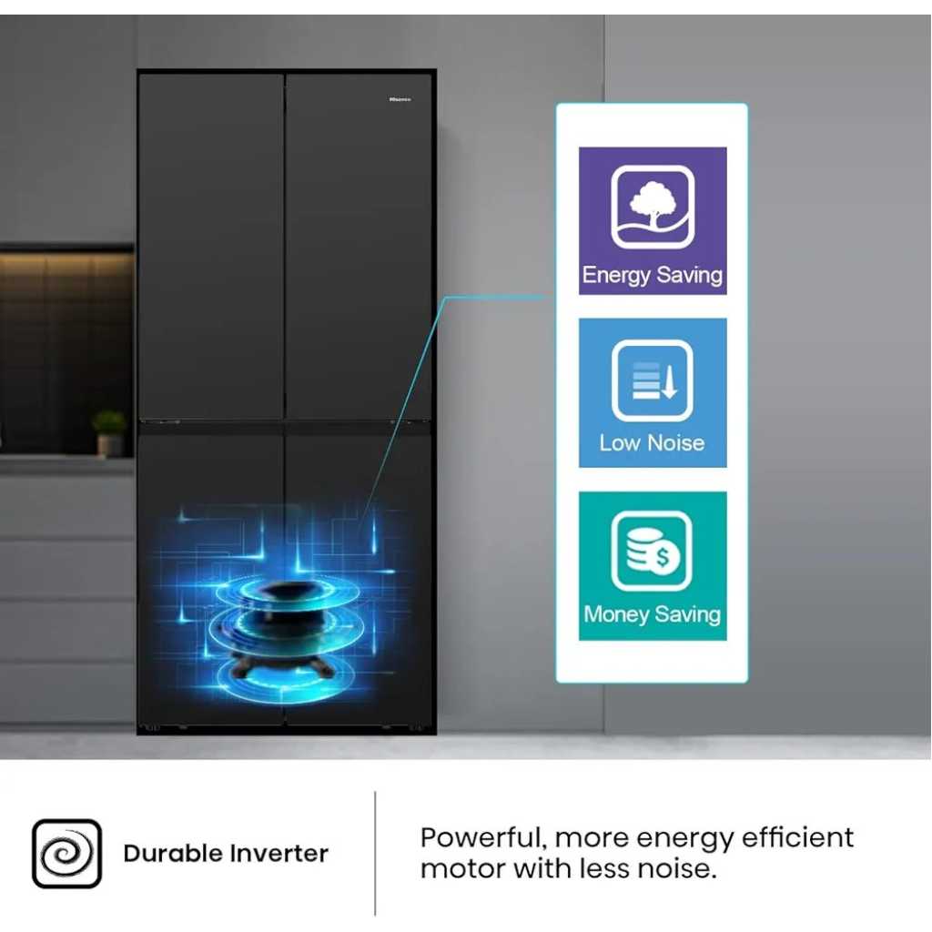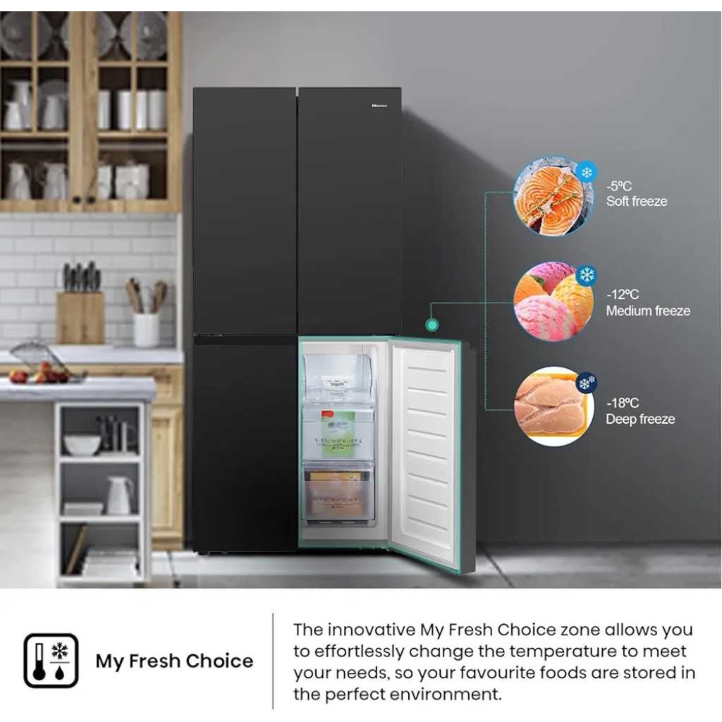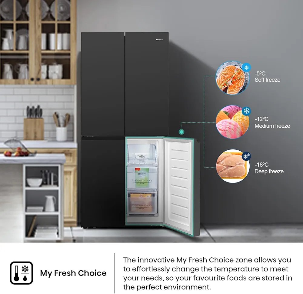 Hisense 610 – Litres Multi Door Frost Free Fridge – Black Glass Finish Hisense 610L 4 Door Glass Black Finish Refrigerator – Black This impressive American style multi door fridge freezer is abundant in space, as well as style and functionality. With its 4 large doors it offers you complete flexibility, no matter the size of your family. Controlled by the integrated LED display with Touch Electronic Control, The Triple Zone Cooling with My Fresh Choice, super cool and super freeze functions and Multi-Function Pantry allow you to tailor the way you chill or freeze your food, depending on your needs. Choose how you chill your food. With a dedicated pantry drawer, this is an ideal area to store all your deli foods. Inverter technology for energy savings and a longer lasting appliance.