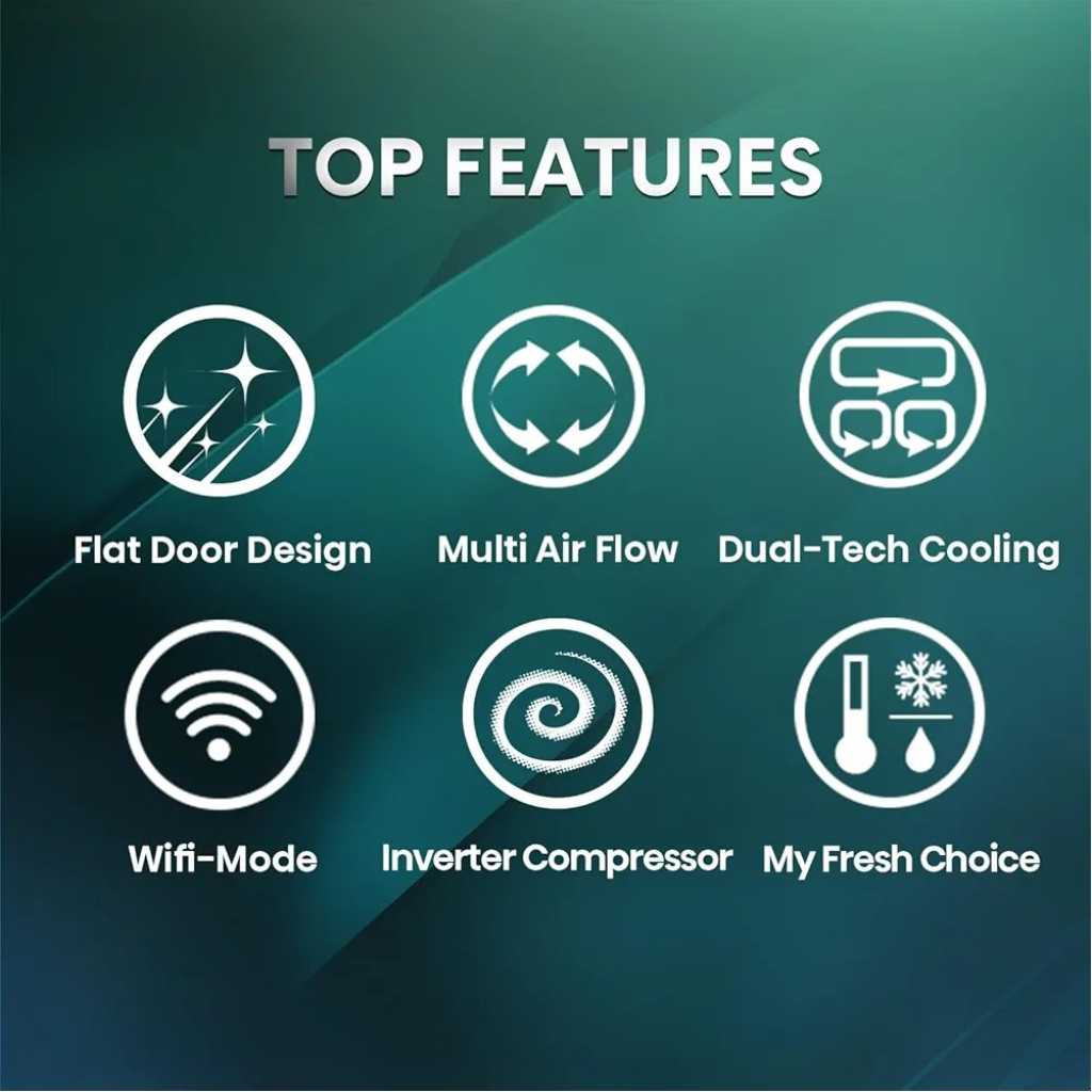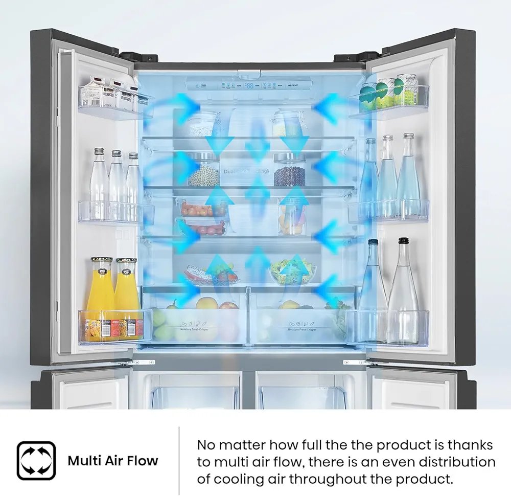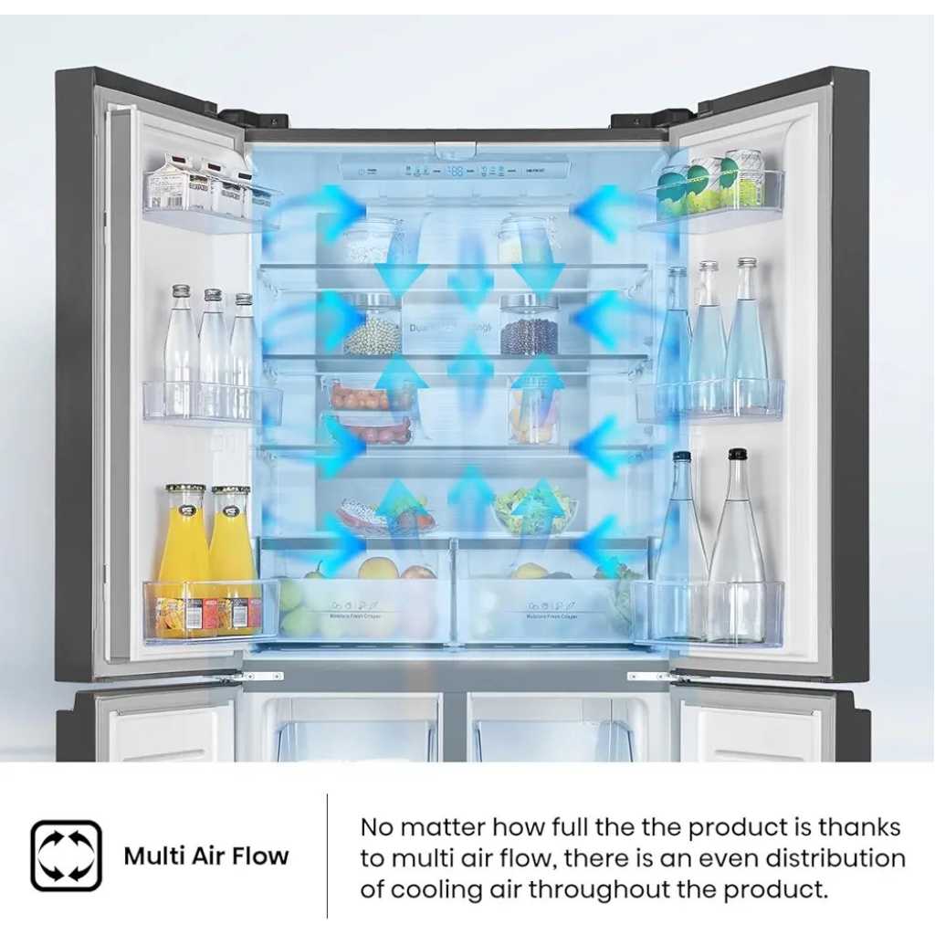 Key Features: Hisense 610 – Litres Multi Door Frost Free Fridge – Black Glass Finish Total No Frost Multi Air Flow System Touch Electronic Control Fashionable Handle Design Water Dispenser Folded Coke Rack Modern Decoration Inside LED Lighting Super Cool Function Super Freeze Function Alarm Function