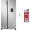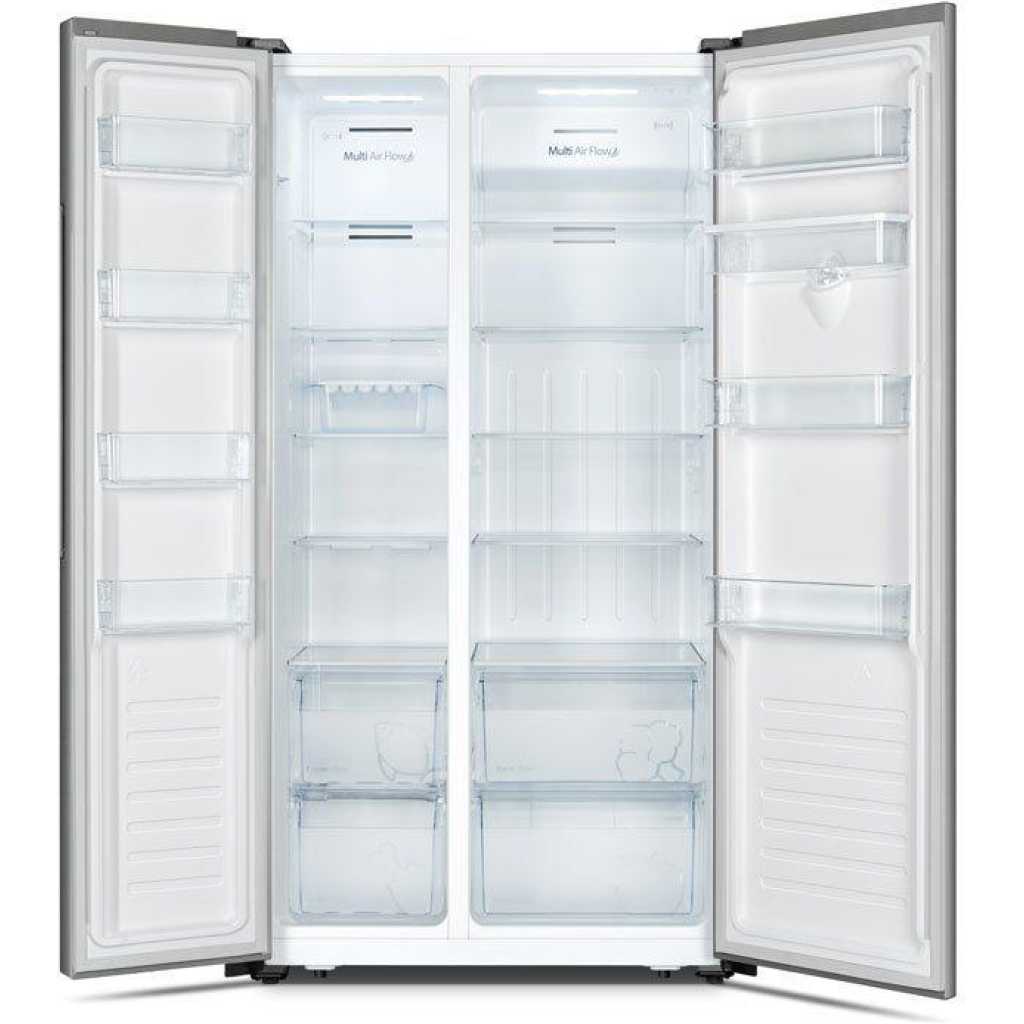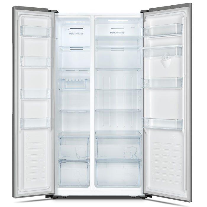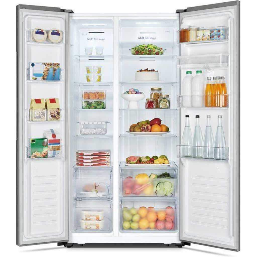 Key Features: Hisense 750-liter Side-by-side Refrigerator with Dispenser Silver, Side By Side Refrigerator, Auto Defrost, Glass Door. Finish: Black Glass A+ energy efficiency class, energy saving Multi-air flow system, no frost Exterior LED digital display with touch control Multiple modes to suit different refrigeration needs, such as fast cooling, fast freezing, holiday, energy saving mode 2L Water Tank Door opening alarm Twist ice maker, easy-to-make ice Broad climate design (N, ST) Long-life LED lights, saving energy Four-star freezer