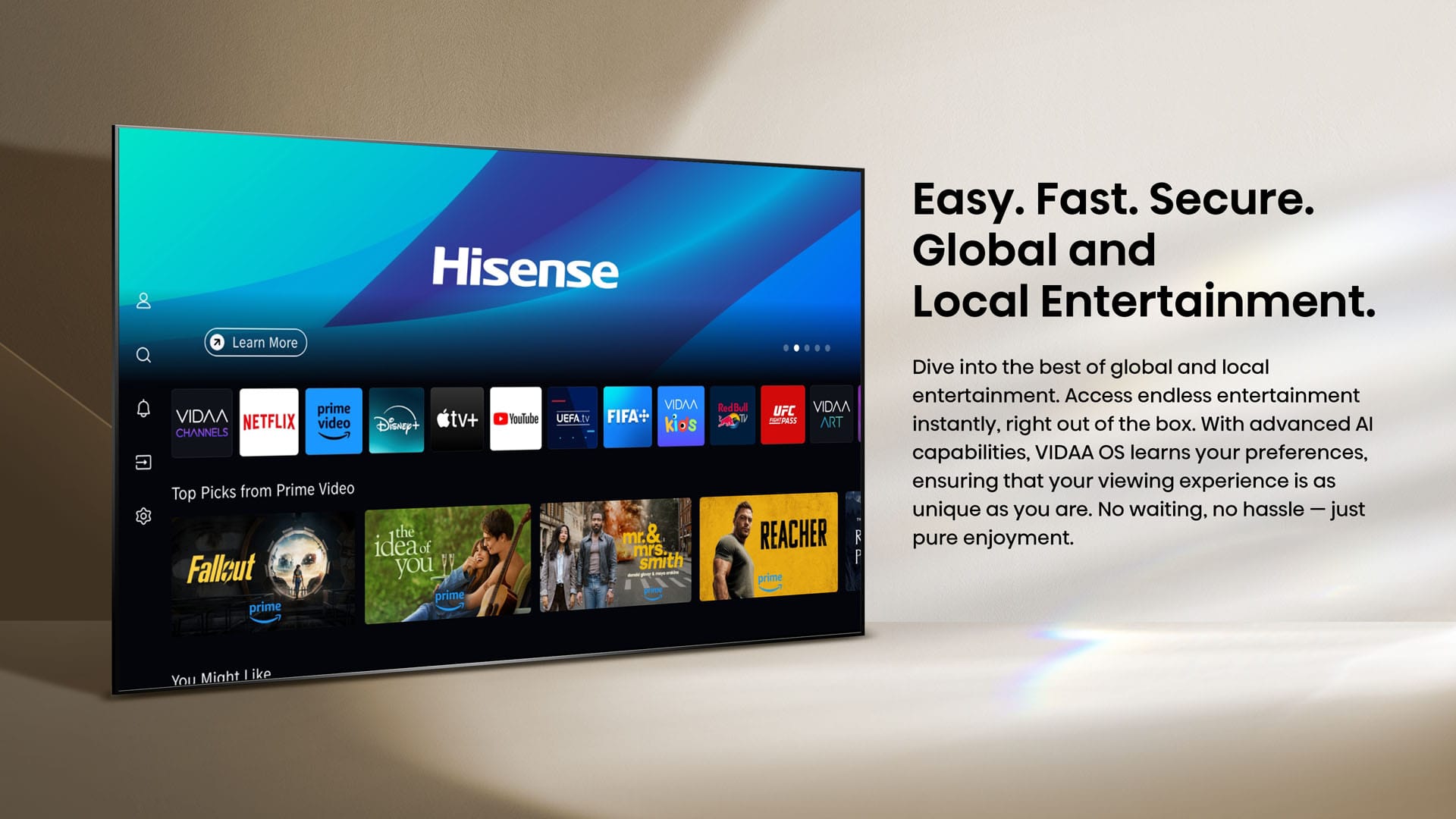 Hisense 85-inch QLED UHD 4K Smart TV (2025 Model), Q7 Series 85Q7Q, 144Hz Refresh Rate, VRR Game Mode Pro, AI Picture, AI Smooth Motion, Ultra Slim Design, VIDAA, Inbuilt Free To Air Receiver—Black. 144Hz VRR Game Mode PRO QLED Colour Dolby Vision.Atmos AI Picture AI Smooth Motion AMD FreeSync Premium Game Bar Filmmaker Mode Voice Control Key Features: Hisense 85-inch QLED UHD 4K Smart TV (2025 Model), Q7 Series 85Q7Q, 144Hz Refresh Rate, VRR Game Mode Pro, AI Picture, AI Smooth Motion, Ultra Slim Design, VIDAA, Inbuilt Free To Air Receiver—Black. 144Hz VRR Game Mode PRO QLED Colour Dolby Vision.Atmos AI Picture AI Smooth Motion AMD FreeSync Premium Game Bar Filmmaker Mode Voice Control Resolution: 4K Ultra HD (3840 x 2160) | QLED | Refresh Rate: 120 hertz Connectivity: 4 HDMI 2.1 (HDMI 3 eARC supported, HDMI 3 and HDMI 4 144Hz 4K ALLM VRR supported) | 2 USB ports (1 USB 3.0 and 1 USB 2.0) to connect hard drives and other USB devices | Built-in Dual Bands WiFi | Bluetooth 5.0 | 1 RJ45 connector | 1 headphone Jack | 1 Composite (AV) Inputs | 1 Audio (L/R) Input | 1 S/PDIF Output Sound: 2.1 Channel | 61W Speakers Output(18W Speaker×2, 25W Subwoofer×1) | DTS X | Dolby Atoms | Dobly MS12 | Dobly AC-4 | NICAM/A2 Stereo Supported | User Equalizer | WiSA SoundSend Smart TV Features: VIDAA TV | Built-in VIDAA Voice Control | Built-in Amazon Alexa | Voice assistant via TV(Far field) and Remote | Screen Sharing | Airplay 2 | AI Picture Quality | Sleep Timer | Media Player | Supported Apps: Netflix, YouTube, Prime Video Display: Quantum Dot Technology | Wide Color Gamut | 8 Bit + FRC Color Depth | 6000:1 Native Contrast Ratio | 400 nits Brightness | Local Dimming Technology with 96 Zones | Dolby Vision | HDR 10+ | HDR10+ Adpative | Dobly Vision IQ | 4K HDR Immersive | Filmmaker mode | Hybrid Log Gamma (HLG) | 3D Digital Comb Filter | MPEG and Mosquito noise reduction | 4K upscaling Picture Quality Enhancement