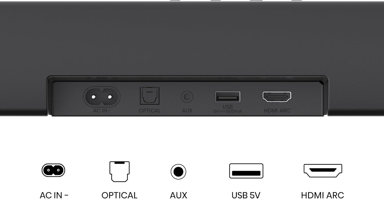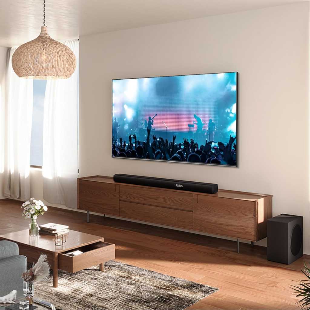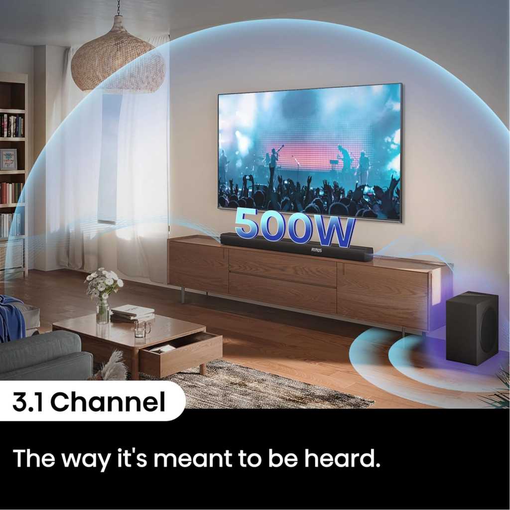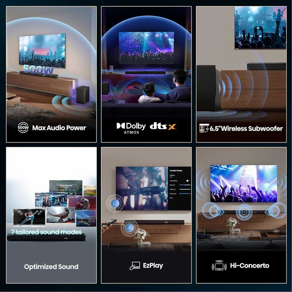 Total output power of 500W ensures clear sound quality even at high volumes, preventing distortion and maintaining audio clarity 3.1 channel setup provides a more immersive audio experience Wireless subwoofer allows for flexible placement and a clutter-free setup, enhancing sound quality without the hassle of running cables Bluetooth connectivity enables wireless streaming from various compatible devices Dolby Atmos compatibility enhances the audio experience by creating a three-dimensional soundstage, making you feel like you’re inside the action Dialogue enhancement improves clarity of spoken words, ensuring that dialogue stands out even in action-packed scenes or complex sound environments Support for Dolby Digital Plus allows for enhanced audio quality through better compression, resulting in richer sound, while PCM provides high-fidelity audio transmission for a clearer and more accurate listening experience Bluetooth 5.3, Roku TV Ready, HDMI/AUX/ARC/Optical/USB Key Features: Total output power of 500W ensures clear sound quality even at high volumes, preventing distortion and maintaining audio clarity 3.1 channel setup provides a more immersive audio experience Wireless subwoofer allows for flexible placement and a clutter-free setup, enhancing sound quality without the hassle of running cables Bluetooth connectivity enables wireless streaming from various compatible devices Dolby Atmos compatibility enhances the audio experience by creating a three-dimensional soundstage, making you feel like you’re inside the action Dialogue enhancement improves clarity of spoken words, ensuring that dialogue stands out even in action-packed scenes or complex sound environments Support for Dolby Digital Plus allows for enhanced audio quality through better compression, resulting in richer sound, while PCM provides high-fidelity audio transmission for a clearer and more accurate listening experience Bluetooth 5.3, Roku TV Ready, HDMI/AUX/ARC/Optical/USB
