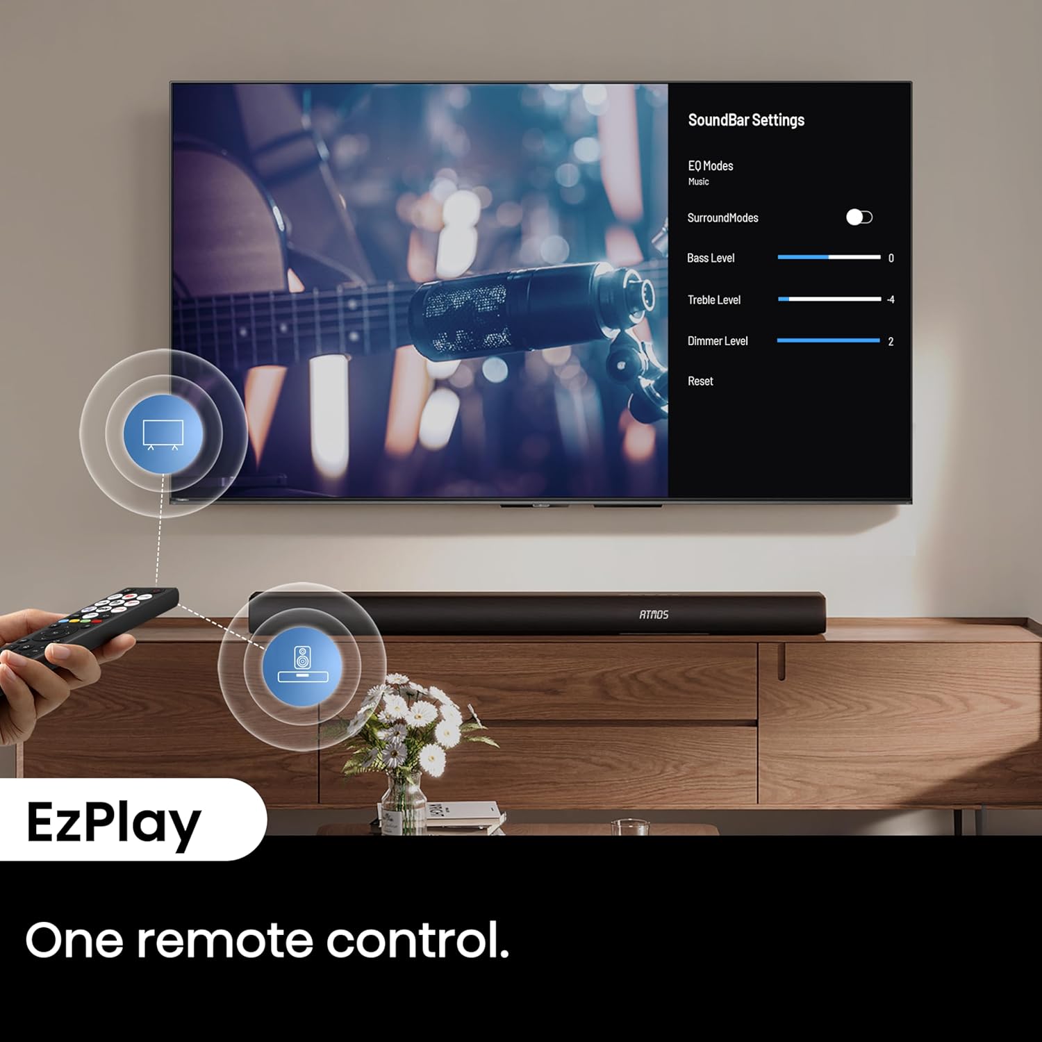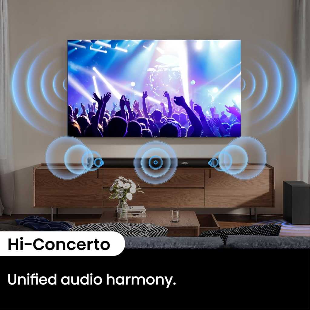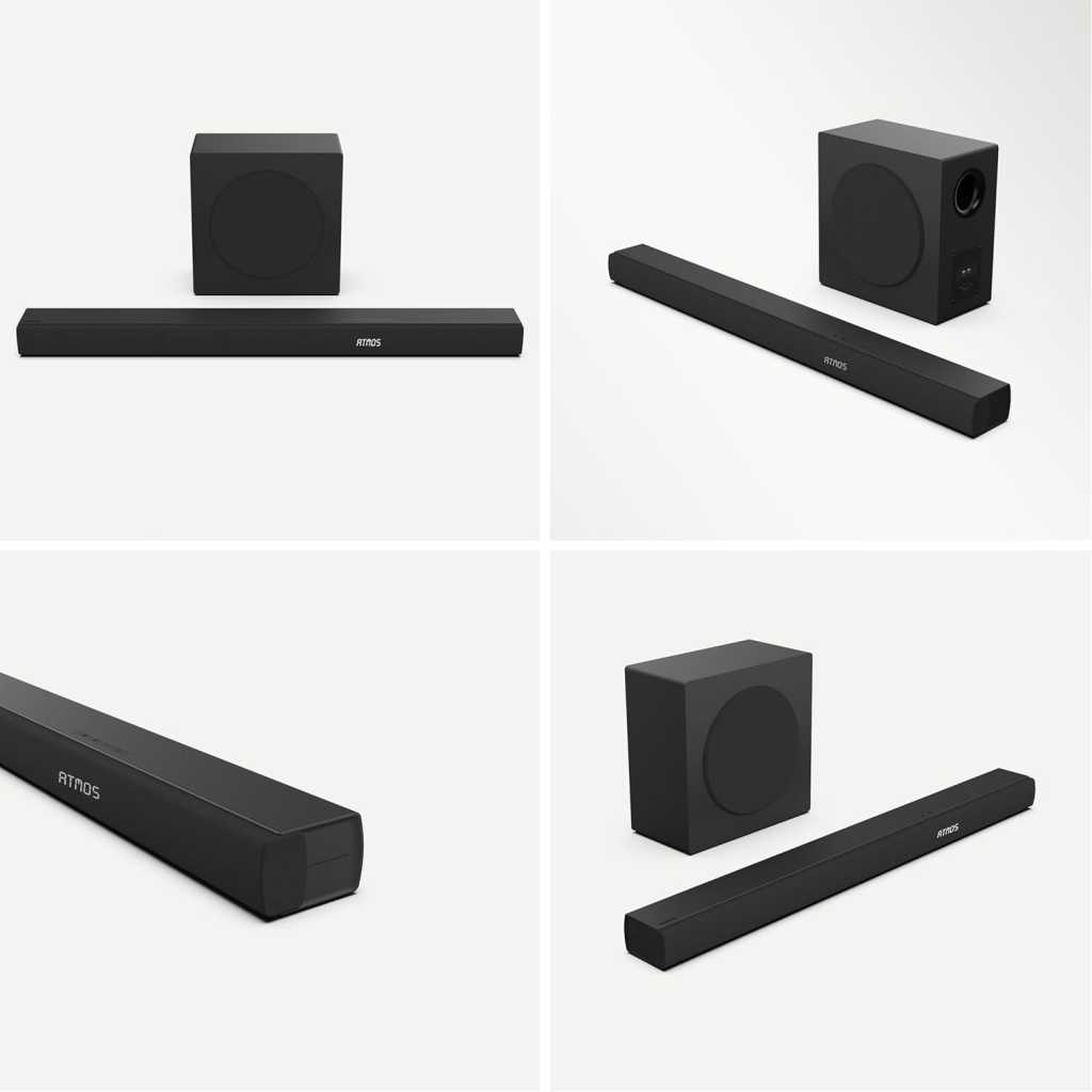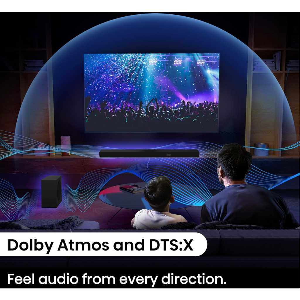 Total output power of 500W ensures clear sound quality even at high volumes, preventing distortion and maintaining audio clarity 3.1 channel setup provides a more immersive audio experience Wireless subwoofer allows for flexible placement and a clutter-free setup, enhancing sound quality without the hassle of running cables Bluetooth connectivity enables wireless streaming from various compatible devices Dolby Atmos compatibility enhances the audio experience by creating a three-dimensional soundstage, making you feel like you’re inside the action Dialogue enhancement improves clarity of spoken words, ensuring that dialogue stands out even in action-packed scenes or complex sound environments Support for Dolby Digital Plus allows for enhanced audio quality through better compression, resulting in richer sound, while PCM provides high-fidelity audio transmission for a clearer and more accurate listening experience Bluetooth 5.3, Roku TV Ready, HDMI/AUX/ARC/Optical/USB Key Features: Total output power of 500W ensures clear sound quality even at high volumes, preventing distortion and maintaining audio clarity 3.1 channel setup provides a more immersive audio experience Wireless subwoofer allows for flexible placement and a clutter-free setup, enhancing sound quality without the hassle of running cables Bluetooth connectivity enables wireless streaming from various compatible devices Dolby Atmos compatibility enhances the audio experience by creating a three-dimensional soundstage, making you feel like you’re inside the action Dialogue enhancement improves clarity of spoken words, ensuring that dialogue stands out even in action-packed scenes or complex sound environments Support for Dolby Digital Plus allows for enhanced audio quality through better compression, resulting in richer sound, while PCM provides high-fidelity audio transmission for a clearer and more accurate listening experience Bluetooth 5.3, Roku TV Ready, HDMI/AUX/ARC/Optical/USB