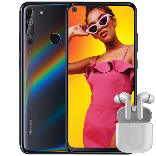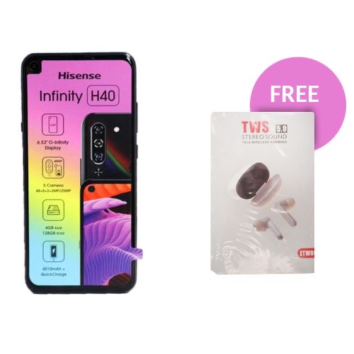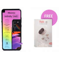 Hisense H40 Infinity – Smartphone 128GB HDD, 4GB RAM – Black + Free TWS 5.0 H40 Infinity – Smartphone 128GB HDD, 4GB RAM – Black + Free TWS 5.0 Stereo Sound True Wireless Earbuds Hisense introduced their entry-level smartphone, the Hisense Infinity H40. The H40 Infinity comes with Google’s Android Go edition installed for smooth usability and minimal usage of the smartphone’s resources. Starting with 4GB of RAM and 128GB of local storage, up to an additional 128GB of storage space can be added with the inclusion of a MicroSD card. Both the main and front-facing cameras are dual 8MP and 2MP lenses with beauty shot capability. The large 6″ infinity display of the H40 Infinity returns your images and videos in HD+. Key Features: Hisense H40 Infinity – Smartphone 128GB HDD, 4GB RAM – Black + Free TWS 5.0 1.6GHz Octa Core Processor 8MP + 2MP Camera 6” Display 4GB RAM + 128GB ROM Dual Sim 3000 mAh Battery Android 9