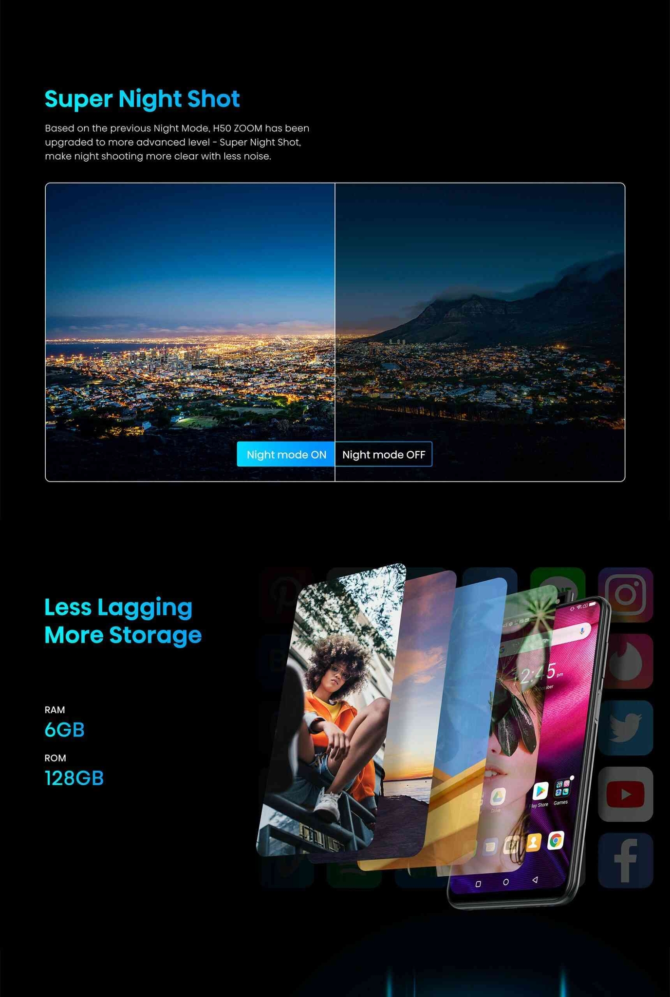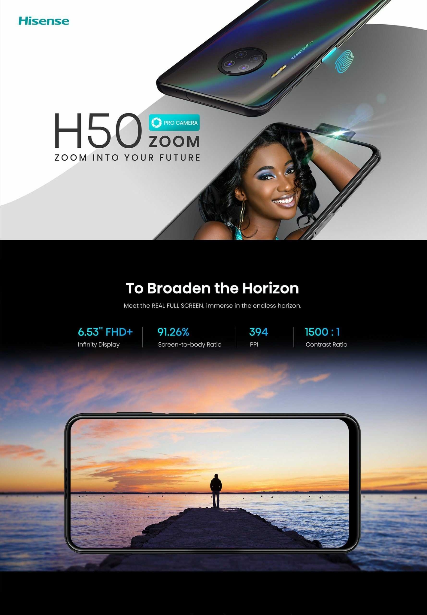 Hisense H50 Zoom 6.53″ 6GB RAM 128GB ROM 48MP 4020mAh – Black (1YR WRTY). Perfect smooth 3D radian , multilayer texture and colour scattering, with disc-shaped camera module design, elegant and vogue. An integrated side-placement power button with a fingerprint sensor, unlock your phone with a single touch instantly. Selfies, as a ubiquitous way to capture memorable moments. Portrait mode is an excellent option for selfie lovers, with the front flash, to take clear and perfect selfies even in low light environment. Open the beauty mode – H50 Zoom will analyse the shape of your face intelligently, enhancing your features for optimal beauty. Enhances image resolution with multiple images. With multiple-frame super resolution, drastically improve the digital zoom quality. Based on the previous night mode. H50 ZOOM has been upgraded to more advanced level – Super Night Shot, make night shooting more clear with less noise. 4G LTE 6,53” Infinity Display 48MP + 8MP + 2MP + 2MP Quad Rear Camera; 16MP Front camera 6GB RAM + 128GB storage 4020mAh battery Octa-core 2.1GHz Pop-up camera Key Features: Hisense H50 Zoom 6.53″ 6GB RAM 128GB ROM 48MP 4020mAh – Black (1YR WRTY). 4G LTE 6,53” Infinity Display 48MP + 8MP + 2MP + 2MP Quad Rear Camera; 16MP Front camera 6GB RAM + 128GB storage 4020mAh battery Octa-core 2.1GHz Pop-up camera